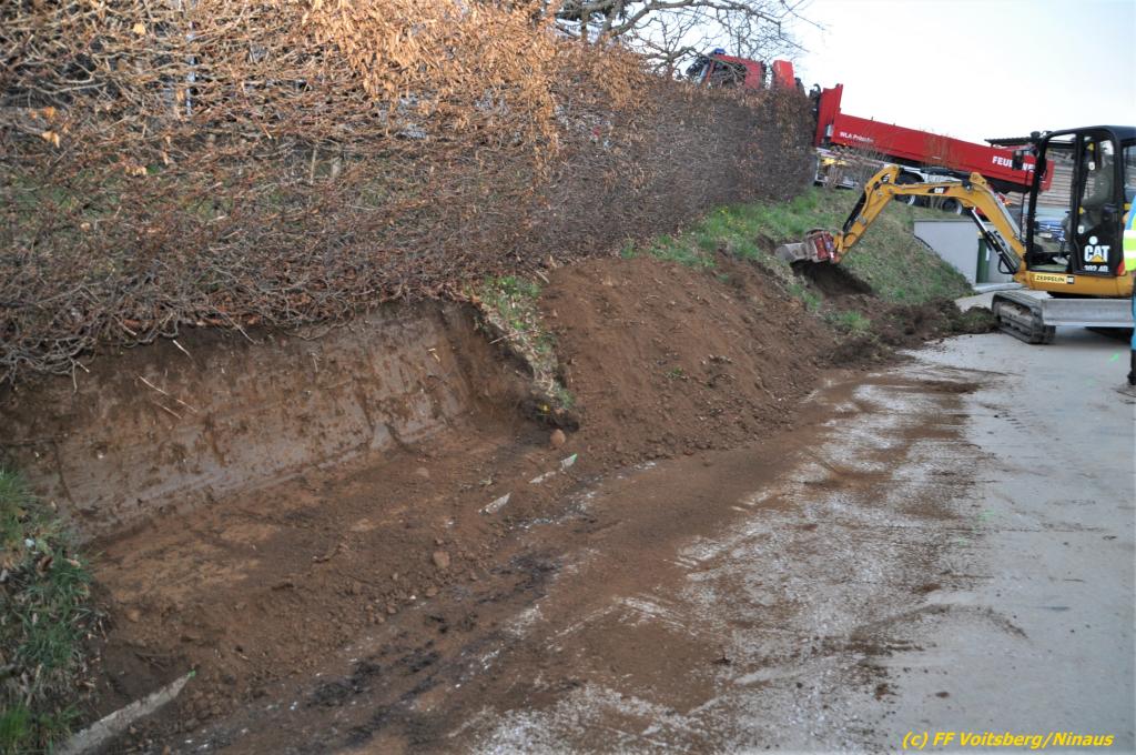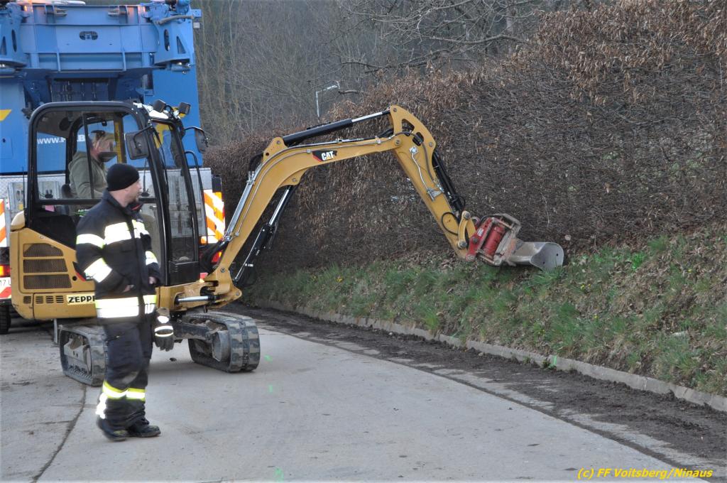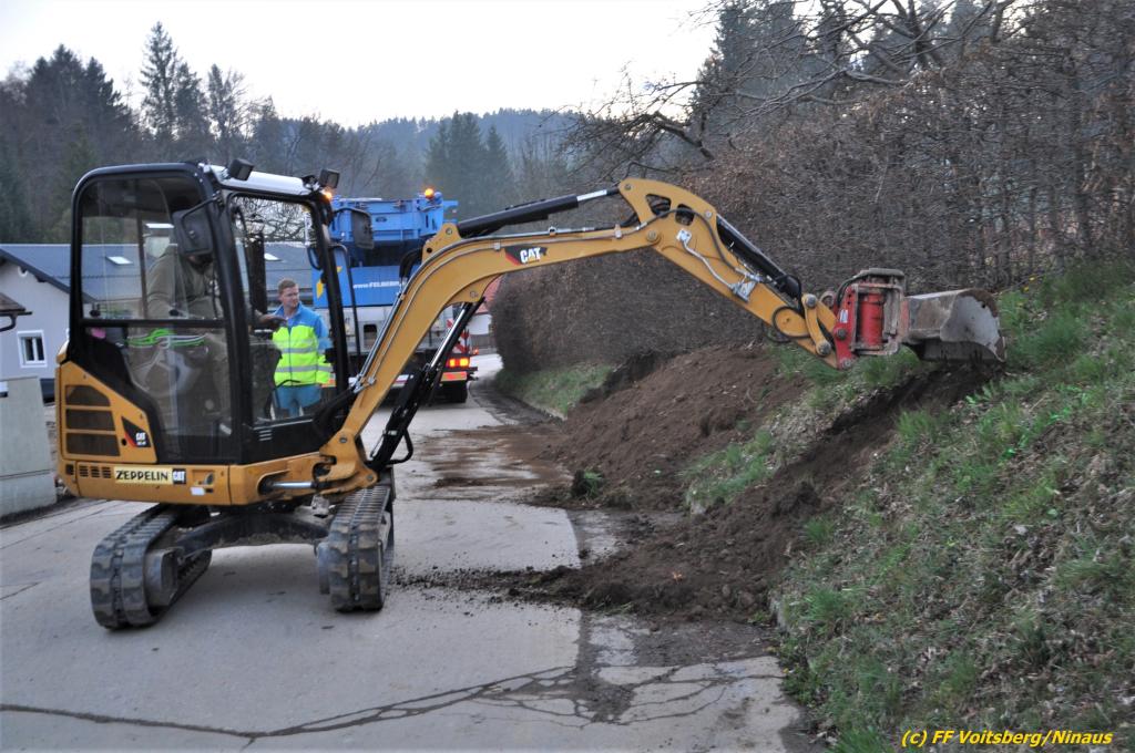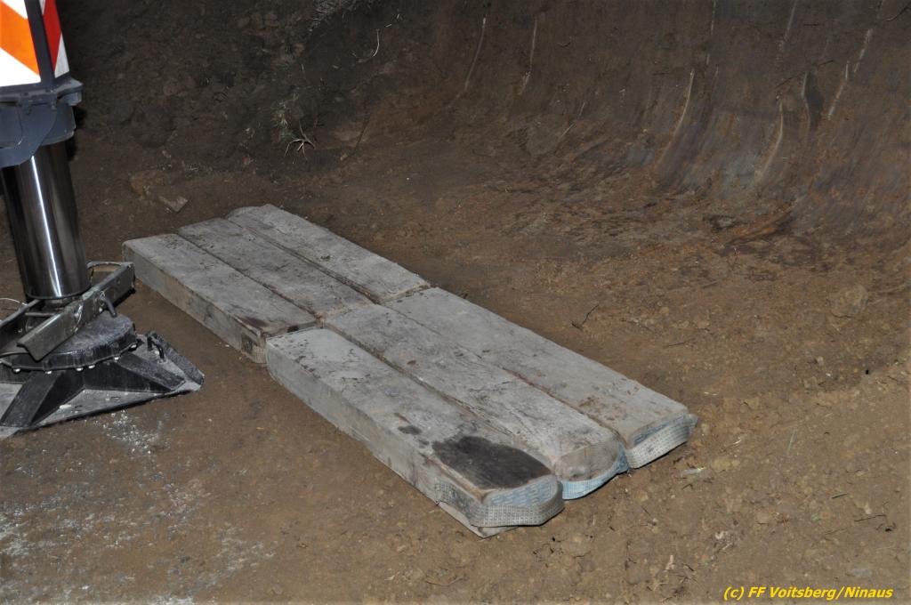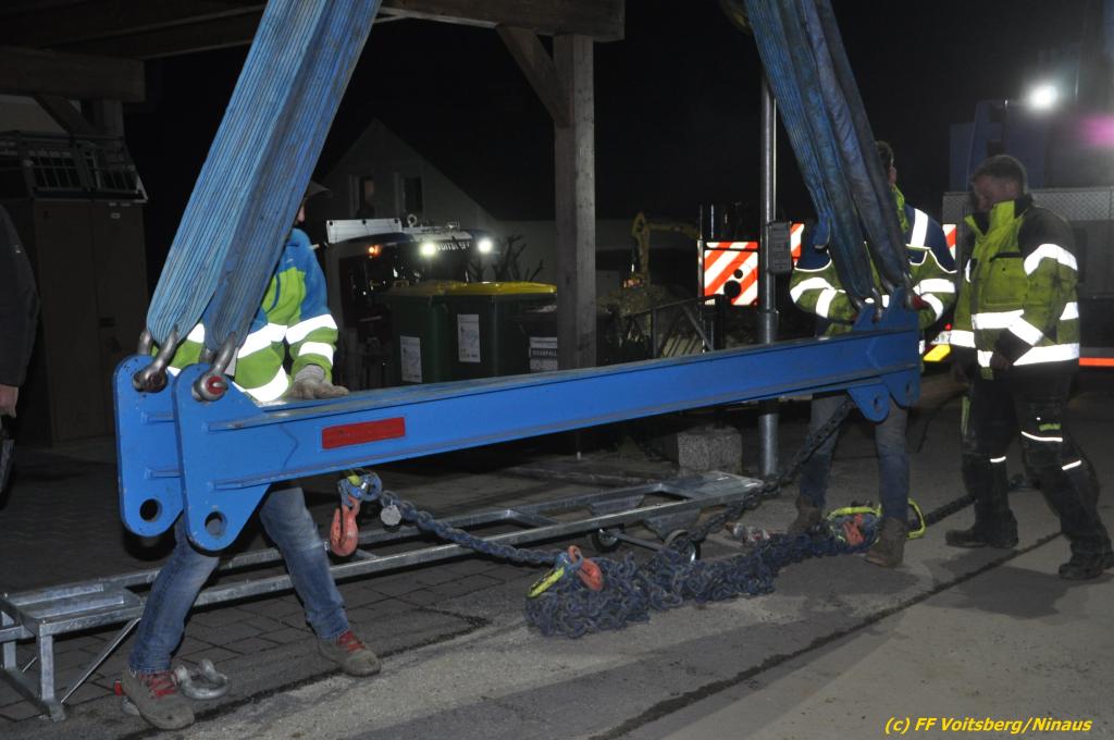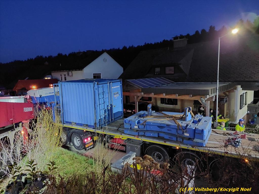 Nach umfangreichen Vorbereitungsarbeiten durch die Fachfirma mit Unterstützung der FF Voitsberg wurde das 35t schwere Fahrzeug unter Mithilfe der Seilwinde des WLF Voitsberg und den Pumpwagen sicher auf die Privatstrasse gehoben und konnte die Fahrt auf eigener Achse fortsetzen.