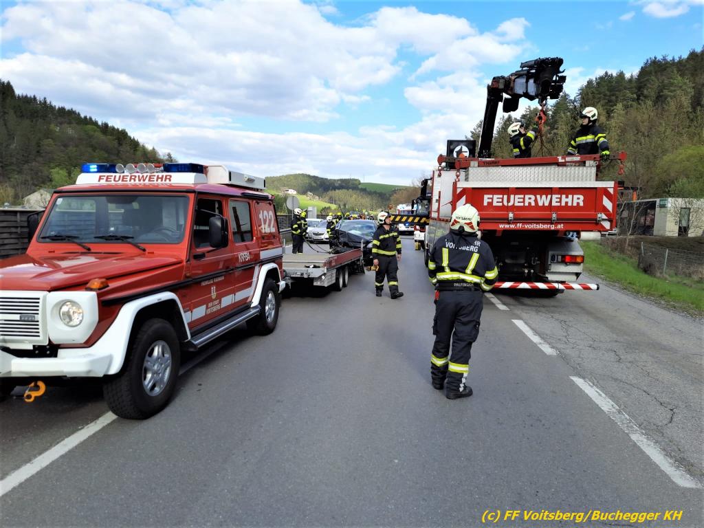 Die Freiwilligen Feuerwehren Krems und Voitsberg wurden am Donnerstag, den 28.04.2022 um 16:35 Uhr zu einem schweren Verkehrsunfall mit 3 Fahrzeugen und einer eingeklemmten Person auf der B70 Umfahrung Voitsberg Höhe der Tankstelle alarmiert. Am Einsatzort stellte sich heraus, dass sich keine Person mehr im Fahrzeug befand.