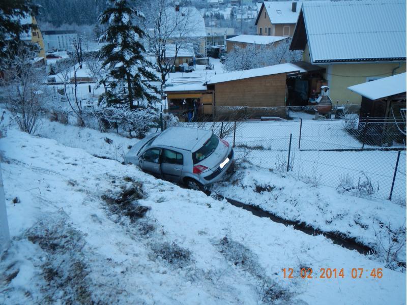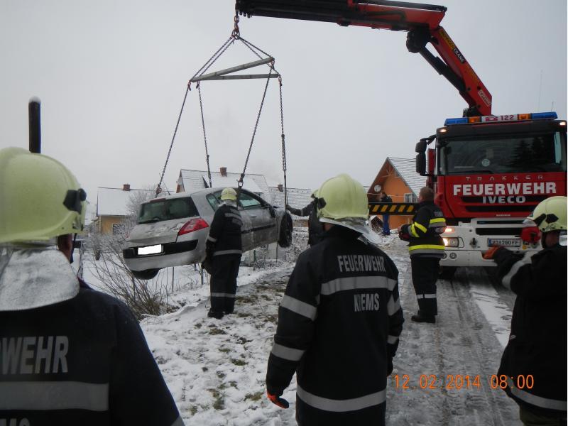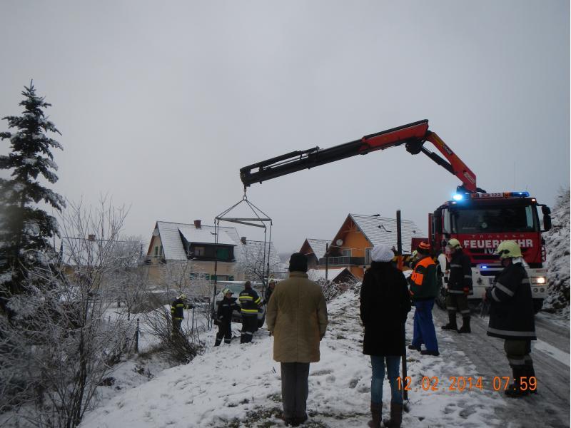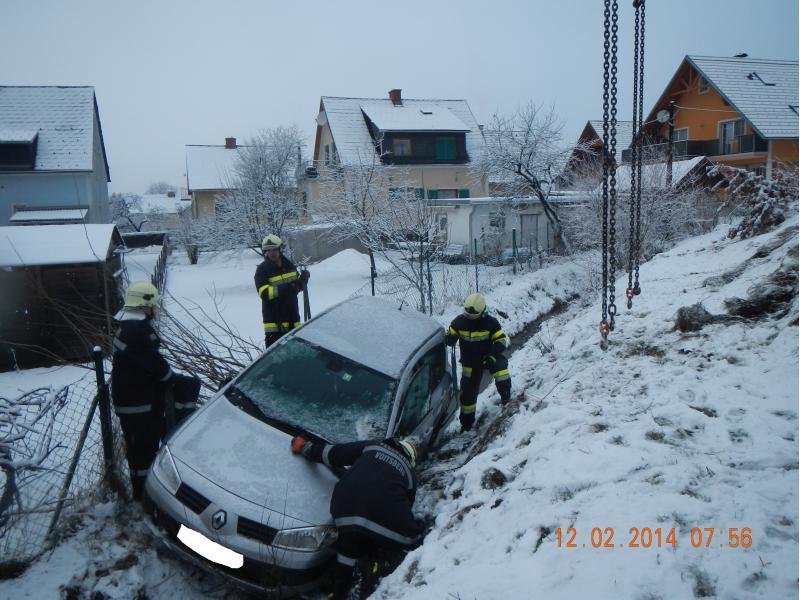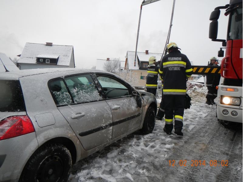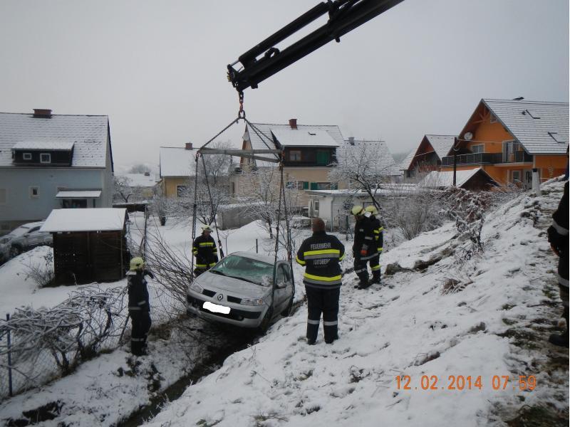 VOITSBERG, am 12.02.2014 Auf schneeglatter Fahrbahn kam ein PKW von der Straße ab und rutschte über eine Böschung. Über Anforderung der FF Krems wurde das Fahrzeug mit dem WLF-Kran unter Zusammenarbeit beider Wehren geborgen.
