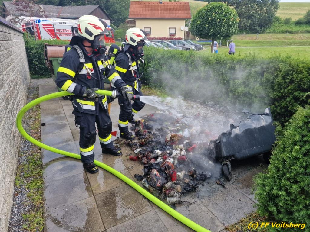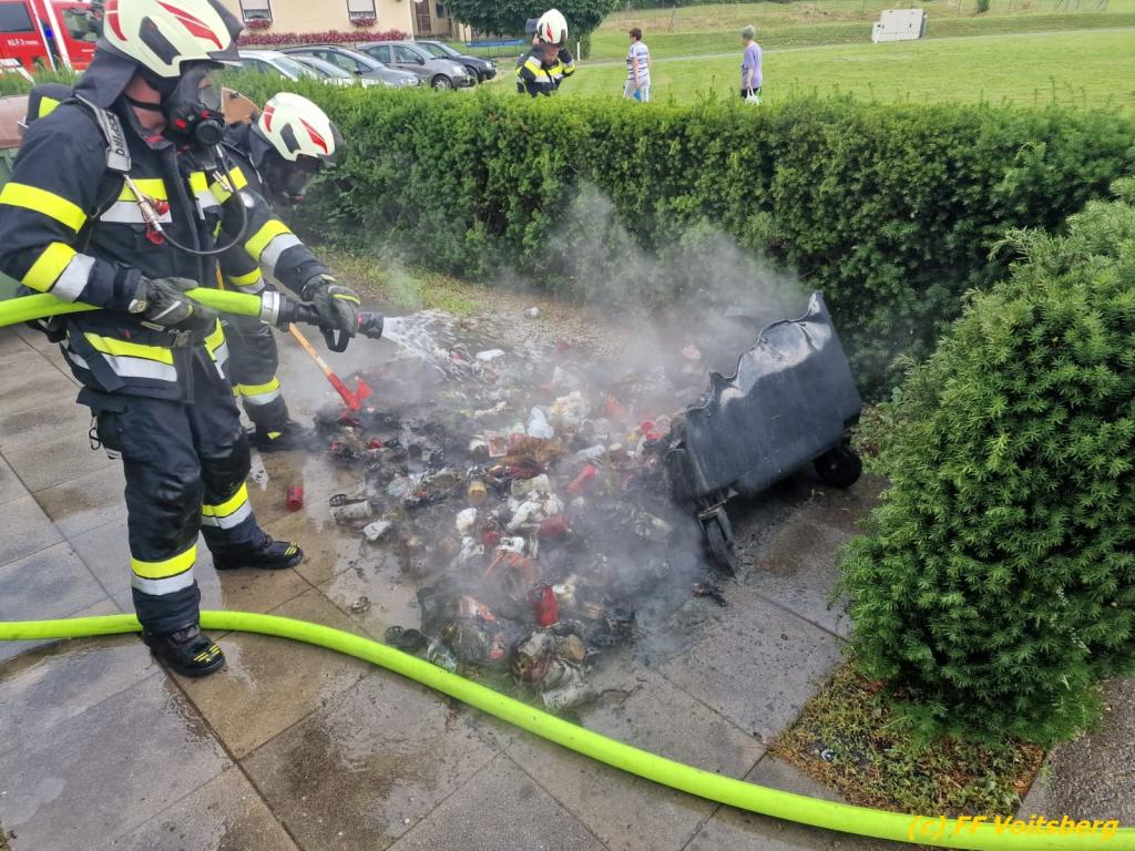 Die alarmierte FF Voitsberg löschte unter schwerem Atemschutz den Restmüllcontainer, brachte danebenstehende unbeschädigte Container in Sicherheit und verhinderte daher einen größeren Schaden.