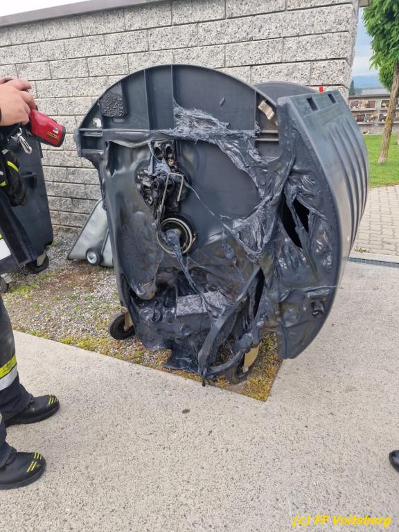 VOITSBERG, am 20.06.2022 Vermutlich durch eine unachtsam entsorgte Kerze geriet am Montag, 20. Juni 2022 kurz vor 18 Uhr am Voitsberger Friedhof ein Müllcontainer in Vollbrand und beschädigte einen zweiten danebenstehenden schwer.