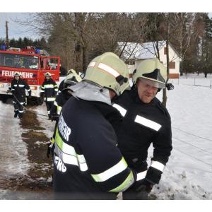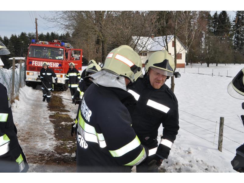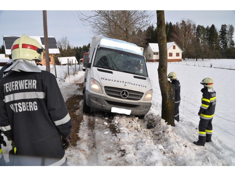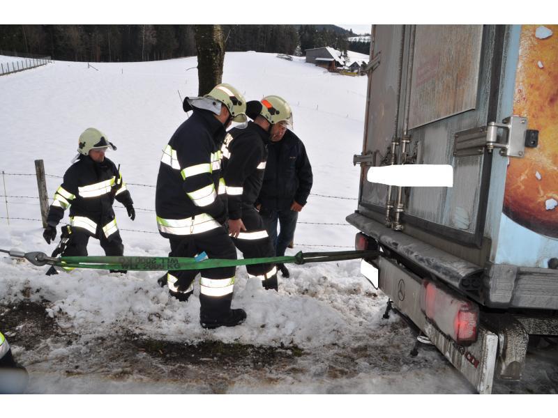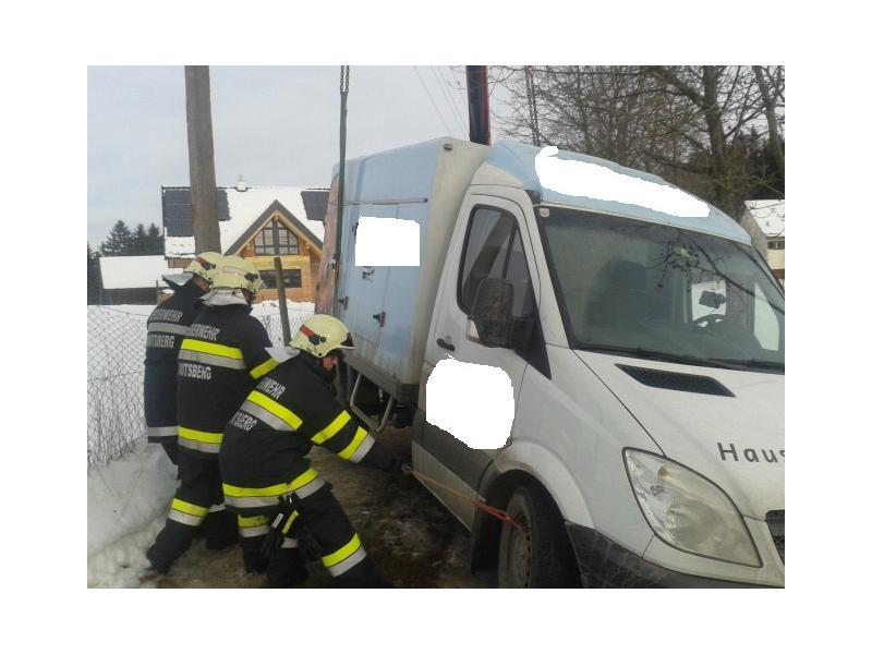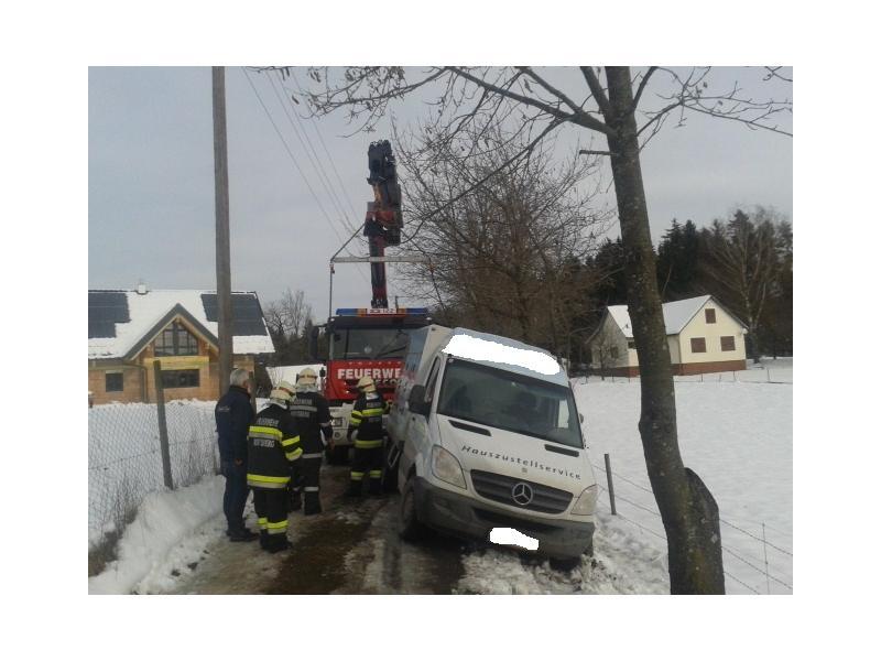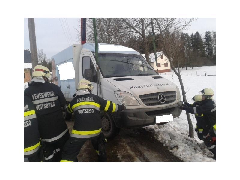 VOITSBERG, am 07.02.2014 Beim Zurückfahren auf einem Privatweg rutschte ein Klein-LKW eines Zustellservice von der Straße in einen Graben und drohte umzustürzen. Das Fahrzeug wurde mit dem WLF-Kran geborgen und setzte die Fahrt auf eigener Achse fort.