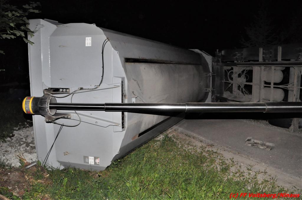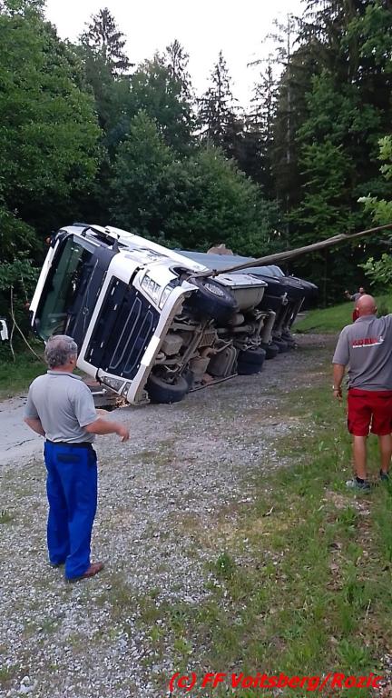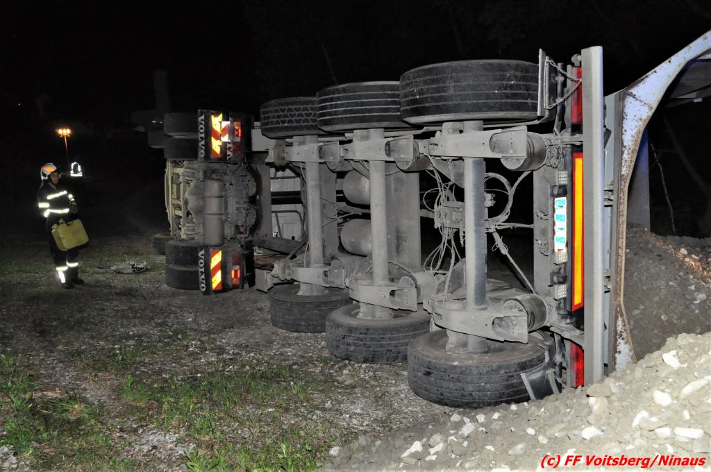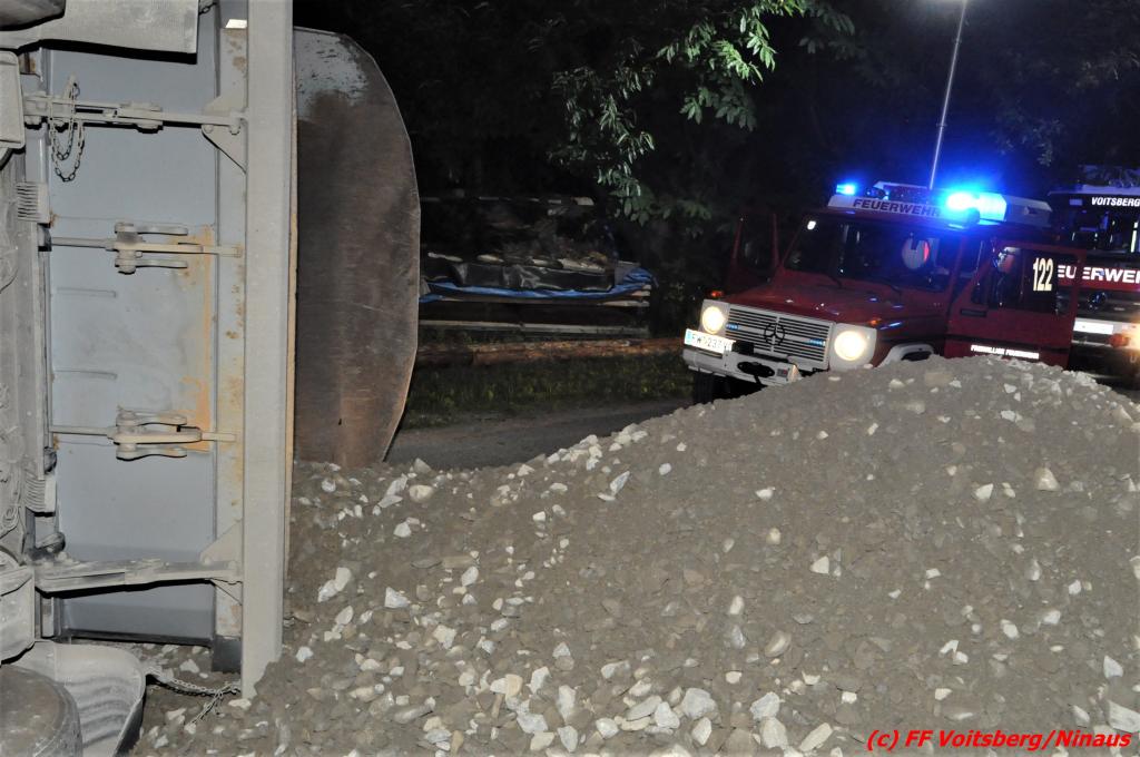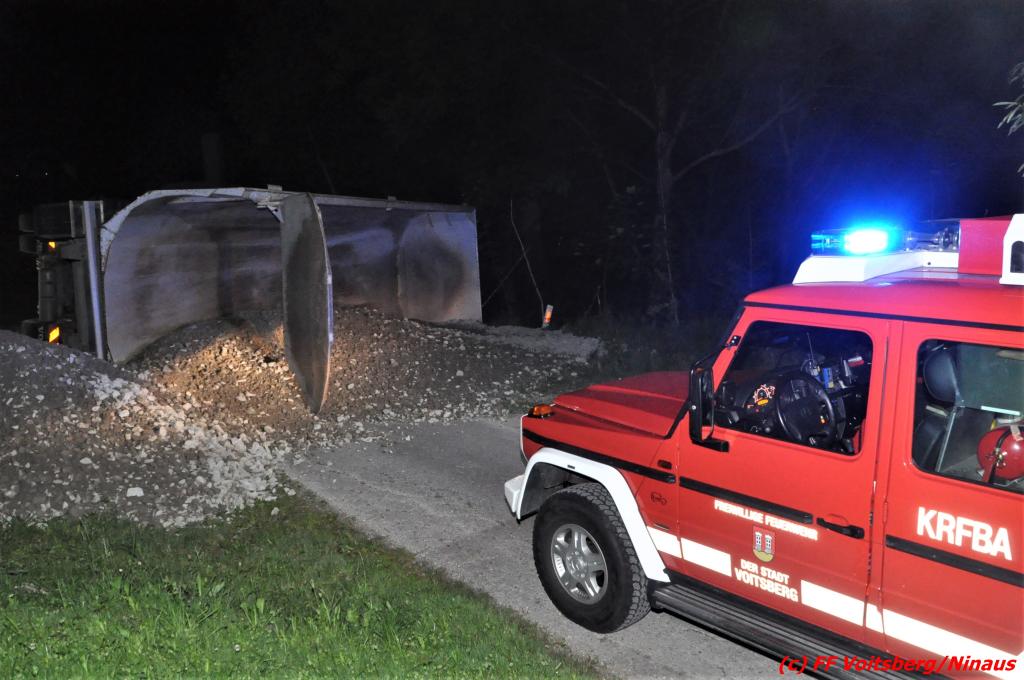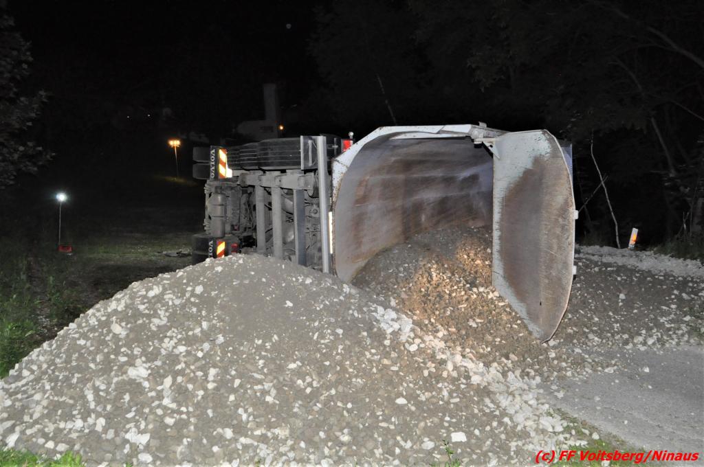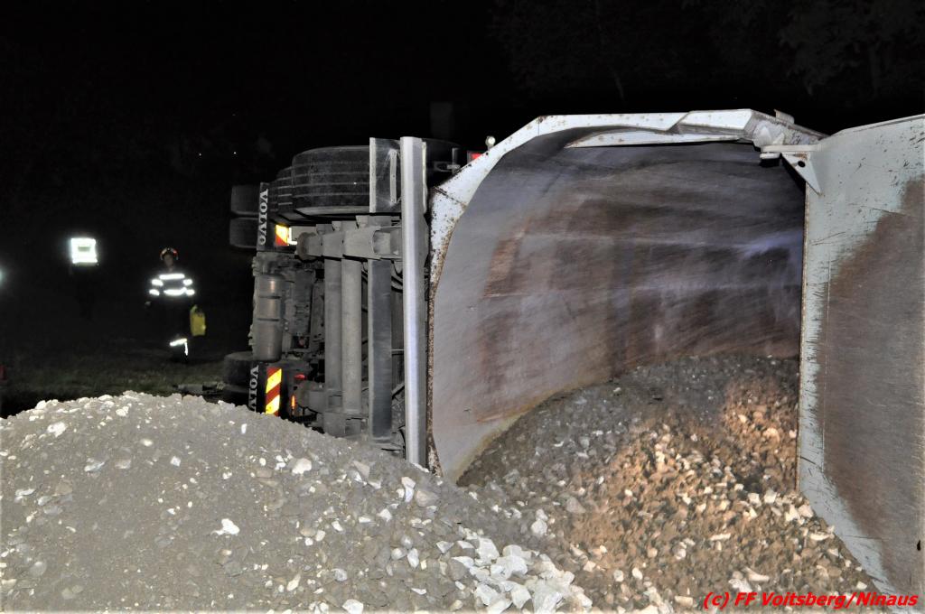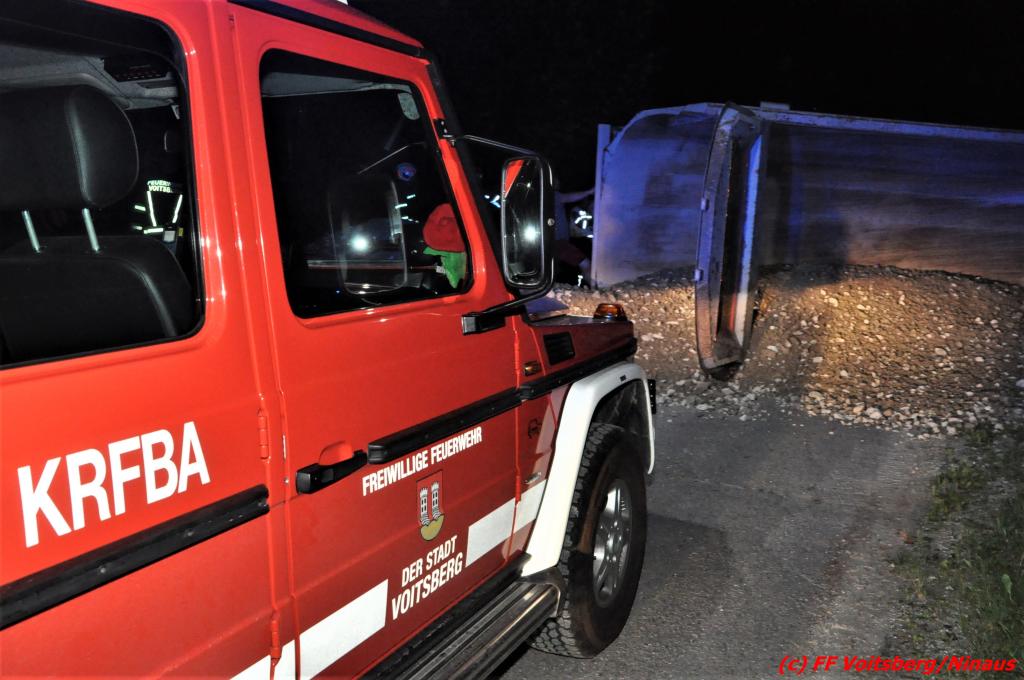 Der Unfall ereignete sich während des Entladens von Schotter, nachdem der aufgekippte Aufleger umstürzte und das Zugfahrzeug mitriss. Zwei anwesende Personen waren unmittelbar zur Stelle und retteten gemeinsam den Lenker durch die Dachluke.