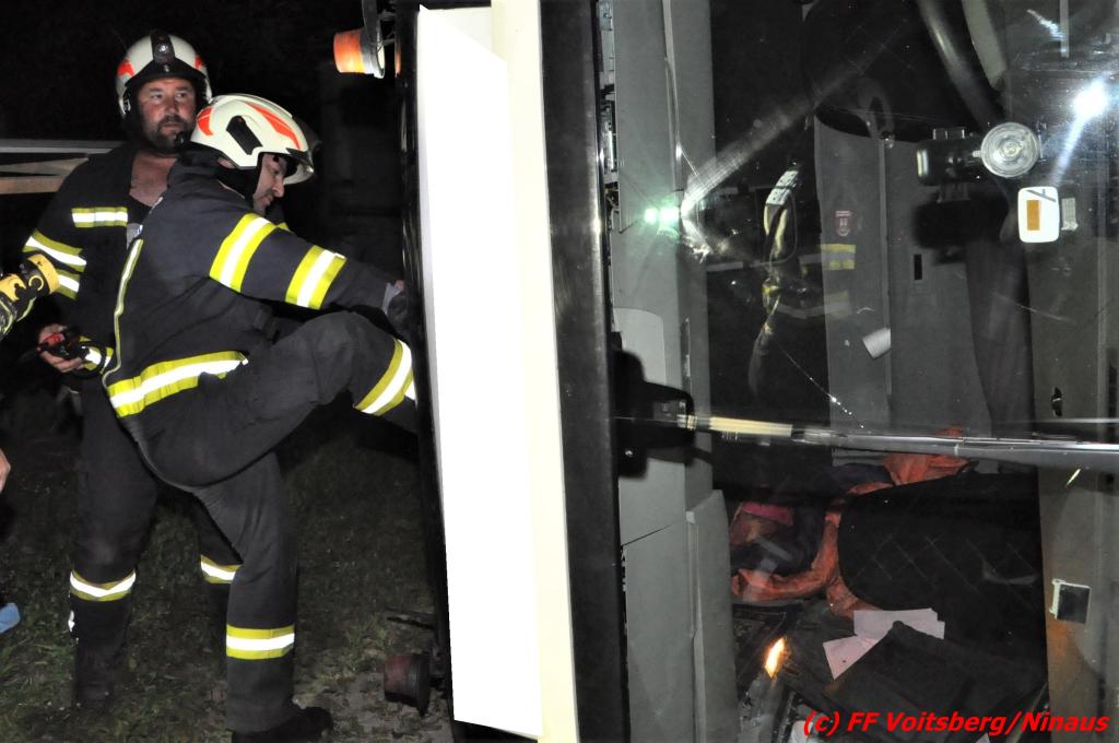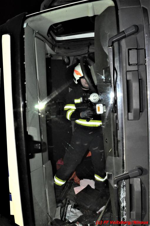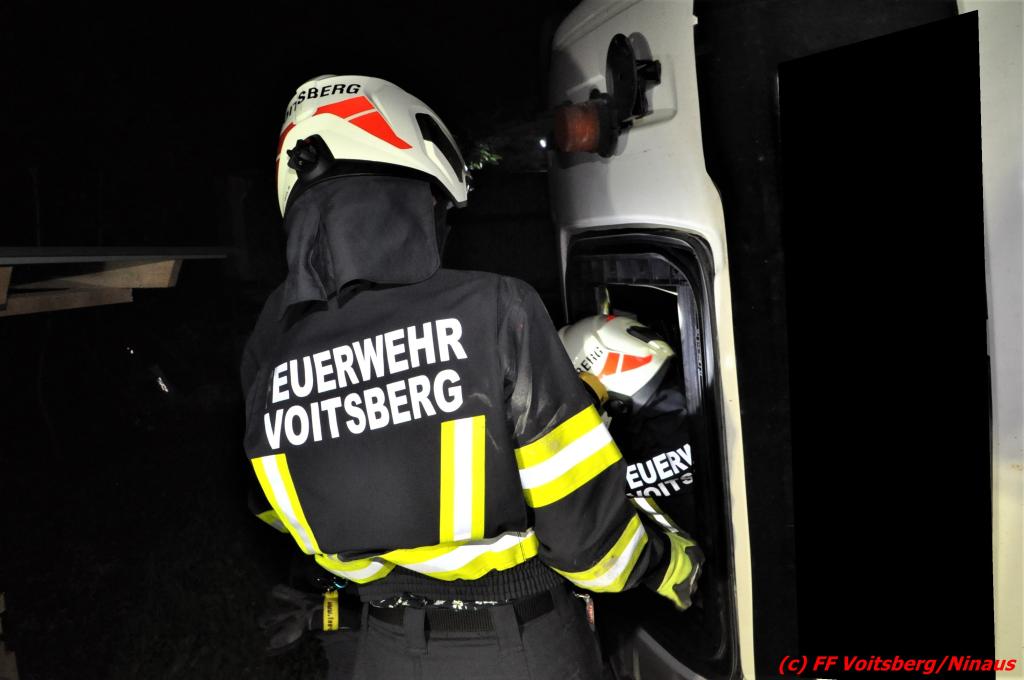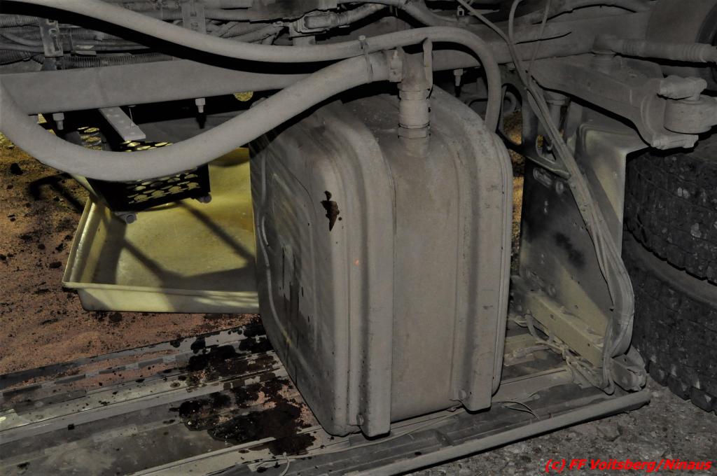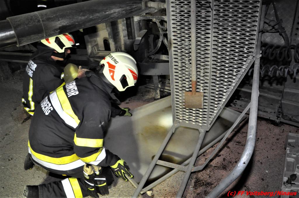 Die Aufgabe der FF Voitsberg war das Auffangen und Binden von auslaufenden Betriebsmitteln, der Aufbau eines Brandschutzes sowie die Herstellung der Beleuchtung.