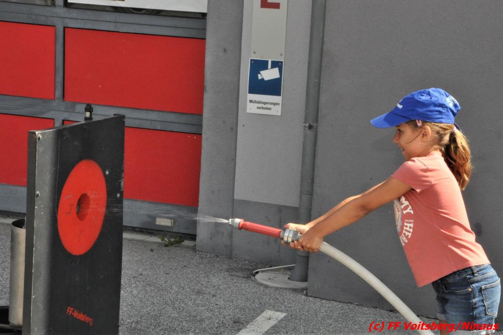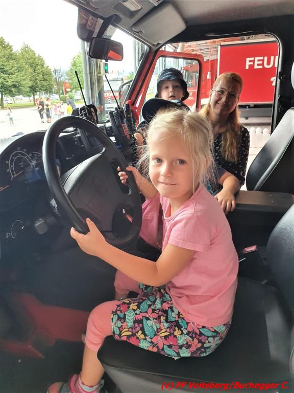 In vier Gruppen wurden die Gäste eingeteilt und durch das Feuerwehrhaus geführt. Es wurden die großen und kleinen Fahrzeuge erklärt, natürlich nicht zu vergessen eine „Sitzprobe“ in den Fahrzeugen, eine Rundfahrt am Feuerwehrplatz mit Blaulicht und Folgetonhorn, das richtige Hantieren und Spritzen mit dem Strahlrohr und einiges mehr. Die Kinder zeigten sich sehr interessiert, stellten viele Fragen und wurden abschließend zu einem Kracherl seitens der FF Voitsberg eingeladen.