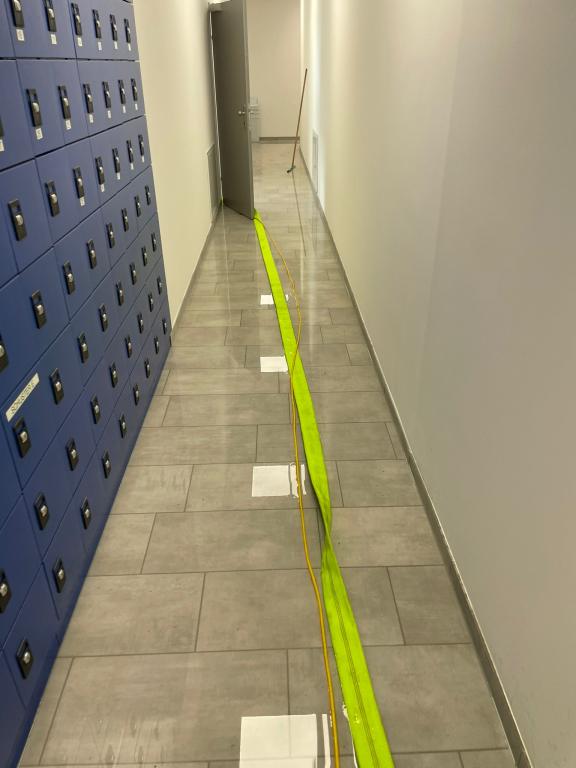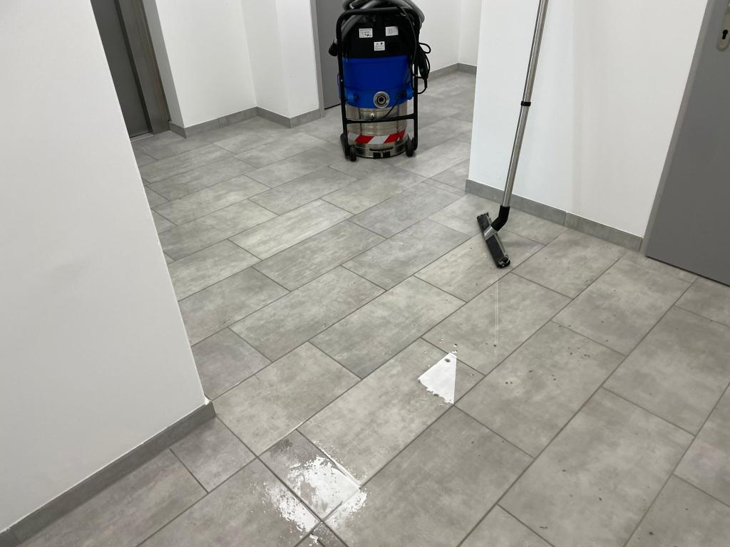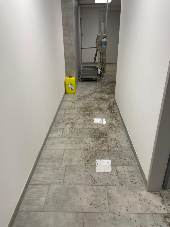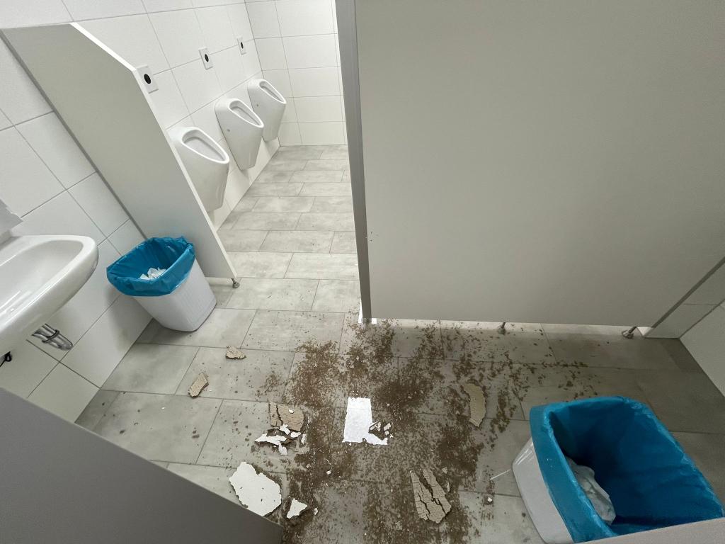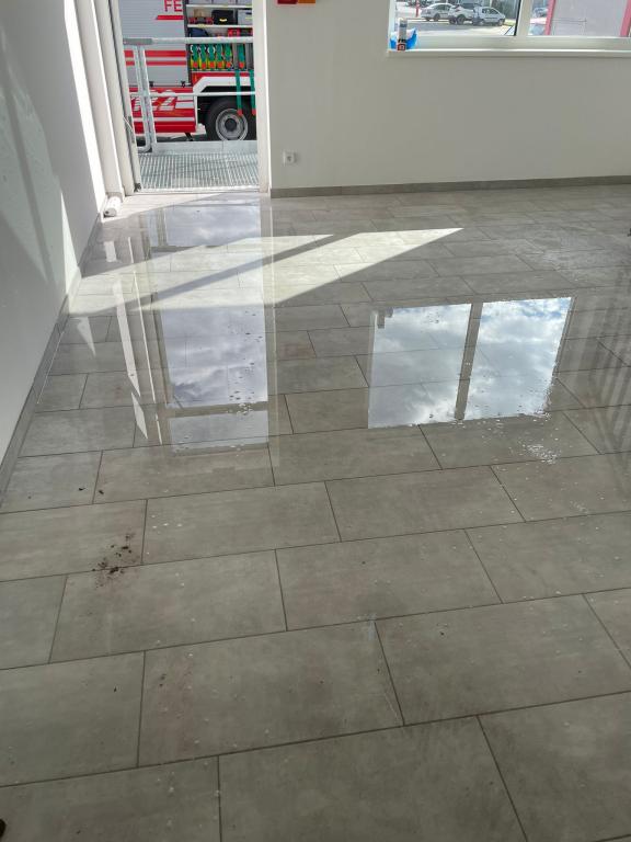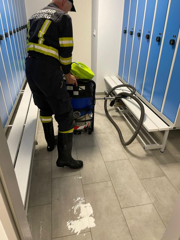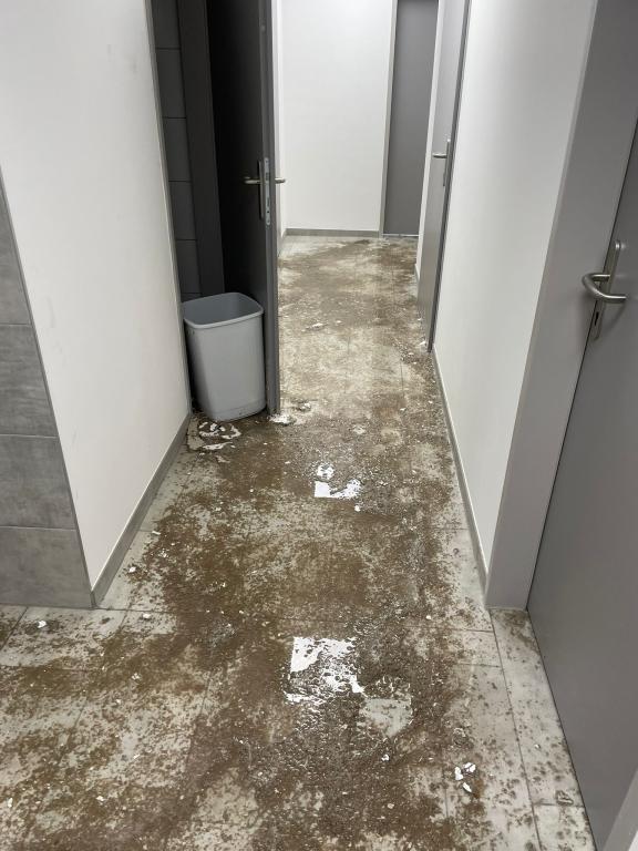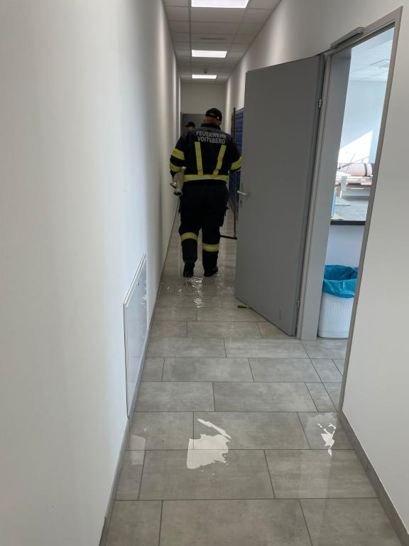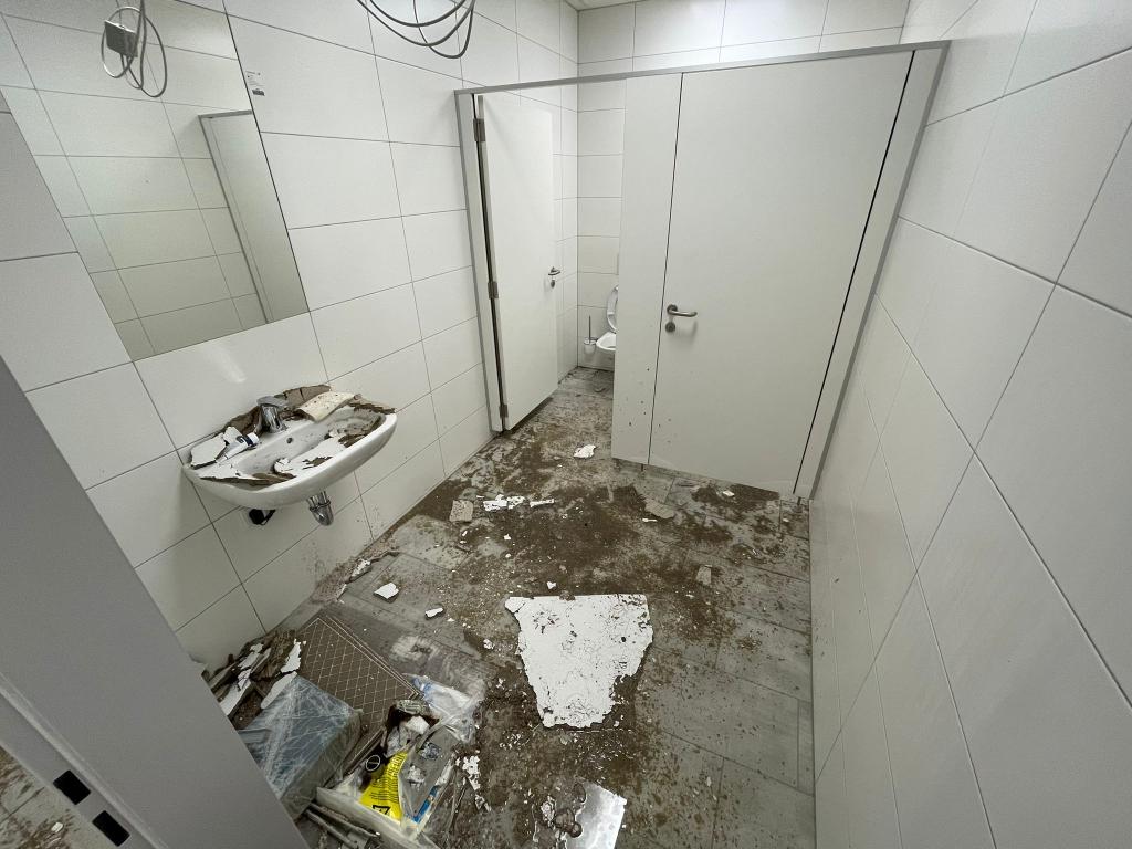 Ein Wasserrohrbruch einer Warmwasserleitung in der Decke, welche auch schwer beschädigt wurde, führte zu einer 2 cm hohen Überflutung der Sanitär- und Sozialräume im Ausmaß von ca. 300 m².