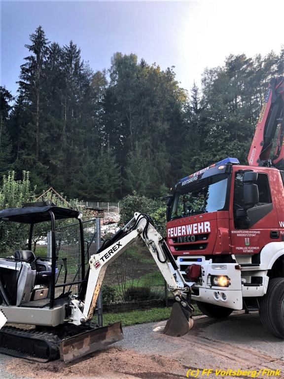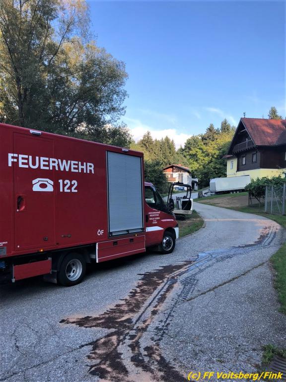 VOITSBERG, am 30.08.2022 Ölverlust bei Minibagger nach techn.Gebrechen - 30m lange Ölspur auf Strasse mit Bindemittel gebunden und fachgerecht entsorgt - Fahrzeug mittels WLF auf einem gesicherten Platz abgestellt