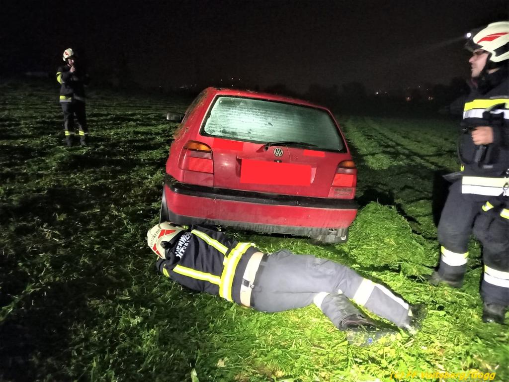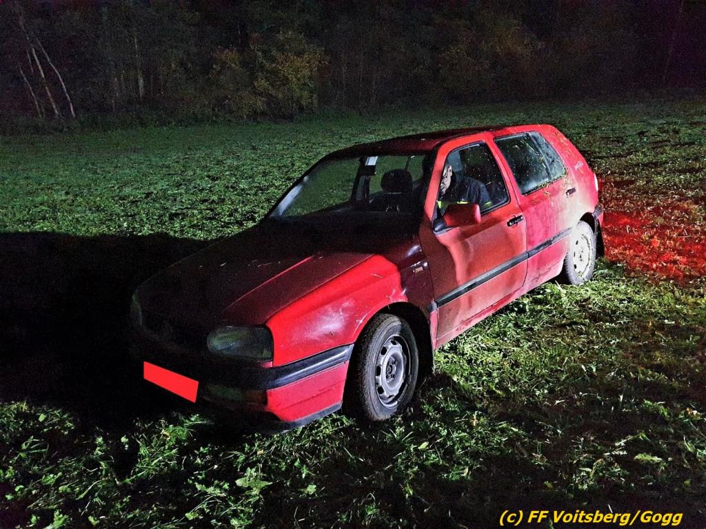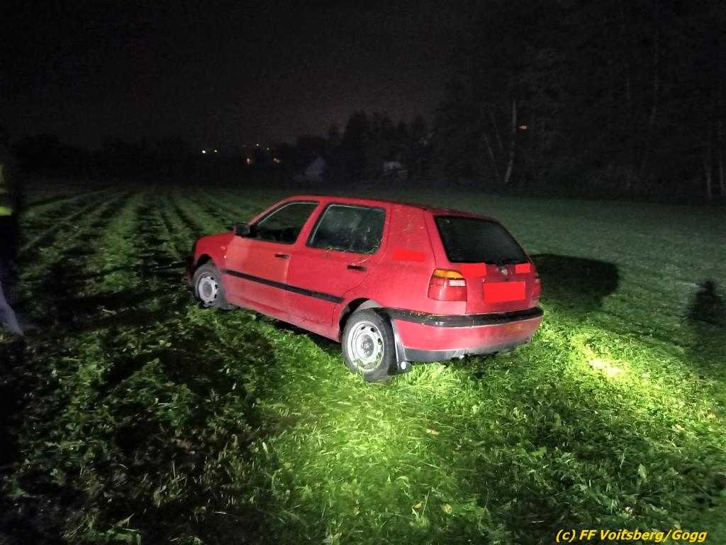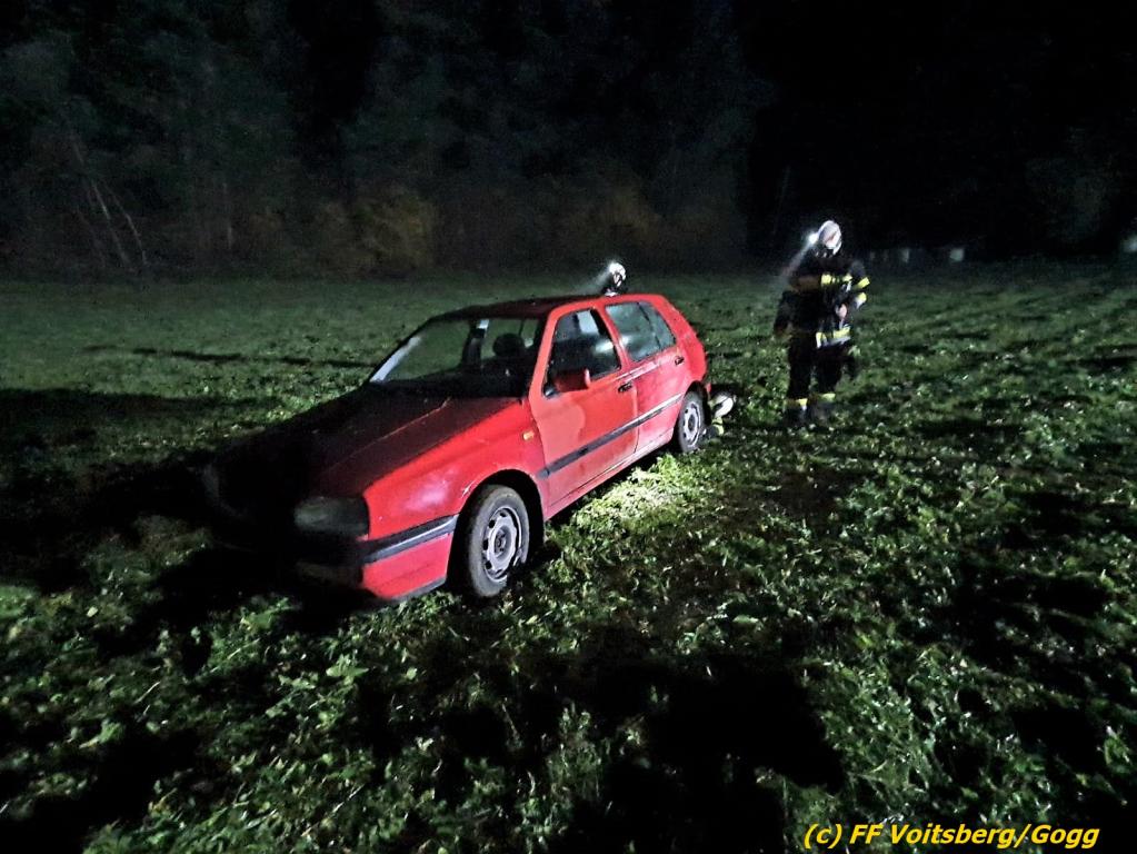 Am Samstag, 15. Oktober 2022 in den späten Abendstunden kam ein PKW von der Kowaldstraße in Voitsberg ab und schlitterte ca. 70 m über eine Wiese und kam dann zu stehen.