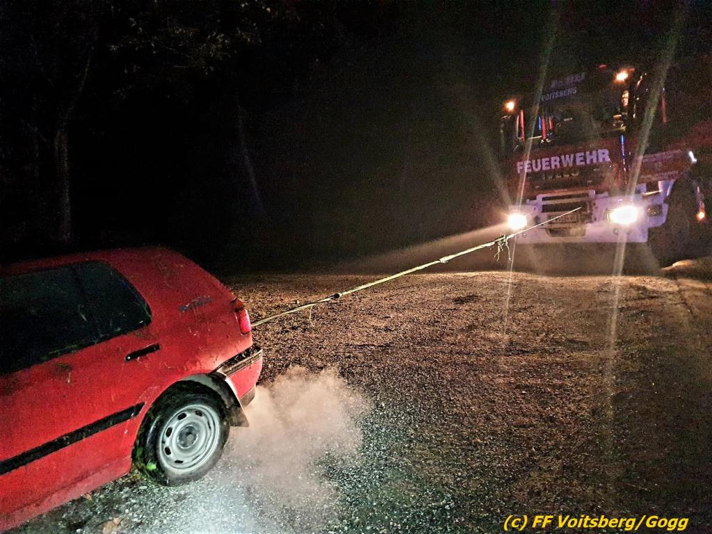 Deshalb wurde die FF Voitsberg zwecks Bergung alarmiert. Mit der Seilwinde des WLF wurde das Fahrzeug auf die Straße gezogen und dem Bergeunternehmen zur Entfernung von der Einsatzstelle übergeben.
