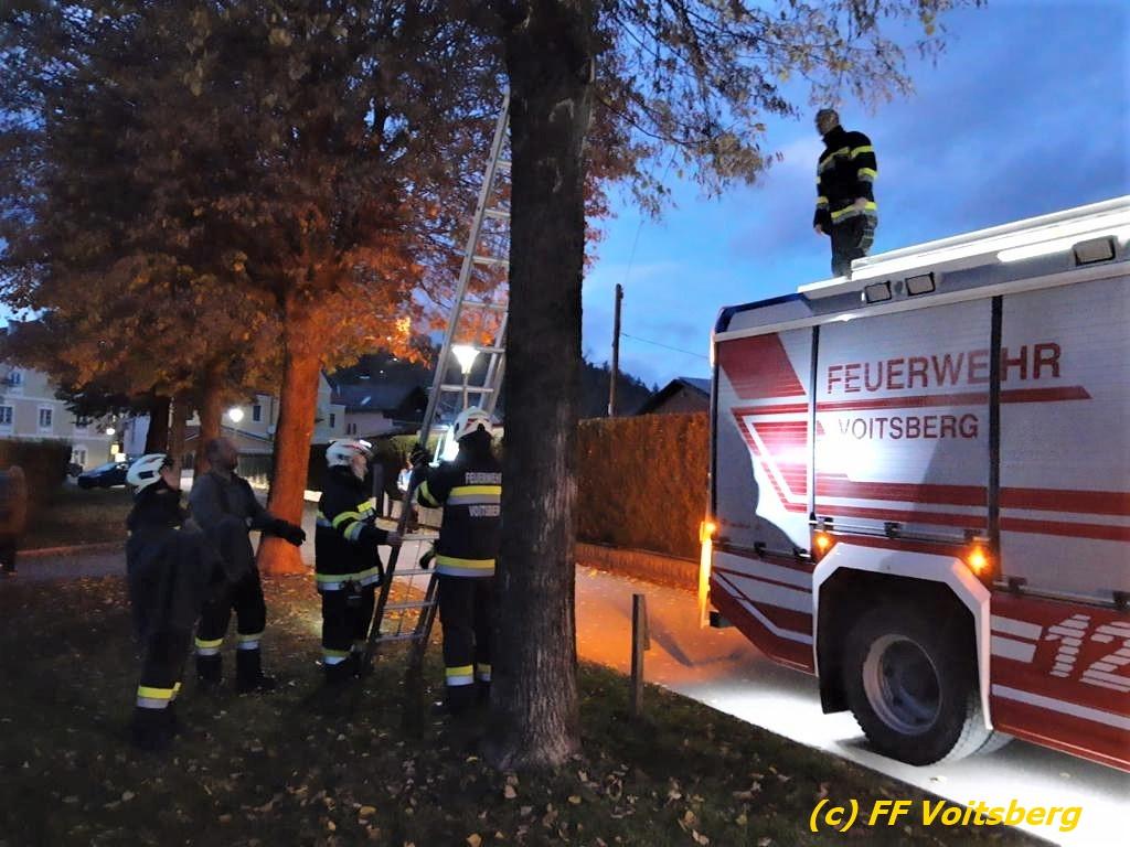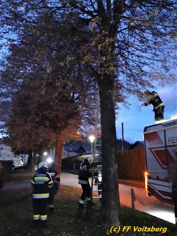 VOITSBERG, am 24.11.2022 Aufmerksame Passanten bemerkten am Donnerstag, 24. November 2022 nachmittags am Bahnweg in Voitsberg eine auf einem Baum befindliche Katze, welcher der Abstieg von diesem nicht möglich war.