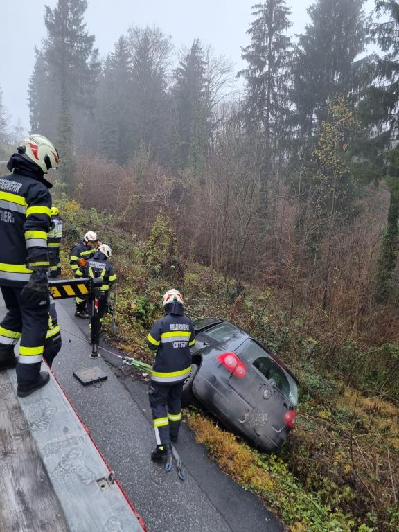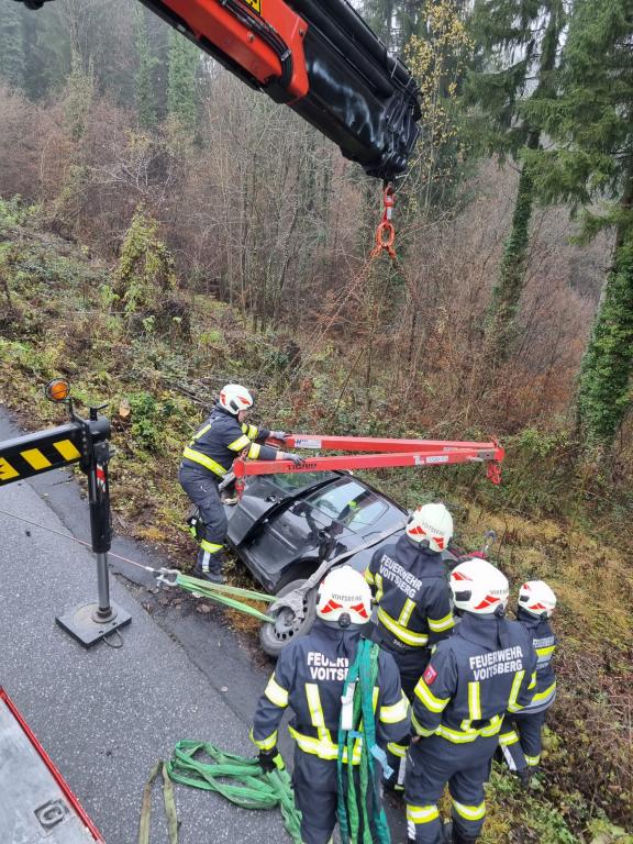 VOITSBERG, am 05.12.2022 Über Anforderung der einsatzleitenden Feuerwehr Bärnbach wurde die FF Voitsberg mit dem WLF-Kran zwecks Bergung eines verunfallten Pkw nachalarmiert. Es bestand die Gefahr des Absturzes des Fahrzeuges und des Auslaufens von Betriebsmittel.