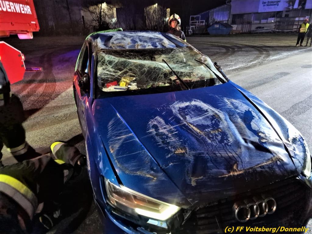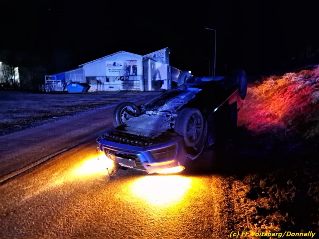 Ein Pkw-Lenker kam mit seinem Fahrzeug von der Gemeindestrasse ab, touchierte eine Straßenbeleuchtung und kam nach einigen Metern am Dach rutschend zu liegen. Der Lenker konnte sich selbst aus dem Fahrzeug befreien und blieb unverletzt.