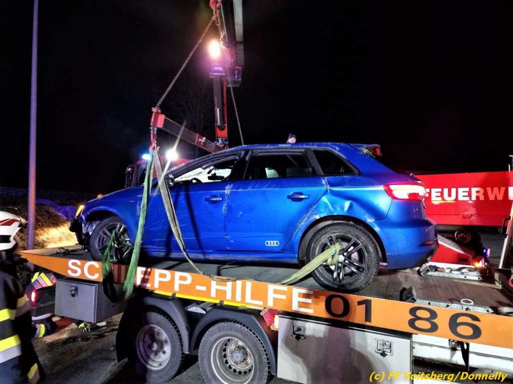 Aufgrund der Gefahr des Auslaufens von Mineralstoffen wurde das beschädigte Fahrzeug mit dem WLF-Kran der FF Voitsberg geborgen und einem Abschleppunternehmen zwecks Abtransport übergeben.