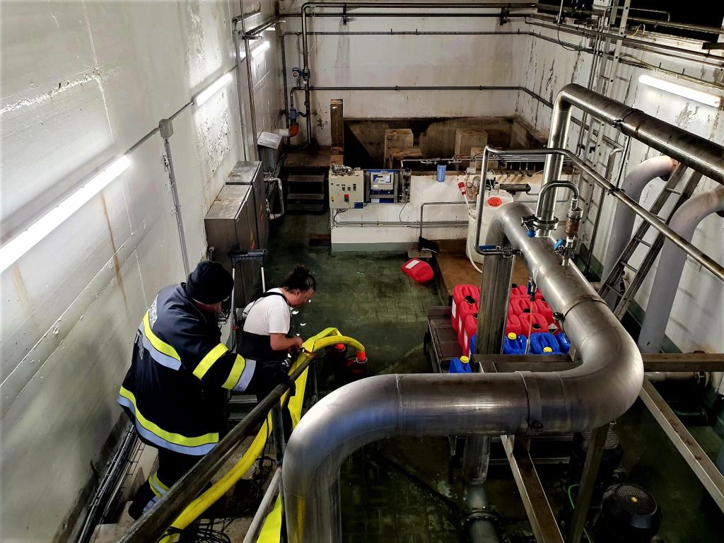 VOITSBERG, am 11.01.2023 Aufgrund eines Wasserrohrbruches wurde ein Pumpenhaus rund 50 cm hoch überschwemmt. Die alarmierte FF Voitsberg setzte zum Abpumpen des Wassers zwei Schmutzwasserpumpen ein.