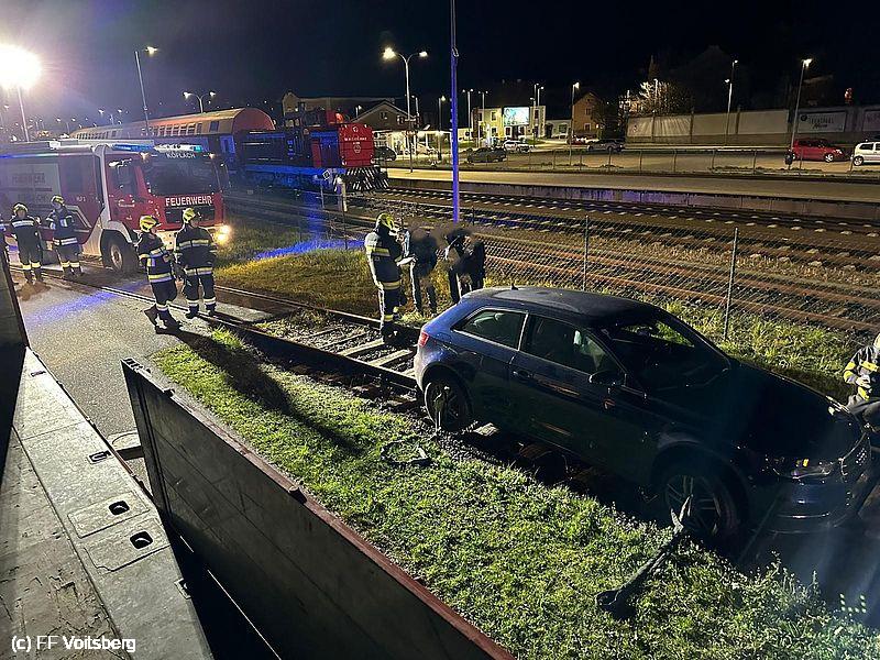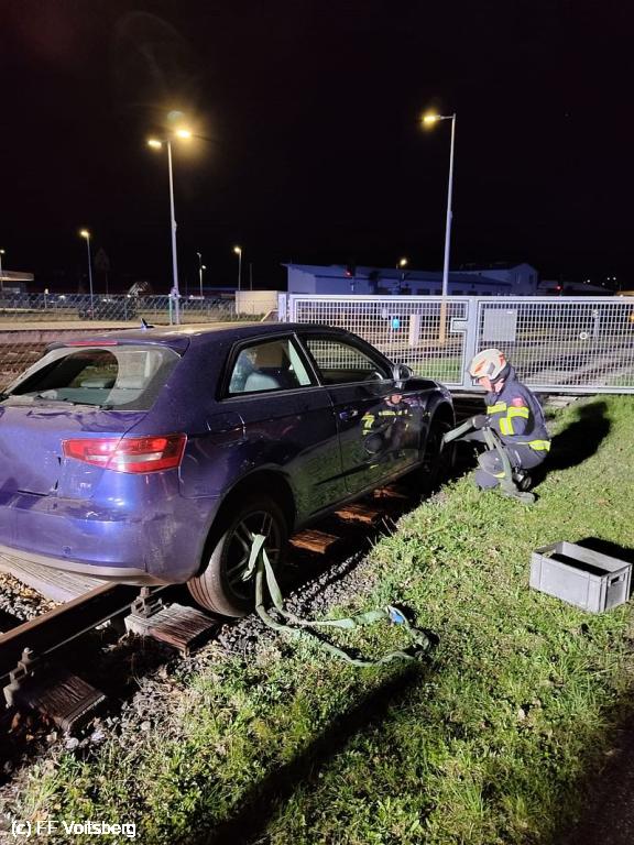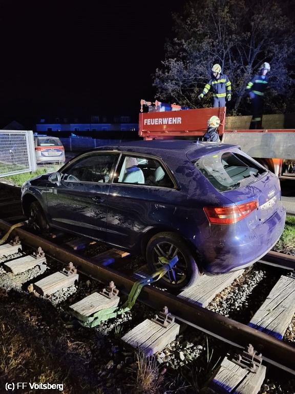 Über Anforderung der einsatzleitenden FF Köflach wurde mit dem WLF-Kran ein verunfalltes Fahrzeug von Bahngeleisen geborgen.
