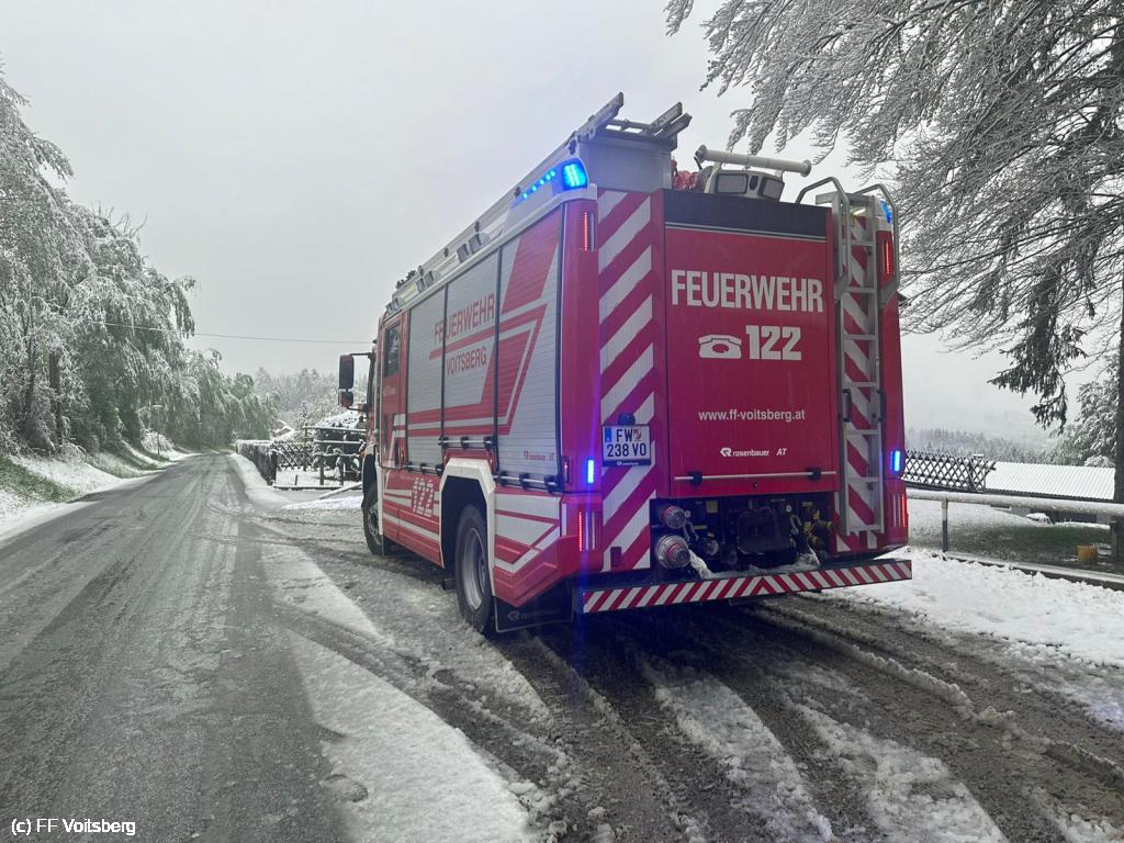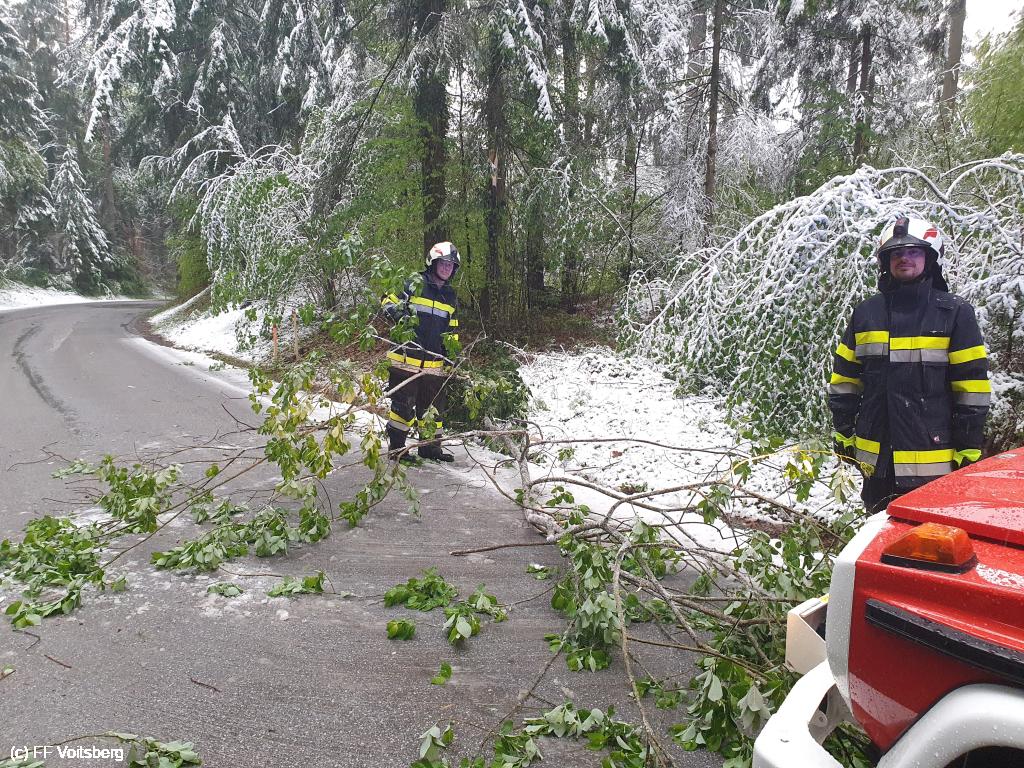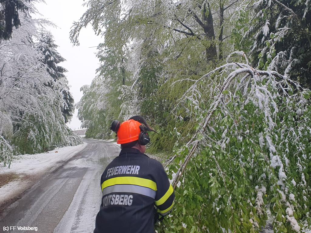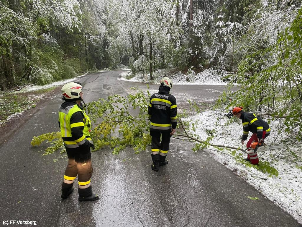 VOITSBERG, am 23.04.2024 Aufgrund der Schneefälle stürzten einige Bäume am Blickweg auf eine Stromleitung. Die verständigte Stadtwerke Voitsberg führte eine Abschaltung durch und beauftragte eine Fachfirma zur Entfernung. Bereits auf der Anfahrt wurden weitere Einsatzstellen im Bereich der Kowaldstraße und der Wolfshuberstraße wahrgenommen und von den eingesetzten Kameradinnen und Kameraden abgearbeitet. Nach knapp einer Stunde waren alle Bäume entfernt.