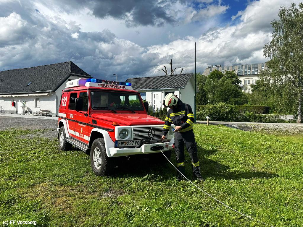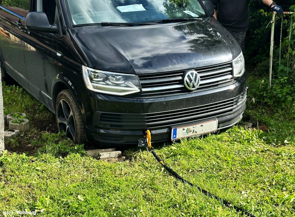 VOITSBERG, am 17.05.2024 Ein in einer Wiese festgefahrener Kleinbus wurde mittels Seilwinde des KRFBA geborgen und setzte Fahrt auf eigener Achse fort.