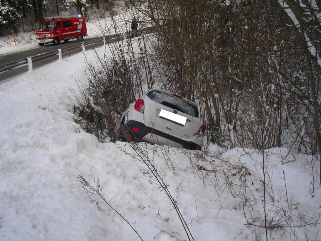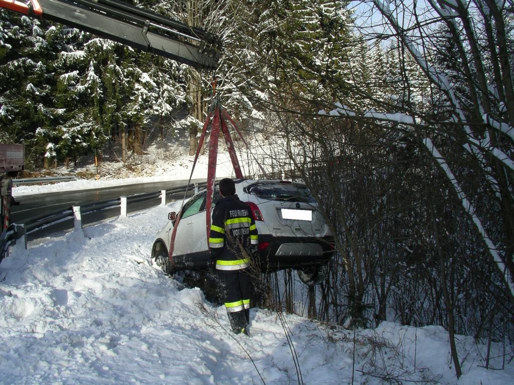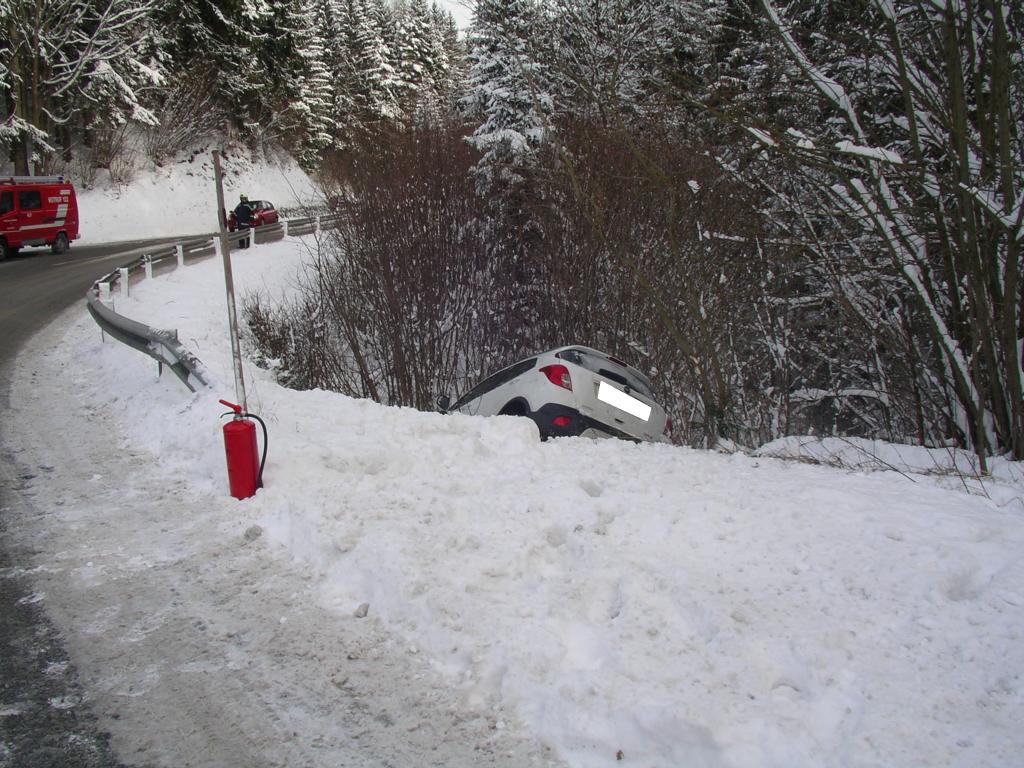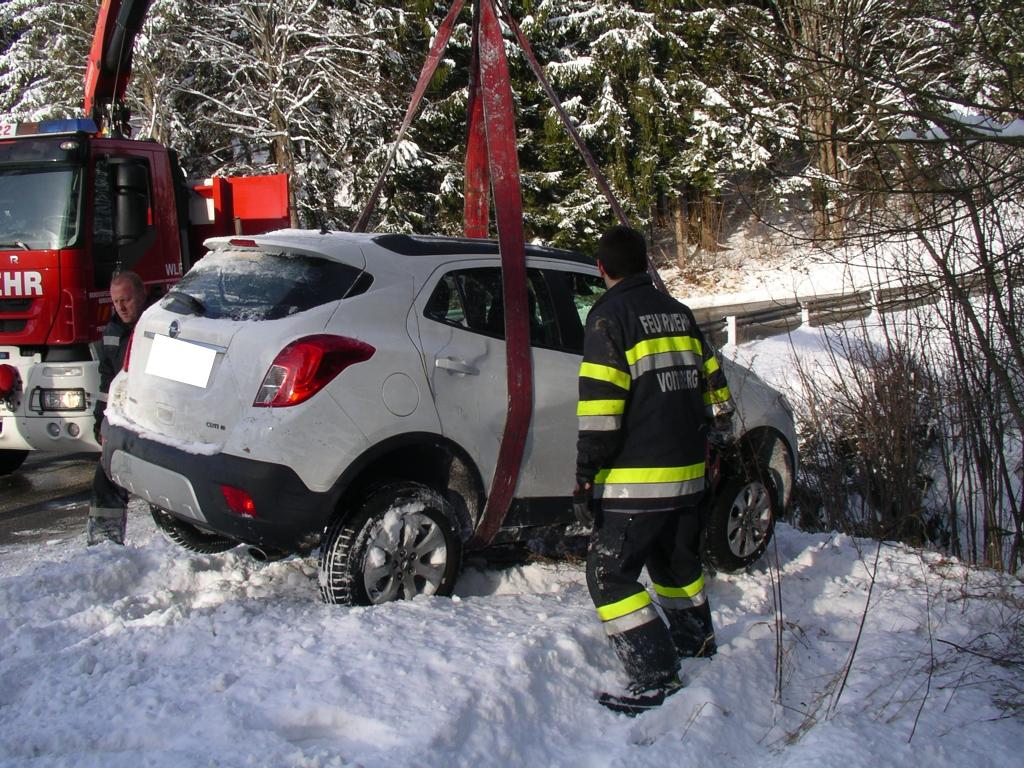 VOITSBERG, am 29.12.2014 Ein PKW geriet aus ungeklärter Ursache von der LB 70 ab und schlitterte über eine Böschung. Das Fahrzeug wurde mittels Seilwinde des KRFB und mit dem WLF-Kran geborgen. Die FF Edelschrott baute einen Brandschutz auf, sicherte die Unfallstelle ab und führte die Verkehrsregelung durch.