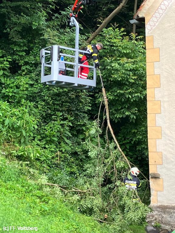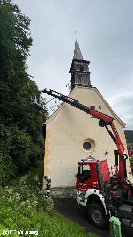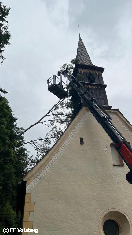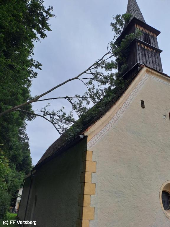 VOITSBERG, am 16.06.2024 Ein abgebrochener Ast stürzte auf das Dach der Heiligen Blut Kirche. Der diensthabende Einsatzzug rückte und entfernte den Ast.