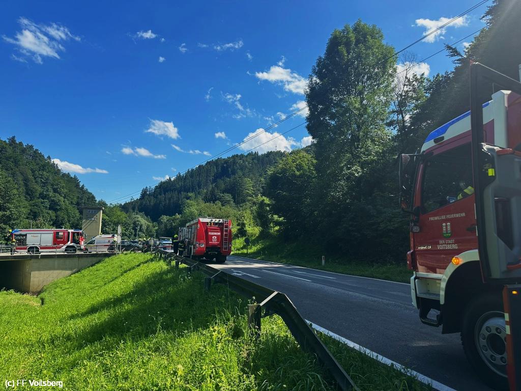 VOITSBERG, am 05.07.2024 Die Feuerwehren Gaisfeld, Krems und Voitsberg wurden am 05.07.2024 um 15:35 Uhr zu einem Verkehrsunfall mit 3 Fahrzeugen auf der B70 in den Kremser Reihen alarmiert. Das ersteintreffende Fahrzeug der FF Gaisfeld konnte rasch Entwarnung geben. Die Personen waren entgegen der Notrufmeldung nicht im Fahrzeug eingeklemmt. Unsere Aufgabe war die Absicherung der Unfallstelle und anschließend Bereitschaft am Einsatzort.