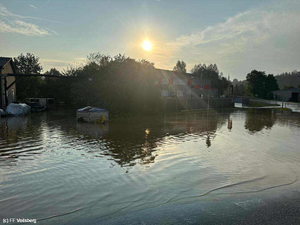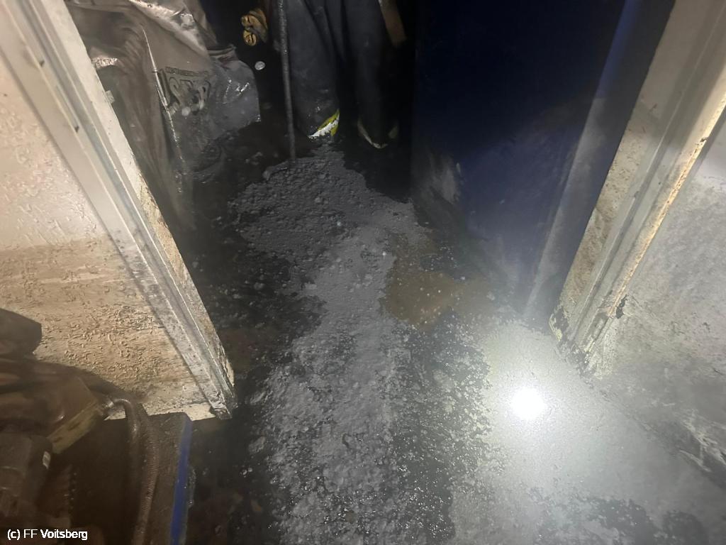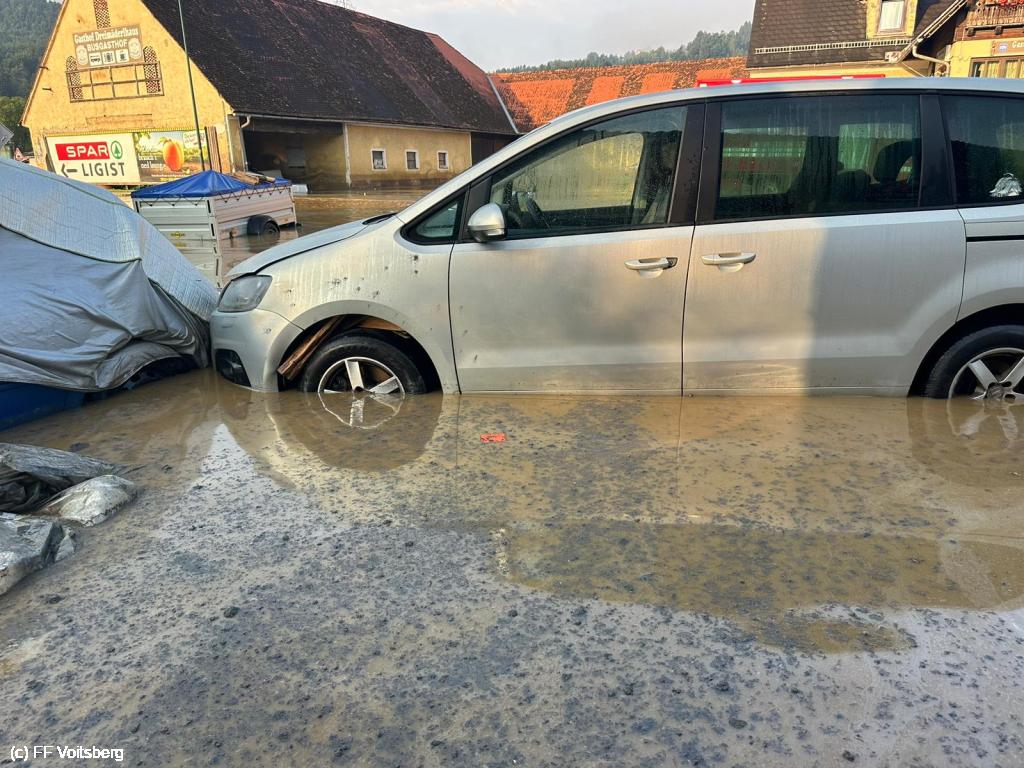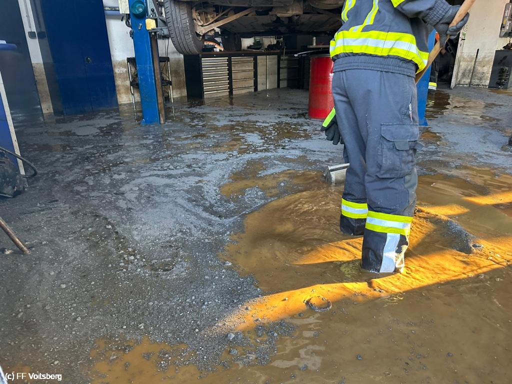 VOITSBERG, am 12.07.2024 Beim Hochwasser im Ortszentrum von Krottendorf wurde auch eine KFZ Werkstätte überflutet. Die ausgetretenen Öle und Betriebsmittel wurden mit Ölbindemittel gebunden, abgeschöpft und entsorgt.