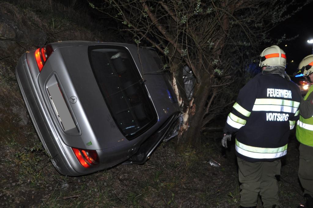 VOITSBERG, am 29.04.2015 Ein aus Tregist kommender PKW musste nach Angaben des Fahrzeuglenkers ein Reh ausweichen, verriss den PKW, kam von der Straße in einer Rechtskurve links ab und prallte frontal gegen einen Baum und beschädigte die rechte Seite des PKW sehr stark. Er konnte sich wie durch ein Wunder fast unverletzt aus dem Wrack befreien. Beim Aufprall traten Schmier- und Treibstoffe aus und wurden mittels Bindemittel gebunden und fachgerecht entsorgt. Während der gesamten Bergearbeiten wurde ein einfacher Brandschutz aufgebaut. Die Bergung erfolgte mit dem WLF-Kran mit Seilwinde. Die Polizei Voitsberg führte Vorort Erhebungen durch. Das ebenfalls anwesende Rote Kreuz versorgte den Leichtverletzten.
