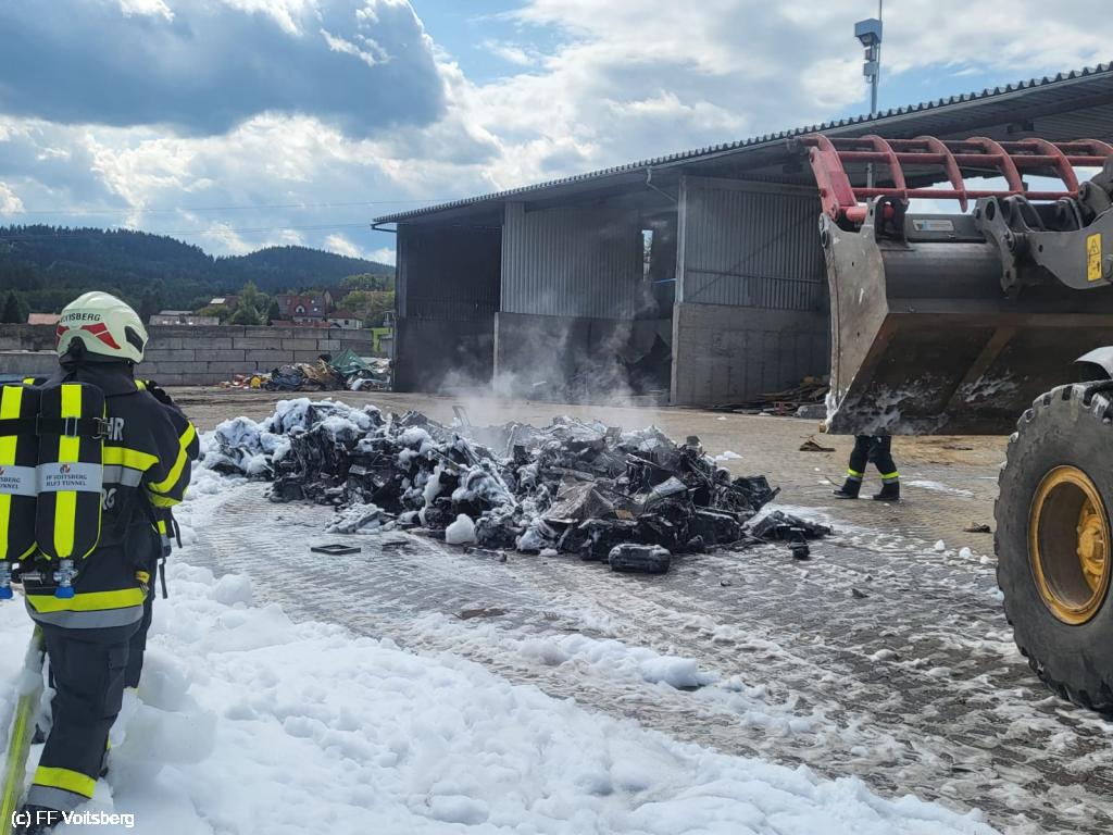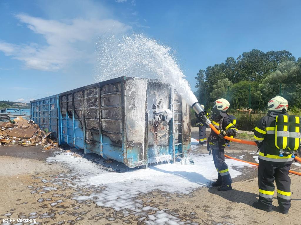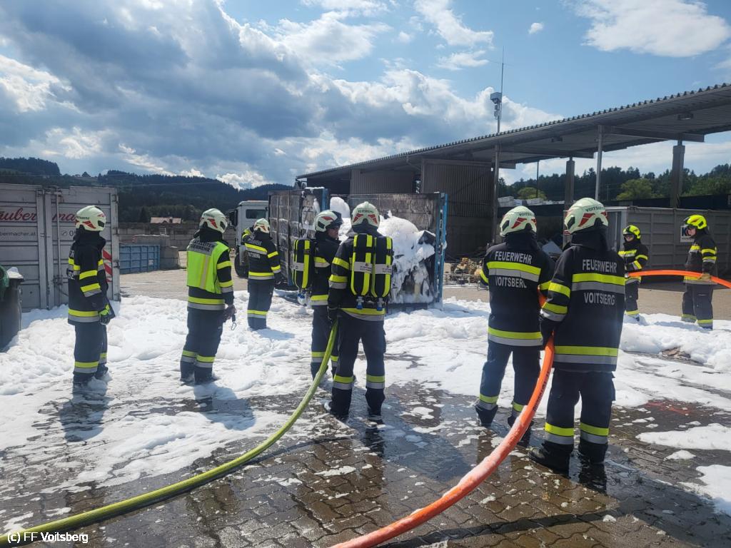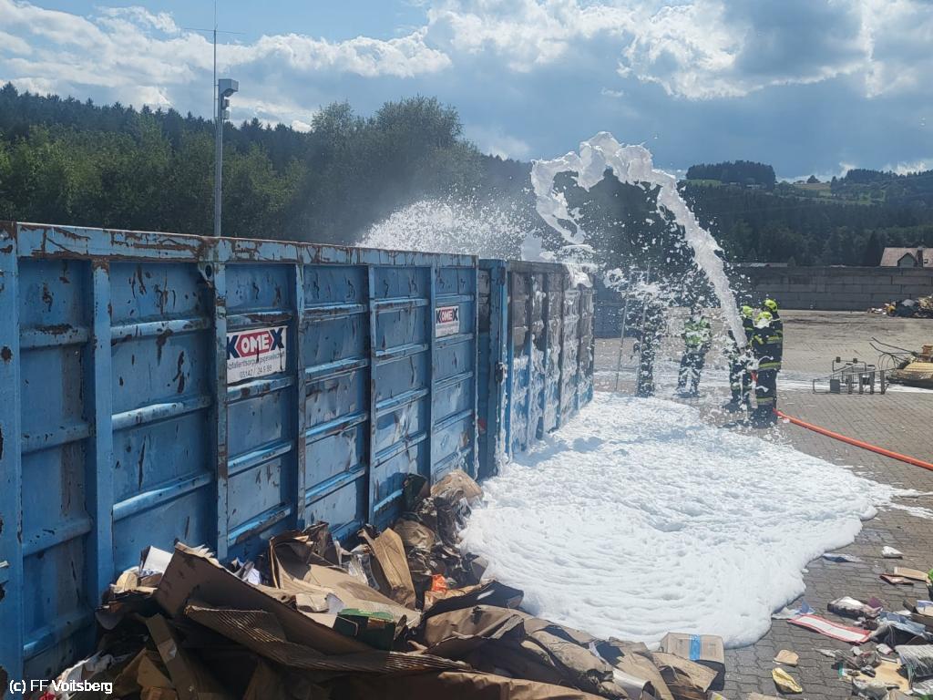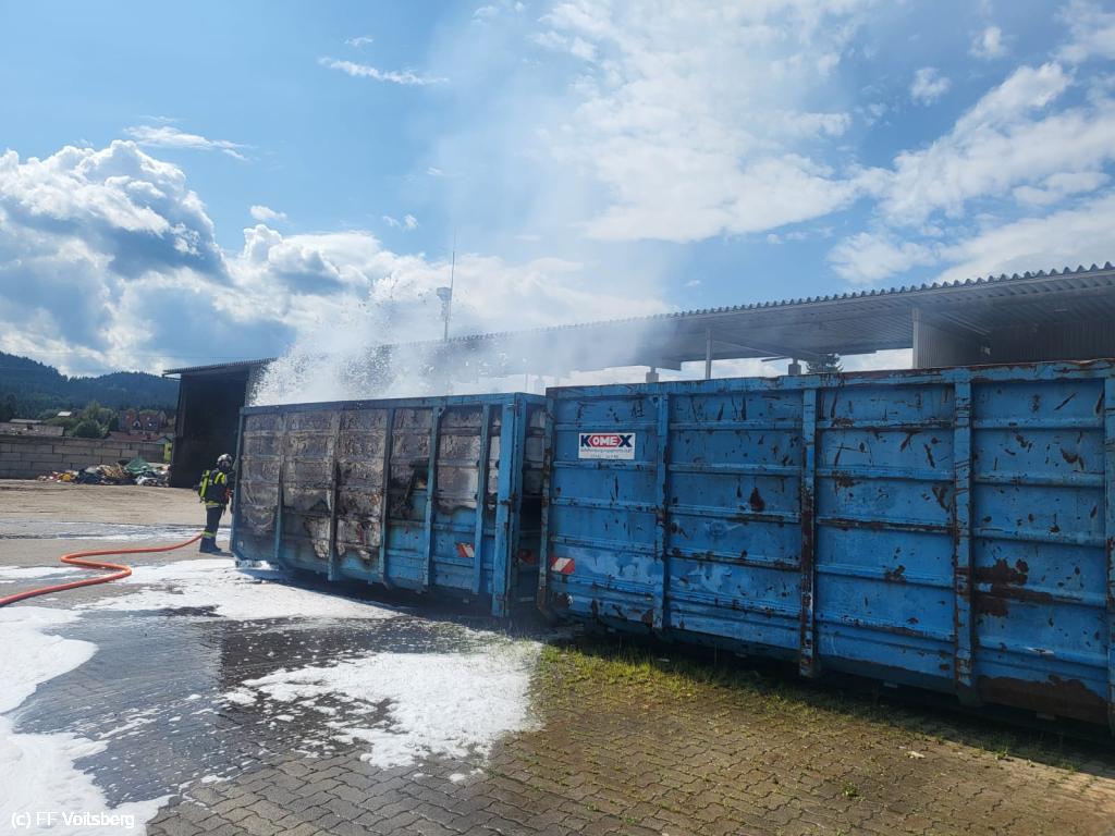 Ein mit Elektroschrott beladener Groß-Container geriet aus ungeklärter Ursache in den frühen Nachmittagsstunden des 3. August 2024 auf einem Platz eines Voitsberger Abfallbetriebes in Brand und griff auf den gesamten Container über.