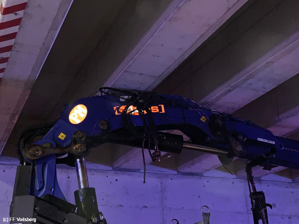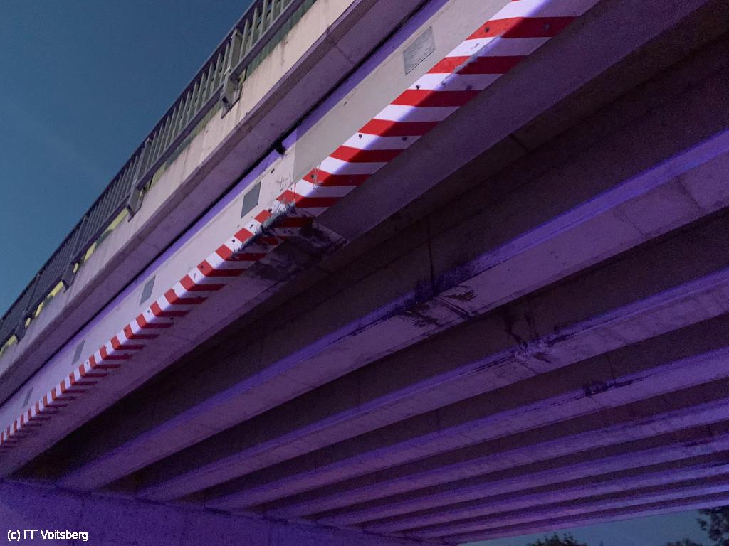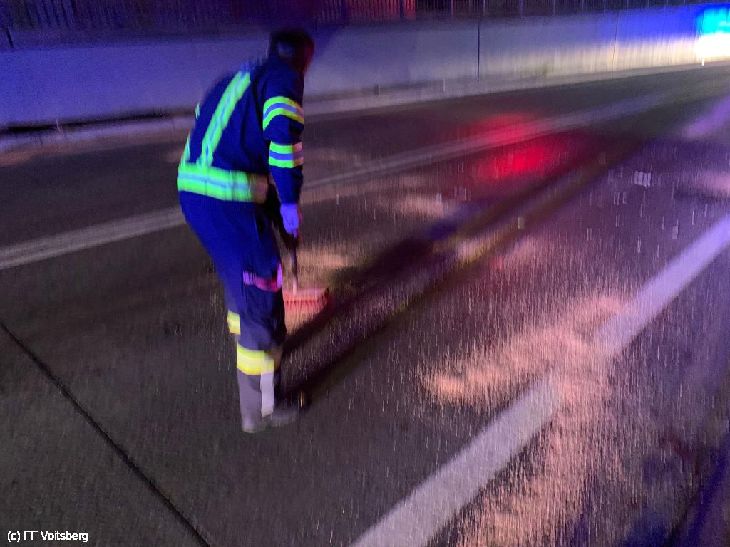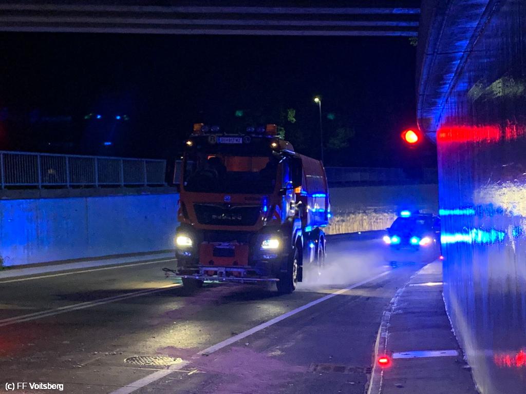 VOITSBERG, am 28.08.2024 Nach einer unbekannten Kollision zwischen einem ausgefahrenen Autokran und einer Brücke bei der Einfahrt zur Unterflurtrasse der B 70 in Voitsberg in Richtung Graz gelangte Hydrauliköl auf die Fahrbahn. Aufgabe der FF Voitsberg war das Binden des Hydrauliköles und fachgerechte Entsorgung durch die Straßenmeisterei.