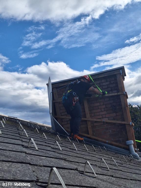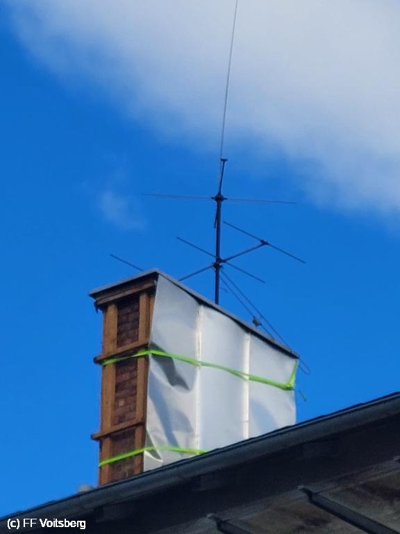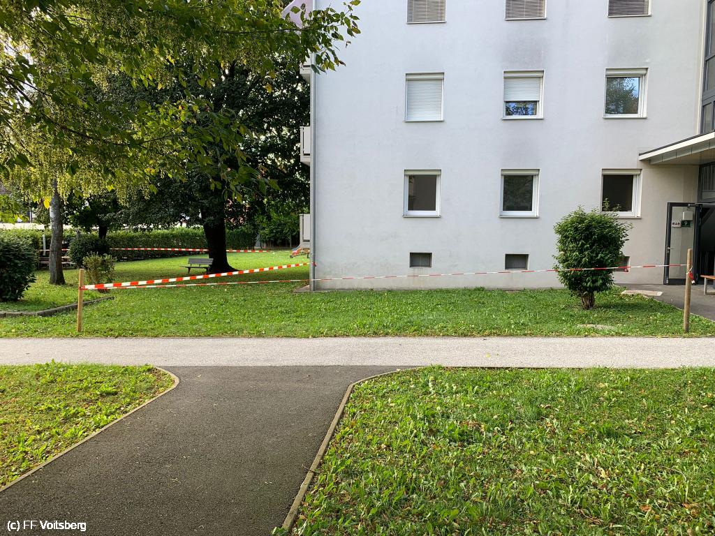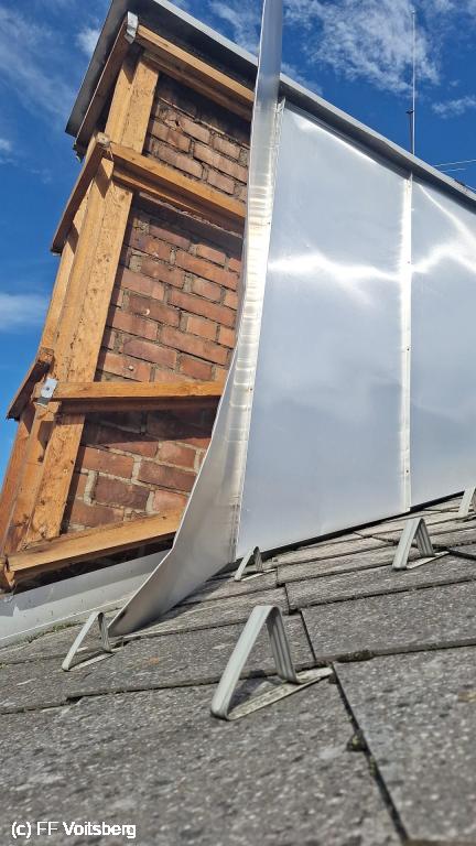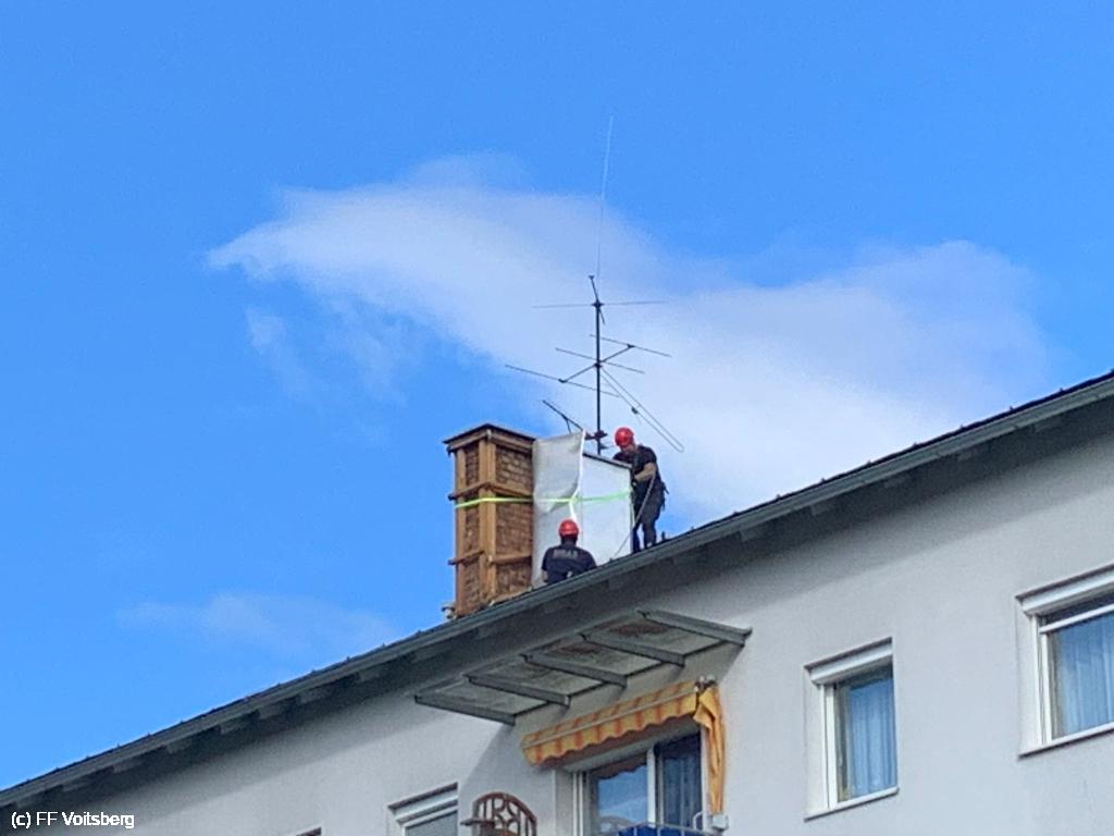 VOITSBERG, am 15.09.2024 Durch den Sturm löste sich ein Teil der Kaminumrandung und fiel zu Boden. Die MRAS-Einheit der FF Voitsberg sicherte den Rest der Umrandung mit Ratschengurten. Der Platz vor dem Mehrfamilienhaus wurde gesichert und gesperrt.