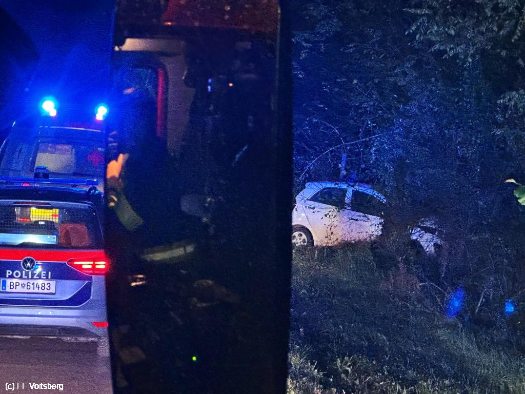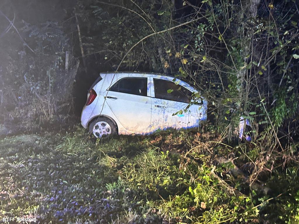 VOITSBERG, am 28.10.2024 Ein PKW kam aus ungeklärte Ursache von der Fahrbahn ab und wurde mit der Seilwinde geborgen. Die leicht verletzte Lenkerin wurde vom Roten Kreuz versorgt.