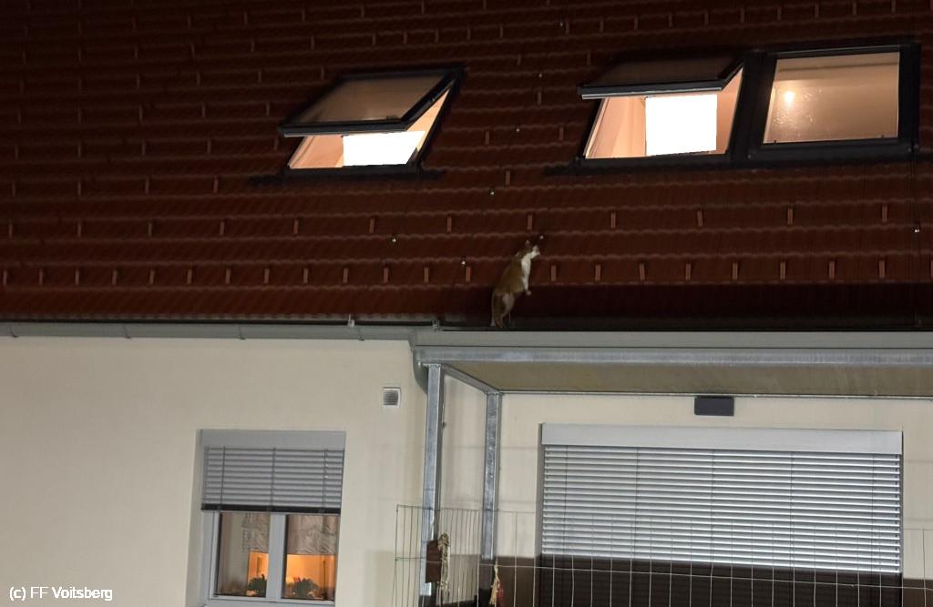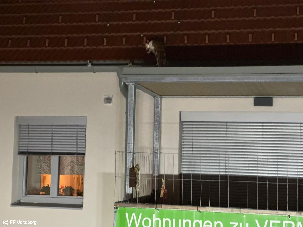Eine Katze verirrte sich auf eine Balkonüberdachung im 1. Obergeschoß und konnte von den Besitzern nicht erreicht werden.