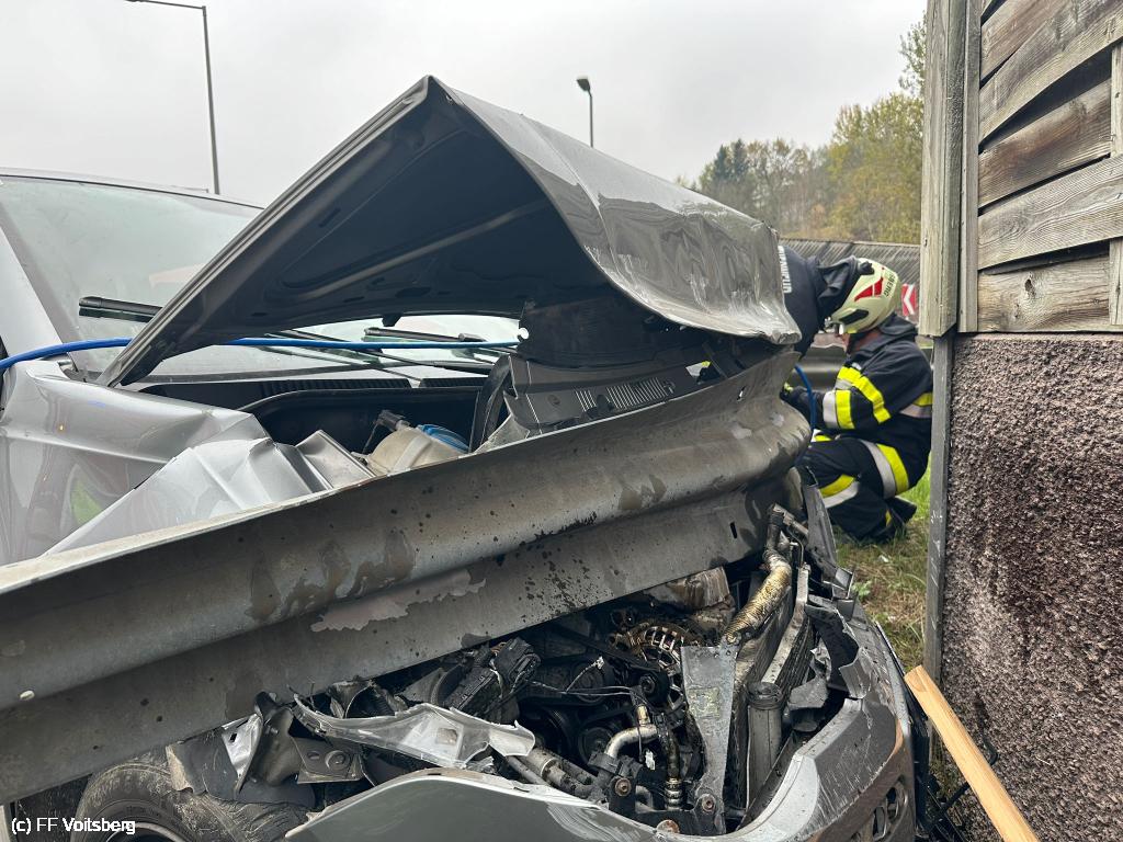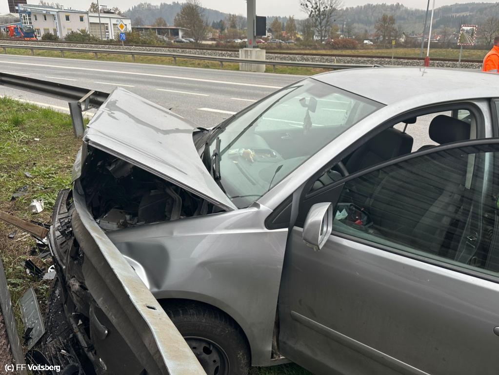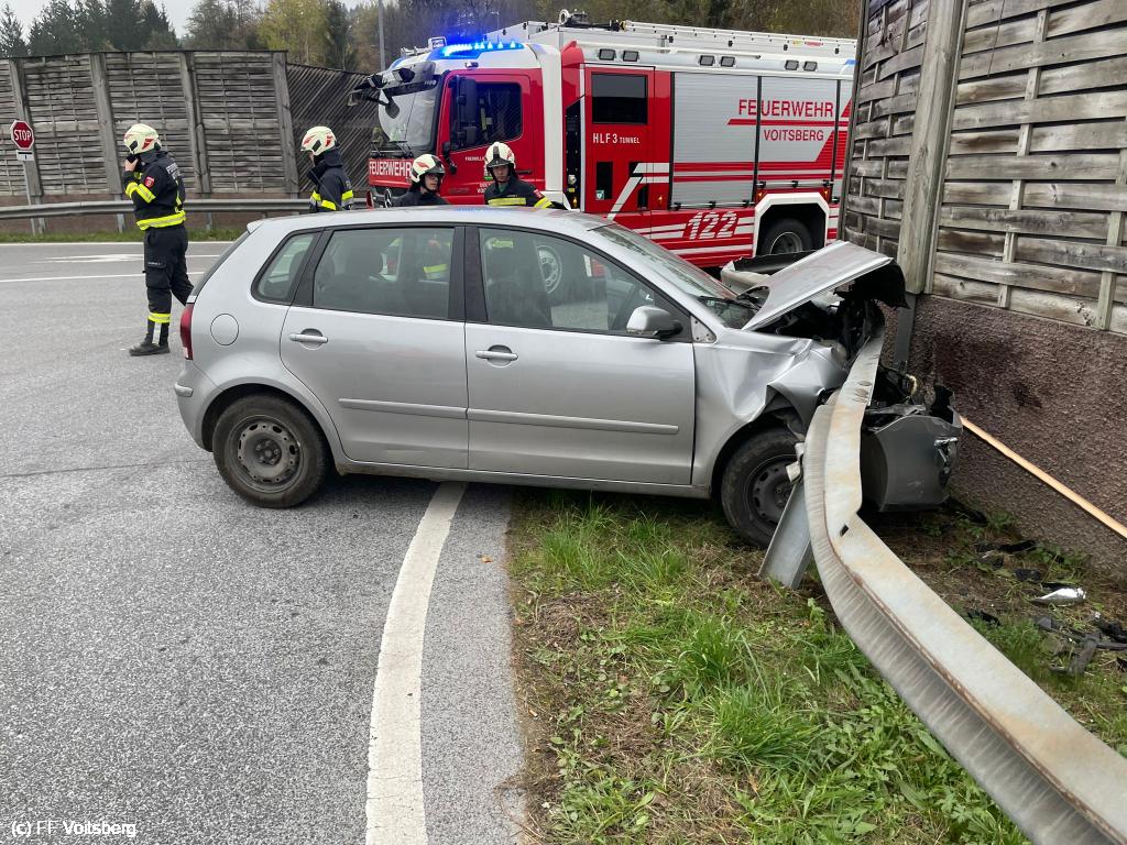 Aus ungeklärter Ursache geriet am Dienstag, 12. November 2024 kurz vor 8 Uhr ein Pkw bei der Abfahrt Arnsteinstraße der B70 in Voitsberg frontal gegen eine Leitschiene und verkeilte sich.