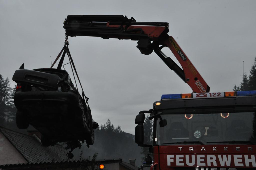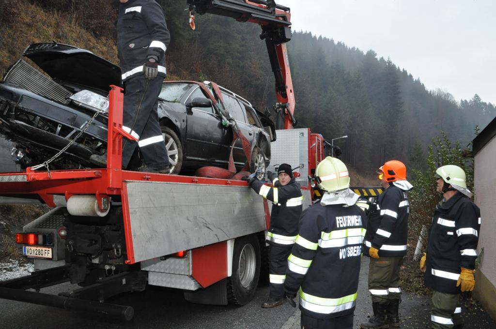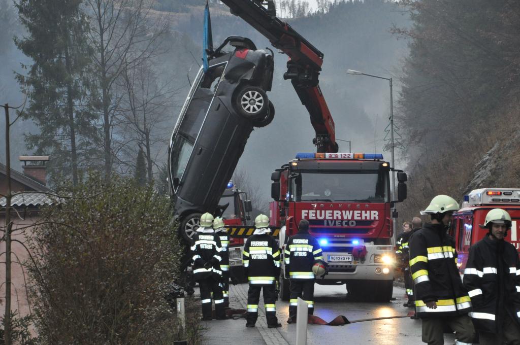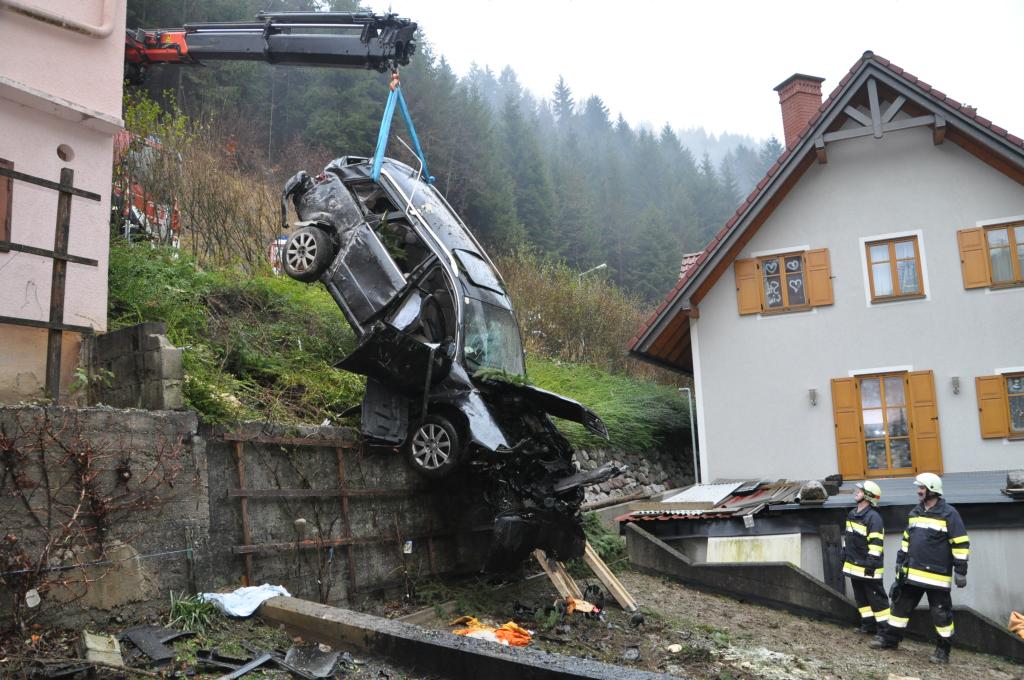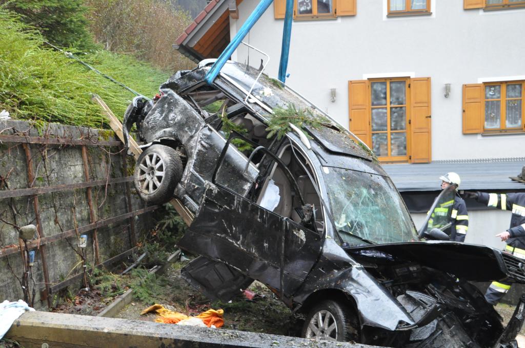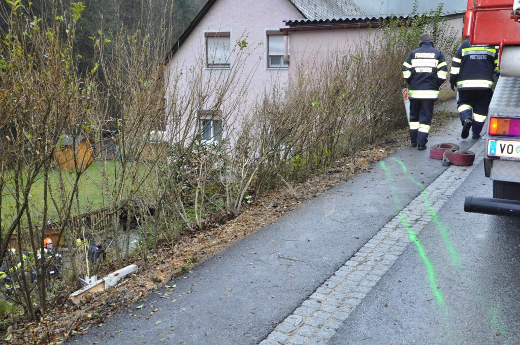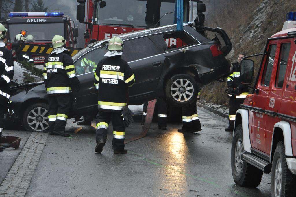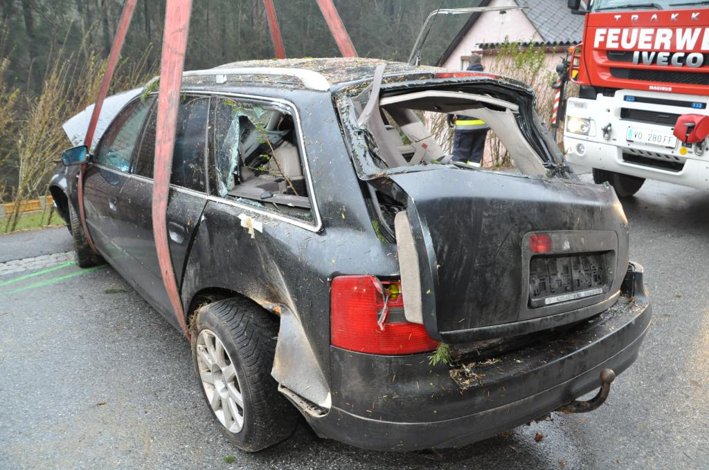 VOITSBERG, am 27.12.2013 Ein PKW-Lenker geriet mit seinem PKW auf der Gemeindestraße im Freisinggraben rechts gegen eine Bordsteinkante, verriß sein Fahrzeug nach links und stürzte sich überschlagend über eine 5 Meter hohe Böschung. Das schwerst beschädigte Fahrzeug kam am Dach zu liegen. Beide Insassen wurden aus dem PKW geschleudert. Die mitfahrende Person wurde unter dem Fahrzeug eingeklemmt und von Passanten geborgen. Der anwesende Arzt konnte nur mehr den Tod des Beifahrers feststellen. Der Fahrer wurde mit Verletzungen unbestimmten Grades vom Roten Kreuz Voitsberg ins LKH Voitsberg eingeliefert. Die zuständige Ortsfeuerwehr Afling alarmierte zwecks Bergung des Fahrzeuges über die LLZ das WLF Voitsberg. Die darauffolgende Bergung wurde in Zusammenarbeit mit der FF Afling durchgeführt. Das Fahrzeug wurde zum Rüsthaus Voitsberg überstellt.