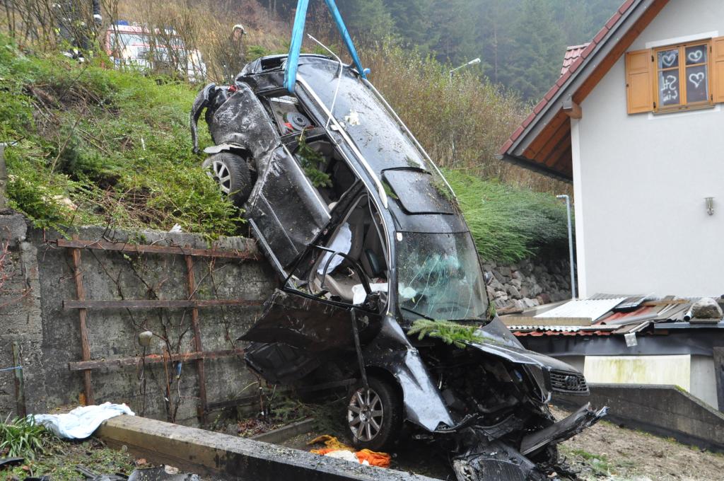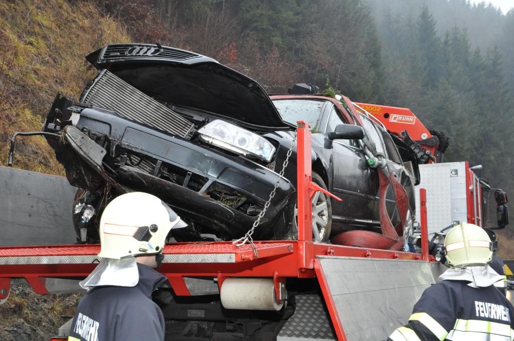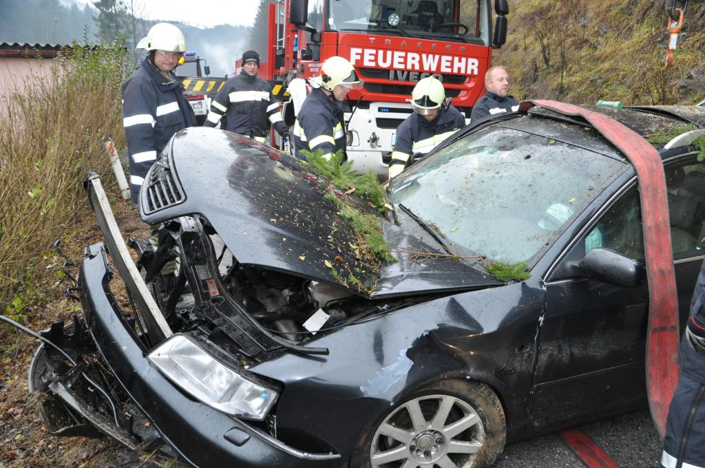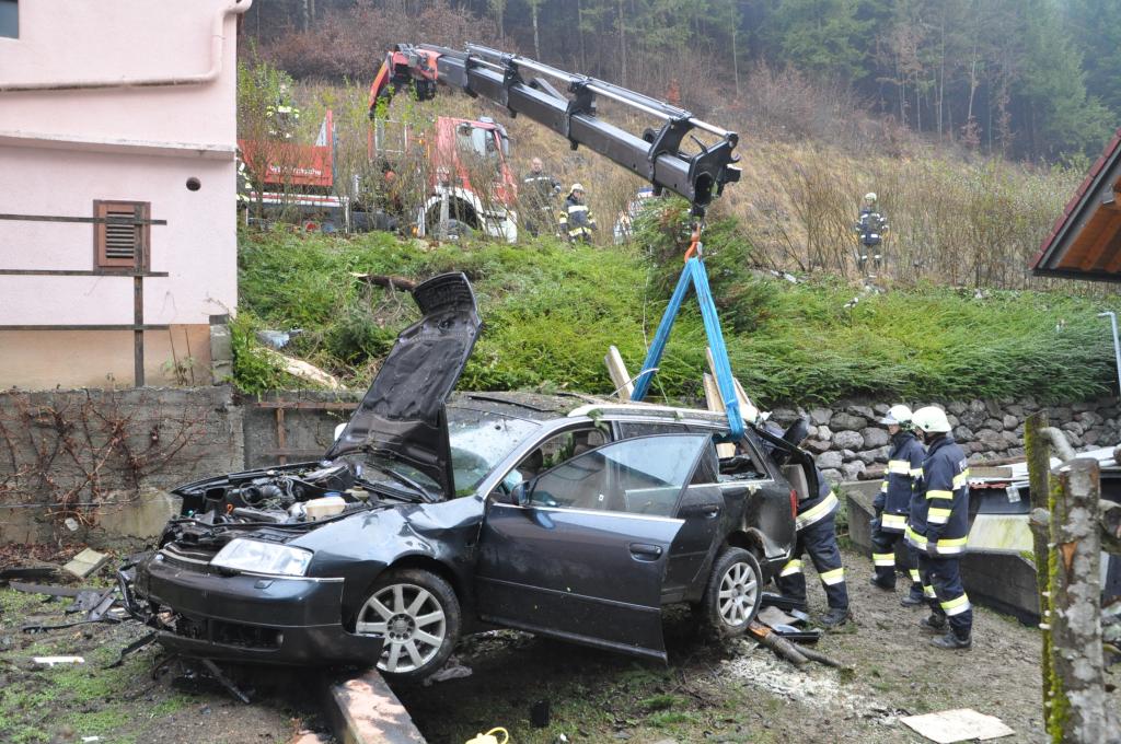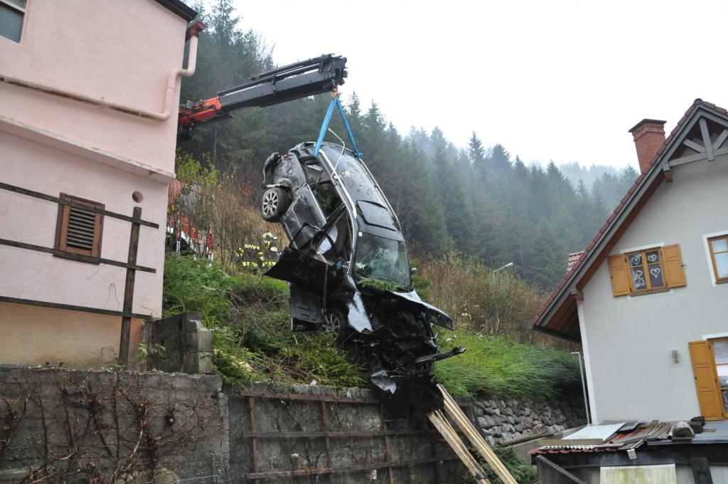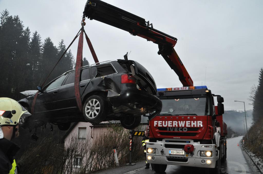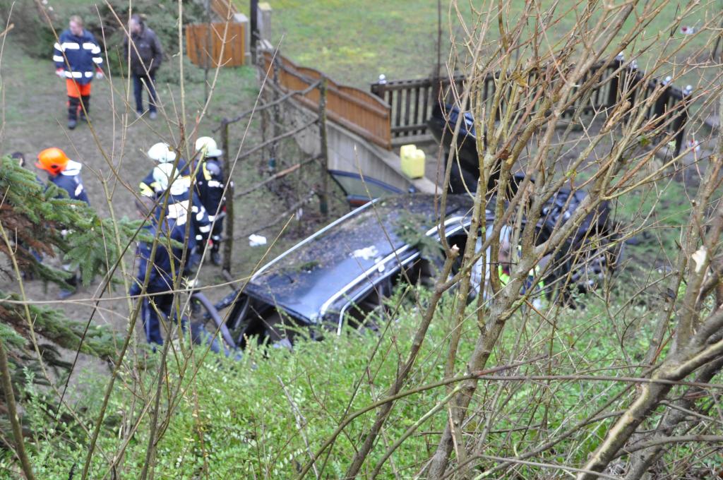 VOITSBERG, am 27.12.2013 Ein PKW-Lenker geriet mit seinem PKW auf der Gemeindestraße im Freisinggraben rechts gegen eine Bordsteinkante, verriß sein Fahrzeug nach links und stürzte sich überschlagend über eine 5 Meter hohe Böschung. Das schwerst beschädigte Fahrzeug kam am Dach zu liegen. Beide Insassen wurden aus dem PKW geschleudert. Die mitfahrende Person wurde unter dem Fahrzeug eingeklemmt und von Passanten geborgen. Der anwesende Arzt konnte nur mehr den Tod des Beifahrers feststellen. Der Fahrer wurde mit Verletzungen unbestimmten Grades vom Roten Kreuz Voitsberg ins LKH Voitsberg eingeliefert. Die zuständige Ortsfeuerwehr Afling alarmierte zwecks Bergung des Fahrzeuges über die LLZ das WLF Voitsberg. Die darauffolgende Bergung wurde in Zusammenarbeit mit der FF Afling durchgeführt. Das Fahrzeug wurde zum Rüsthaus Voitsberg überstellt.