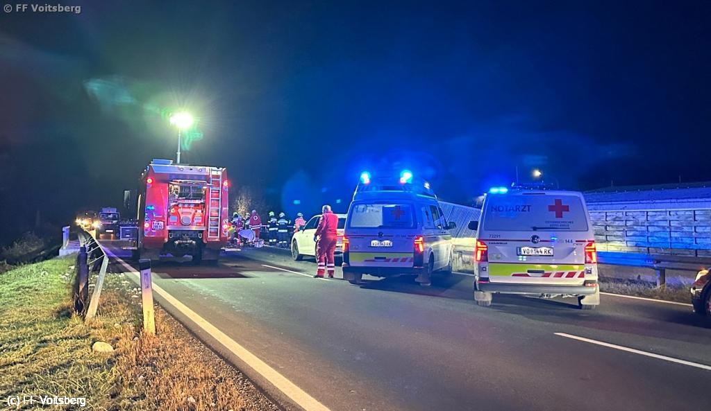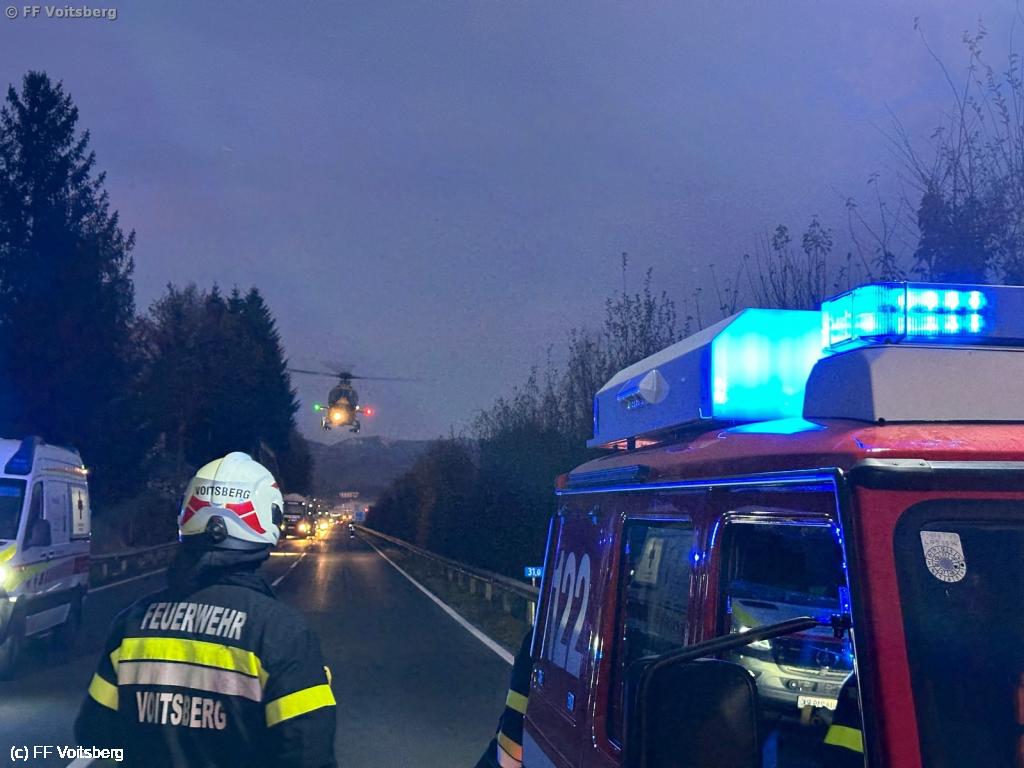 VOITSBERG, am 25.11.2024 Am Morgen des 25.11.2024 kam es um kurz nach 6 Uhr zu einem schweren Verkehrsunfall auf der B70 Umfahrung Voitsberg. Im Bereich zwischen der Tankstelle und dem Umfahrungstunnel waren zwei Fahrzeuge aus bisher ungeklärter Ursache frontal zusammengestoßen, so dass eine Person im Fahrzeug eingeschlossen und unbestimmten Grades verletzt wurde.