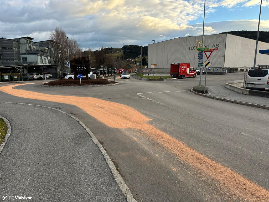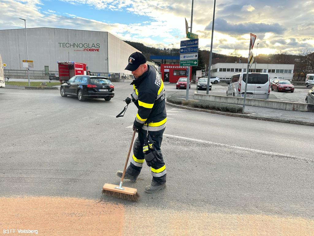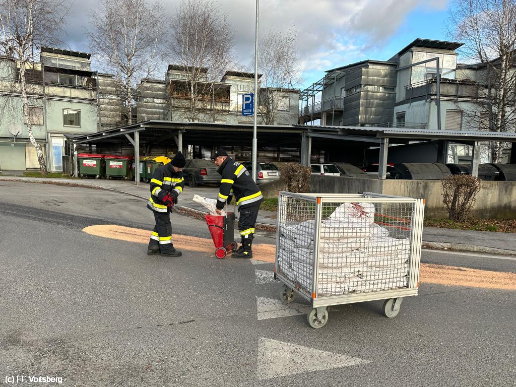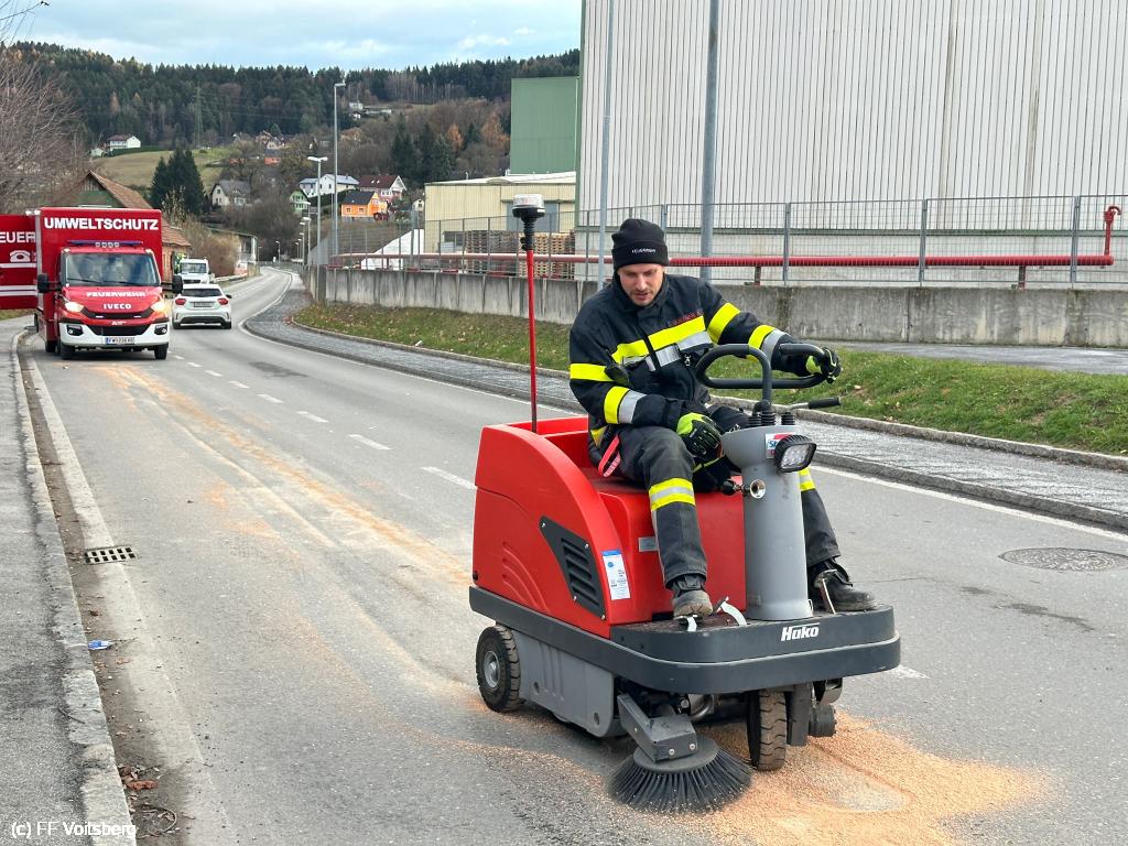 Ca. 150m lange Ölspur mit Bindemittel gebunden, mit feuerwehreigenen Kehrmaschine aufgesaugt und fachgerecht entsorgt.