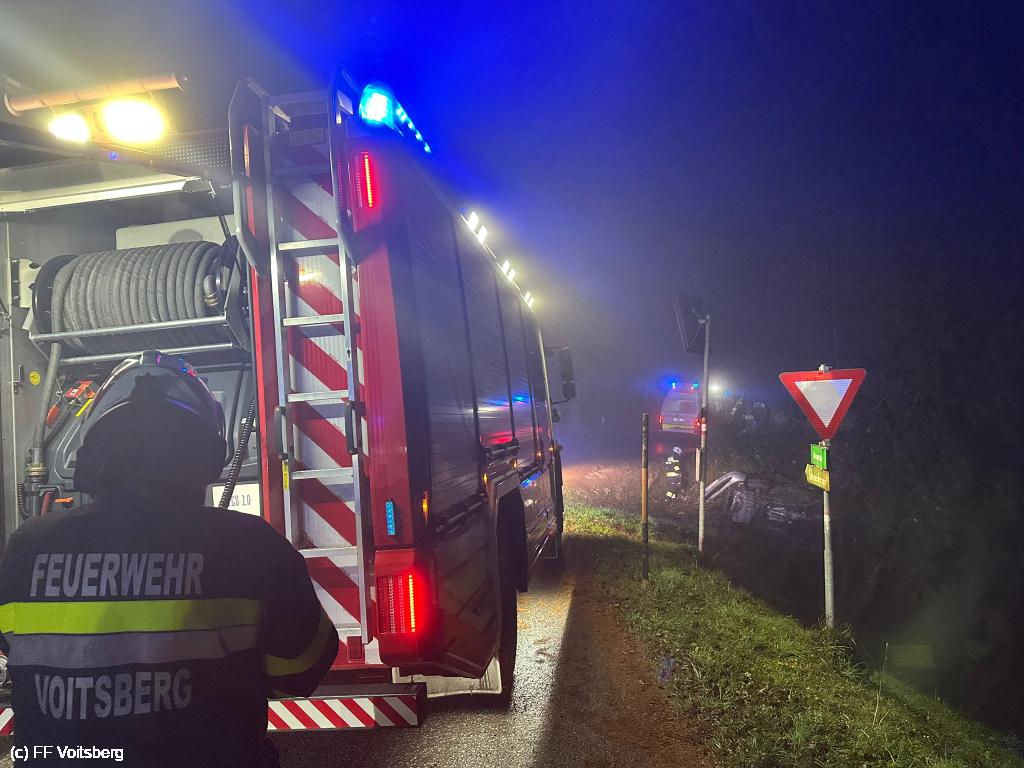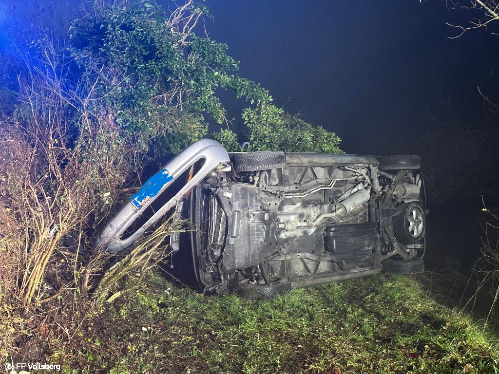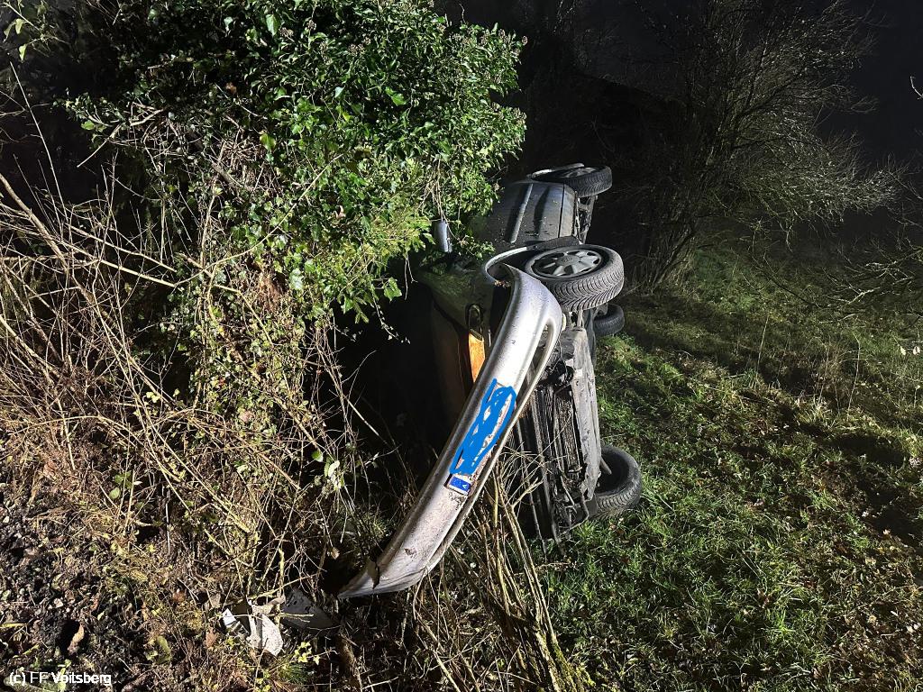 VOITSBERG, am 12.12.2024 Ein Fahrzeuglenker kam auf der Lobmingbergstraße mit seinem PKW aus ungeklärter Ursache von der Fahrbahn ab und stürzte über eine Böschung. Der PKW blieb in Seitenlage liegen und drohte umzustürzen. Der alarmierte Bereitschaftszug sicherte das Fahrzeug und führte anschließend die Bergung des Unfallwracks durch.