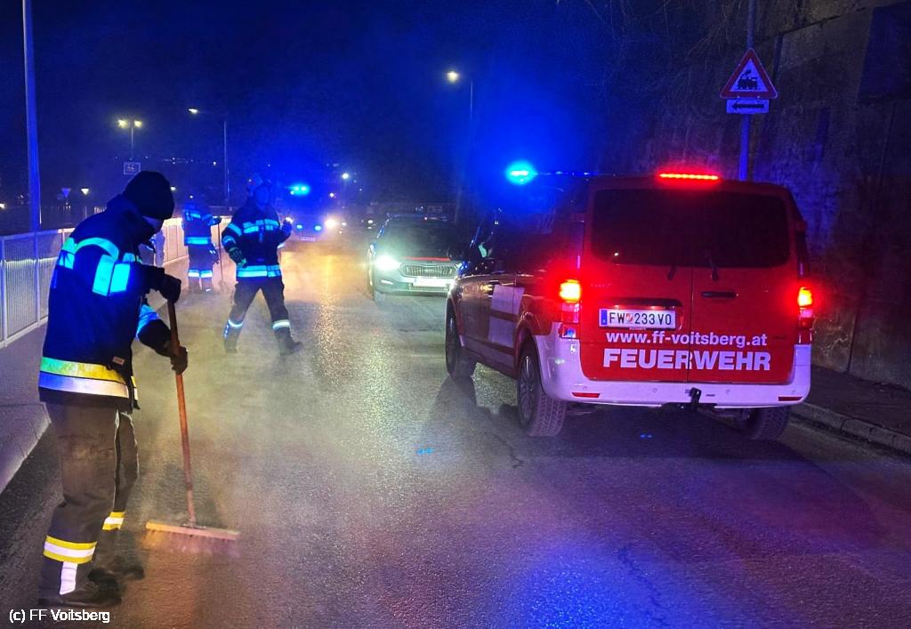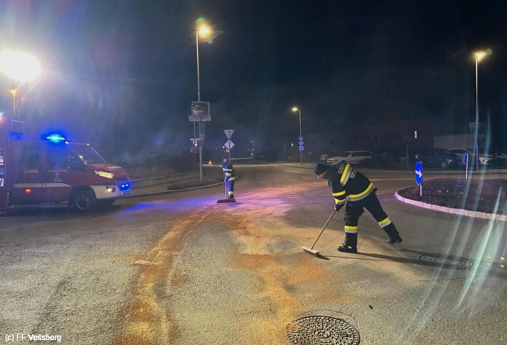 VOITSBERG, am 04.01.2025 Der Bereitschaftszug 3 der FF Voitsberg wurde zum Binden einer Ölspur durch das Voitsberger Stadtgebiet alarmiert. Nachdem auch in den Löschbereichen Bärnbach und Krems Verunreinigungen auf Landes- und Gemeindestraßen festzustellen waren, wurden diese Feuerwehren als Unterstützung angefordert.