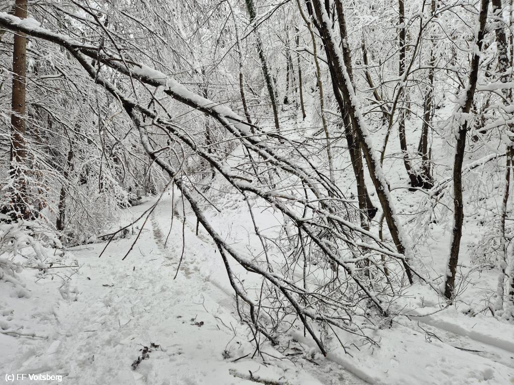 VOITSBERG, am 25.12.2025 Am heutigen Christtag beschäftigten uns mehrere umgestürzte Bäume im Ortstteil Tregist. Ein Wohnhaus "Am Alststeig" war von der Außenwelt abgeschnitten und konnte nur über einen längeren Fußmarsch erreicht werden.