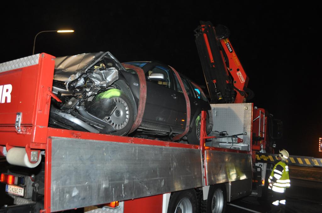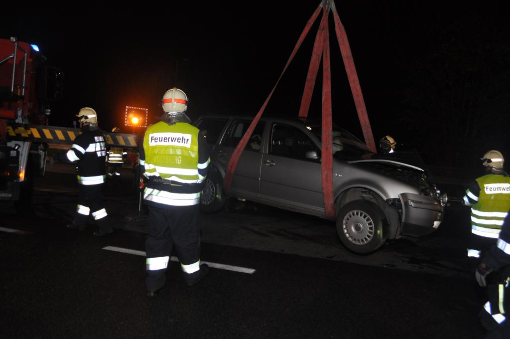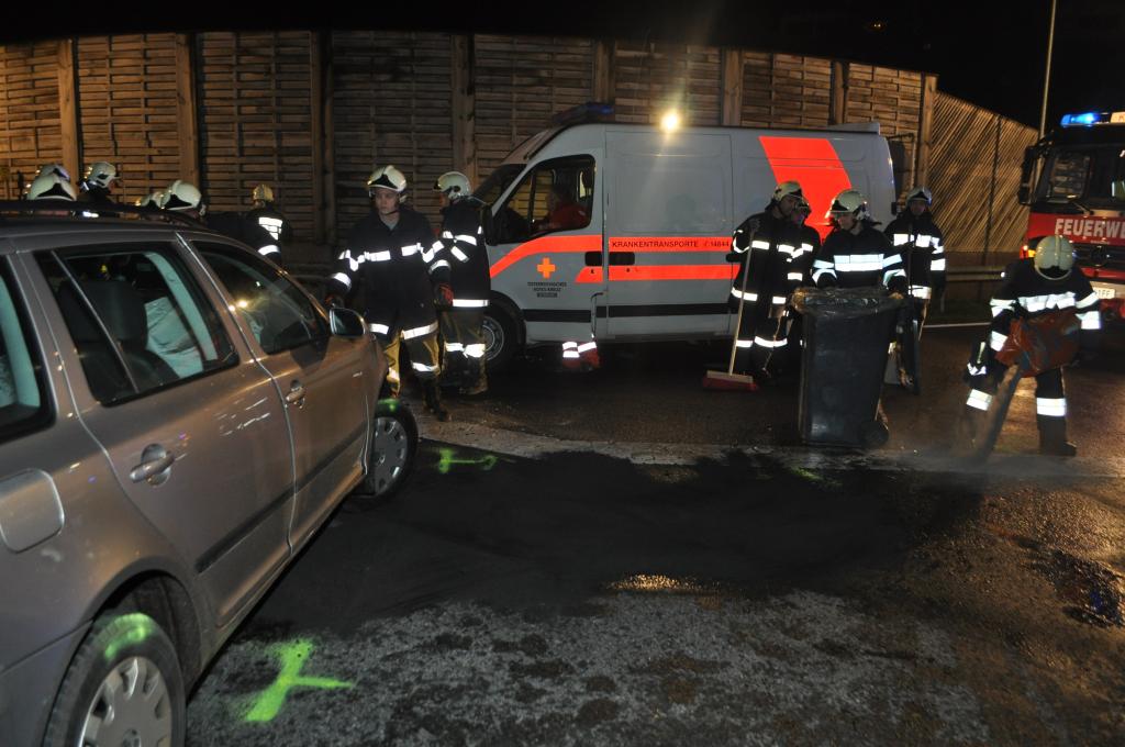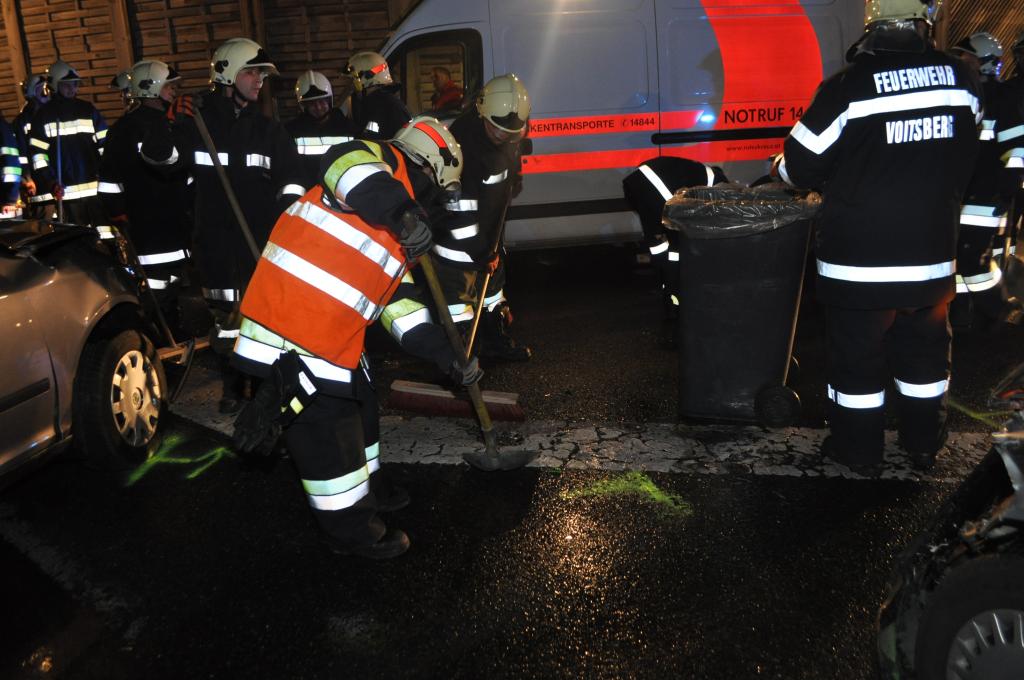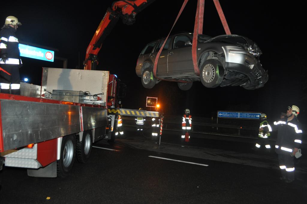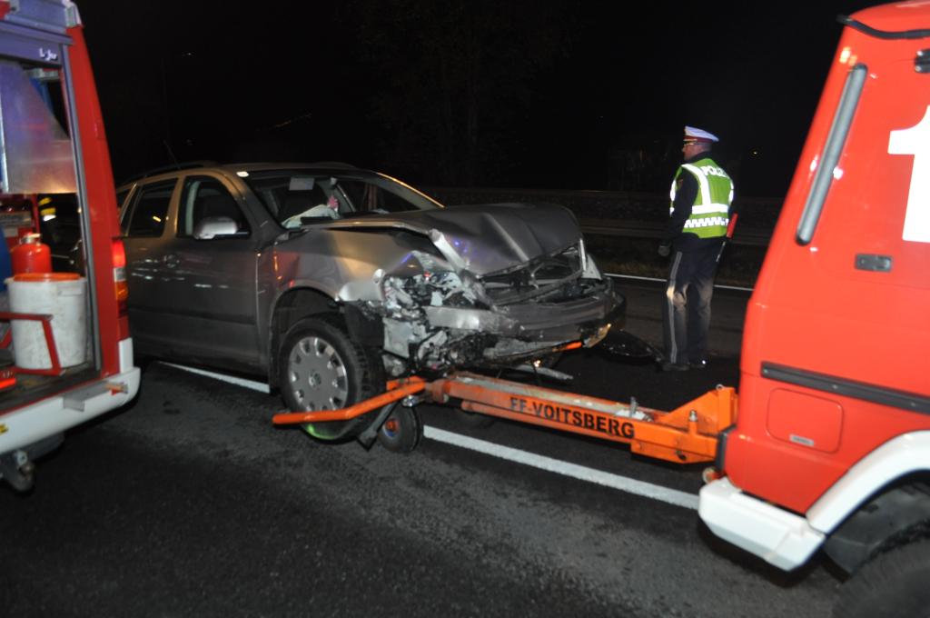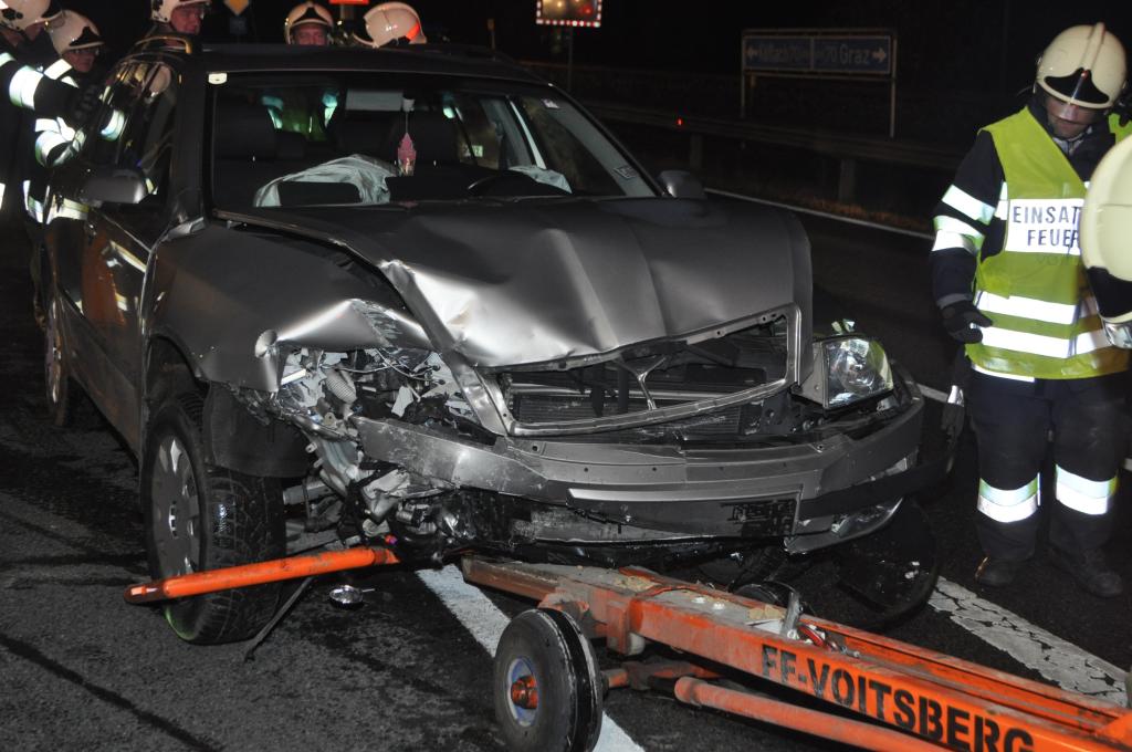 VOITSBERG, am 05.11.2013 Ein aus Richtung Graz kommender PKW reihte sich zum Abbiegen Richtung Abfahrt Voitsberg-Mitte auf dem Fahrstreifen ein und ignorierte den Vorrang des in Richtung Graz fahrenden PKW und stieß mit diesem frontal zusammen. Die Lenkerin des aus Richtung Graz kommenden PKW wurde verletzt mit dem Roten Kreuz ins LKH Voitsberg eingeliefert. Die Feuerwehren Voitsberg und Krems bauten während der Versorgung der Patientin und der Bergung der Fahrzeuge einen Brandschutz auf. Ein PKW wurde mittels Abschleppachse der FF Voitsberg von der Unfallstelle entfernt. Der zweite PKW wurde mittels WLF Voitsberg zum Rüsthaus Voitsberg gebracht. Auslaufende Betriebsmittel wurden in Zusammenarbeit der Feuerwehren gebunden, die Straße gereinigt und dem Verkehr freigegeben. Die FF Rosental war als Reserve am Unfallort. Die B 70 war während der Bergungsarbeiten in Richtung Graz gesperrt. Die Verkehrsregelung und Unfallaufnahme wurde von der Polizei durchgeführt.