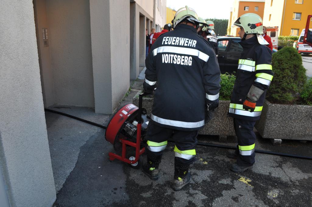VOITSBERG, am 02.10.2013 Die Feuerwehren Voitsberg und Krems wurden von Florian Steiermark laut Alarmplan zu einem Wohnungsbrand in einem Mehrfamilienhaus alarmiert. Bei Eintreffen stellte der Einsatzleiter fest, dass sich keine Personen in der qualmenden Wohnung befanden. Zwei Atemschutztrupps konnten den Wohnungsbrand mit geringem Wasseraufwand rasch unter Kontrolle bringen. Die sich im Haus befindlichen Personen wurden zwecks starker Rauchentwicklung aus dem Haus evakuiert. Mit zwei Druckbelüftern wurde das Stiegenhaus und die Wohnung rauchfrei gemacht. Abschließend wurden noch die ausgebrannten Einrichtungsgegenstände aus der Wohnung entfernt. Die Polizeiinspektion Voitsberg führt die Brandermittlung durch und das Rote Kreuz Voitsberg war am Einsatzort als Reserve anwesend.