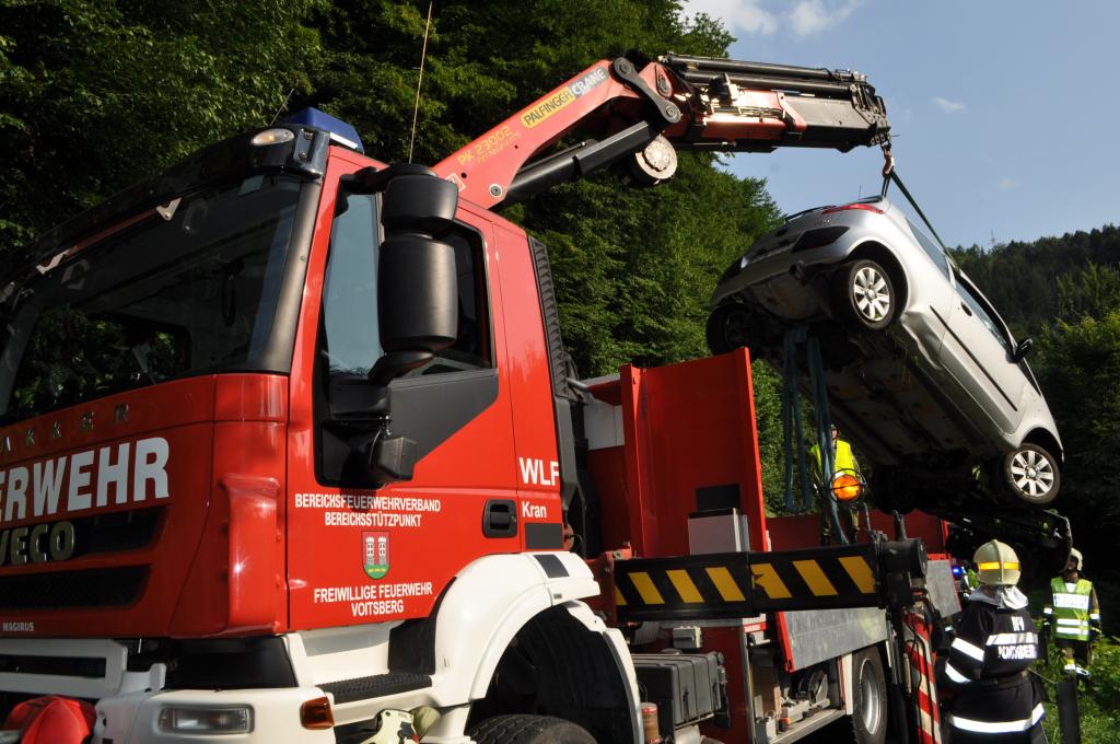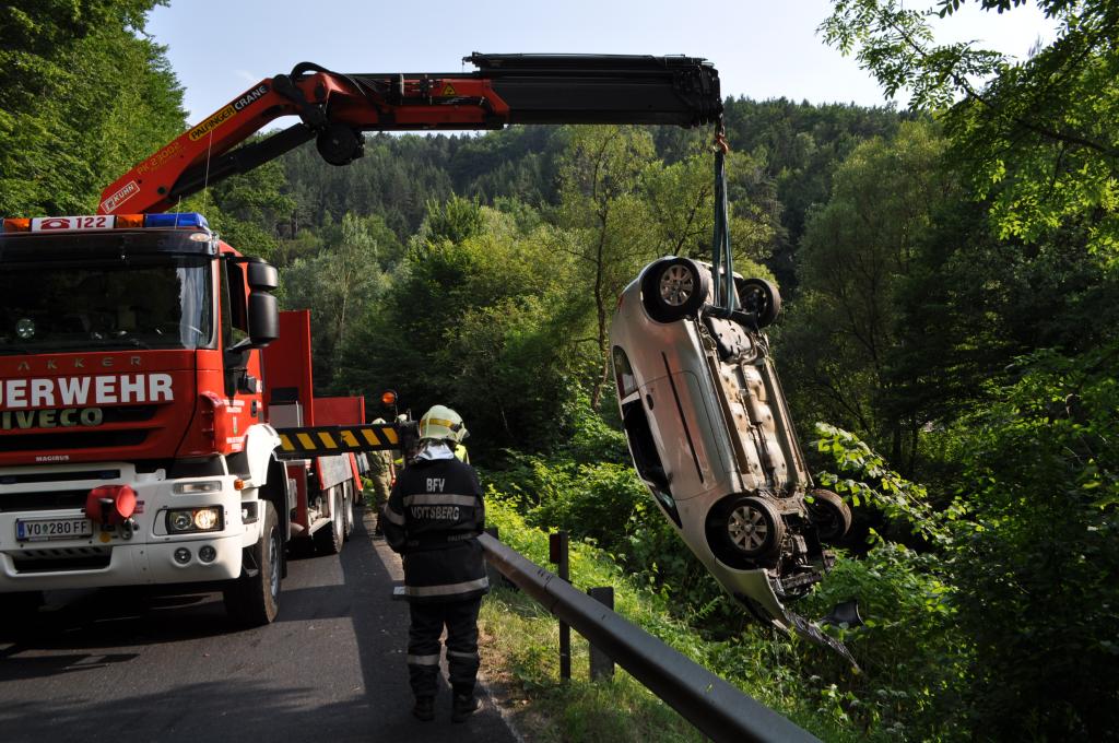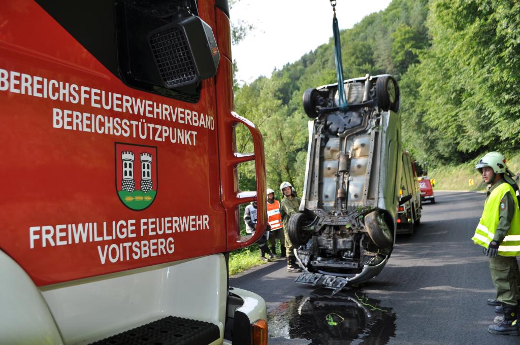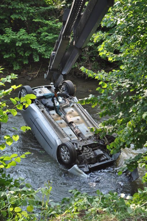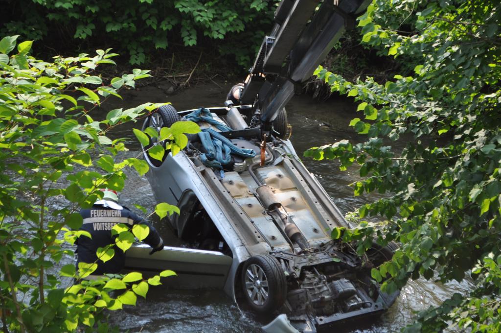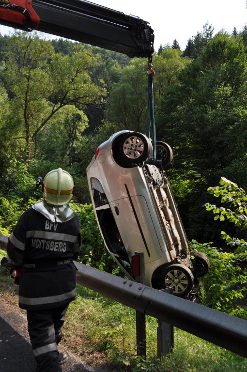 VOITSBERG, am 13.07.2013 Aus ungeklärter Ursache geriet ein PKW auf der B 70 in den Kremser Reihen ins Schleudern, geriet auf das Bankett, schlitterte entlang der Leitschiene und stürzte sich überschlagend in die Kainach, welche zum Glück Niederwasser führte, und landete dort am Dach liegend. Die unbestimmten Grades verletzte Fahrzeuglenkerin wurde in Zusammenarbeit der Feuerwehren Gaisfeld, Krems und Voitsberg sowie des Roten Kreuzes Voitsberg geborgen und von der Rettung ins LKH Voitsberg eingeliefert. Die darauffolgende Bergung und den drauffolgenden Abtransport führte die FF Voitsberg mit dem WLF durch. Die Verkehrsregelung und Vermessung wurde durch die Polizeiinspektion Voitsberg durchgeführt.