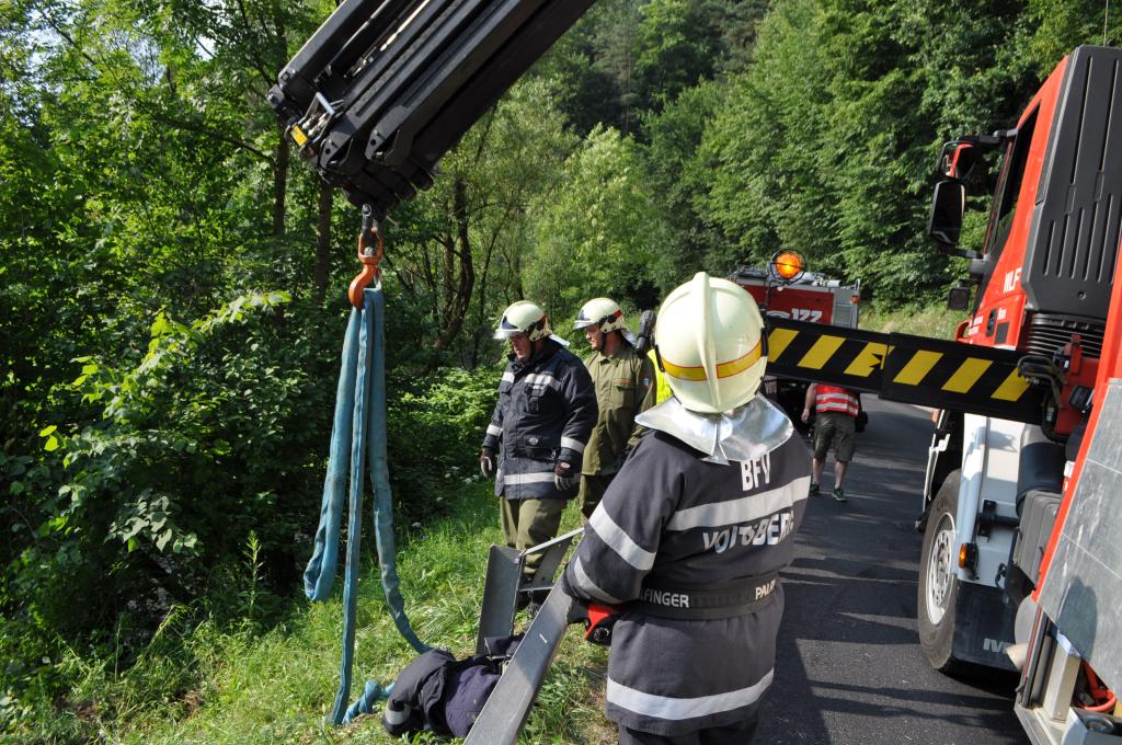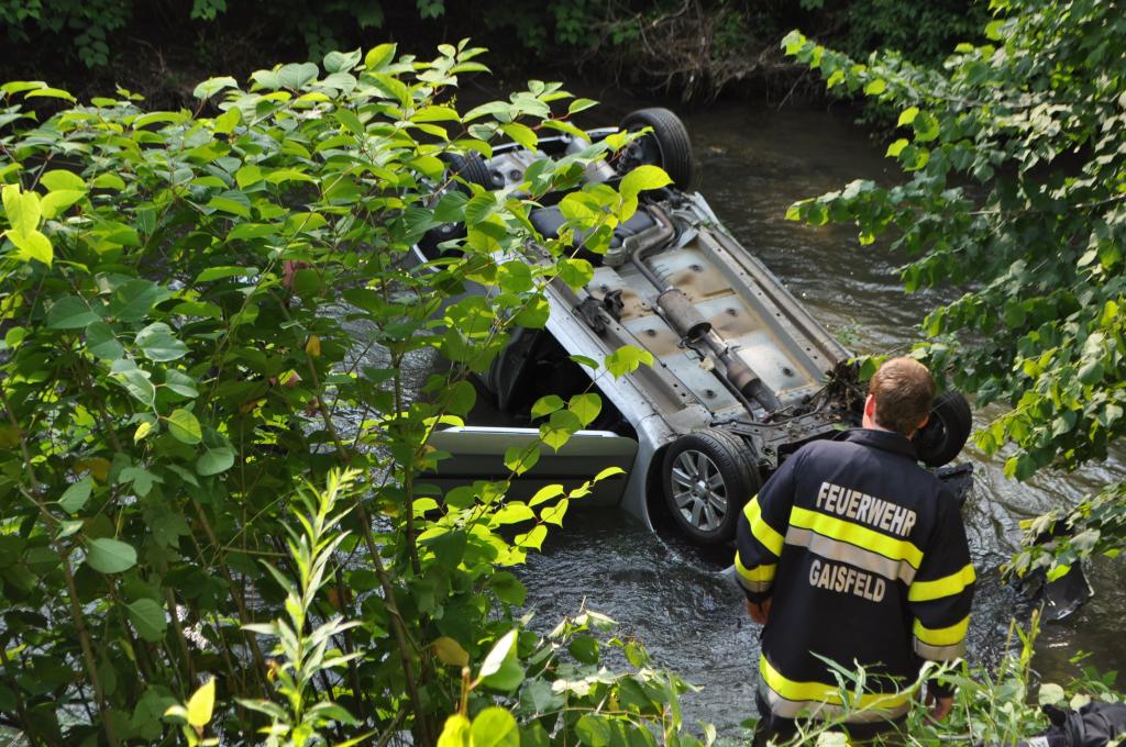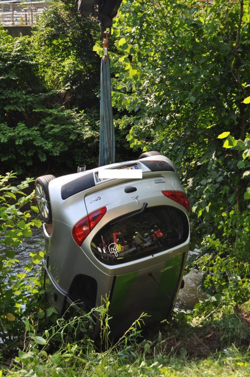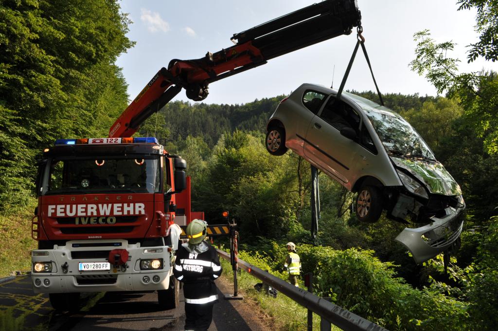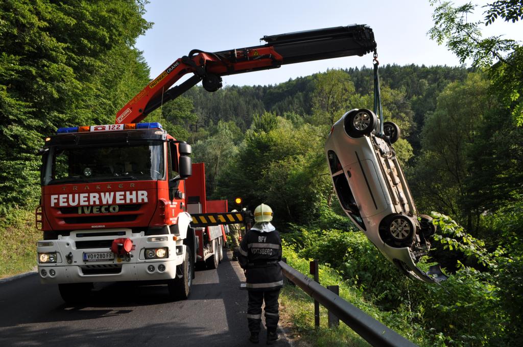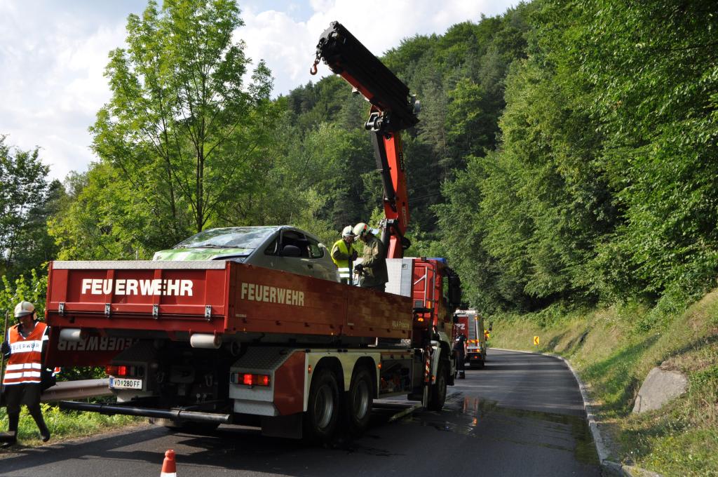 VOITSBERG, am 13.07.2013 Aus ungeklärter Ursache geriet ein PKW auf der B 70 in den Kremser Reihen ins Schleudern, geriet auf das Bankett, schlitterte entlang der Leitschiene und stürzte sich überschlagend in die Kainach, welche zum Glück Niederwasser führte, und landete dort am Dach liegend. Die unbestimmten Grades verletzte Fahrzeuglenkerin wurde in Zusammenarbeit der Feuerwehren Gaisfeld, Krems und Voitsberg sowie des Roten Kreuzes Voitsberg geborgen und von der Rettung ins LKH Voitsberg eingeliefert. Die darauffolgende Bergung und den drauffolgenden Abtransport führte die FF Voitsberg mit dem WLF durch. Die Verkehrsregelung und Vermessung wurde durch die Polizeiinspektion Voitsberg durchgeführt.