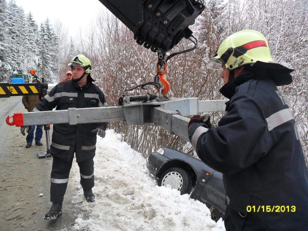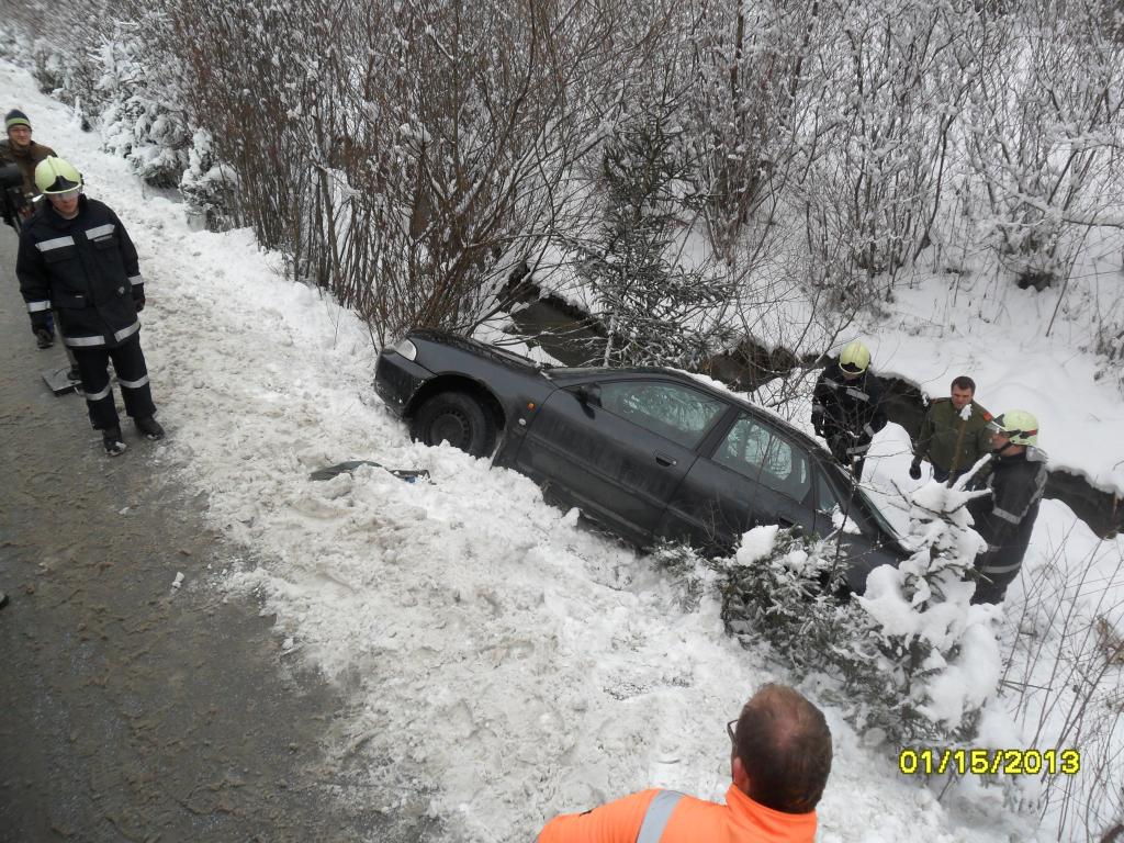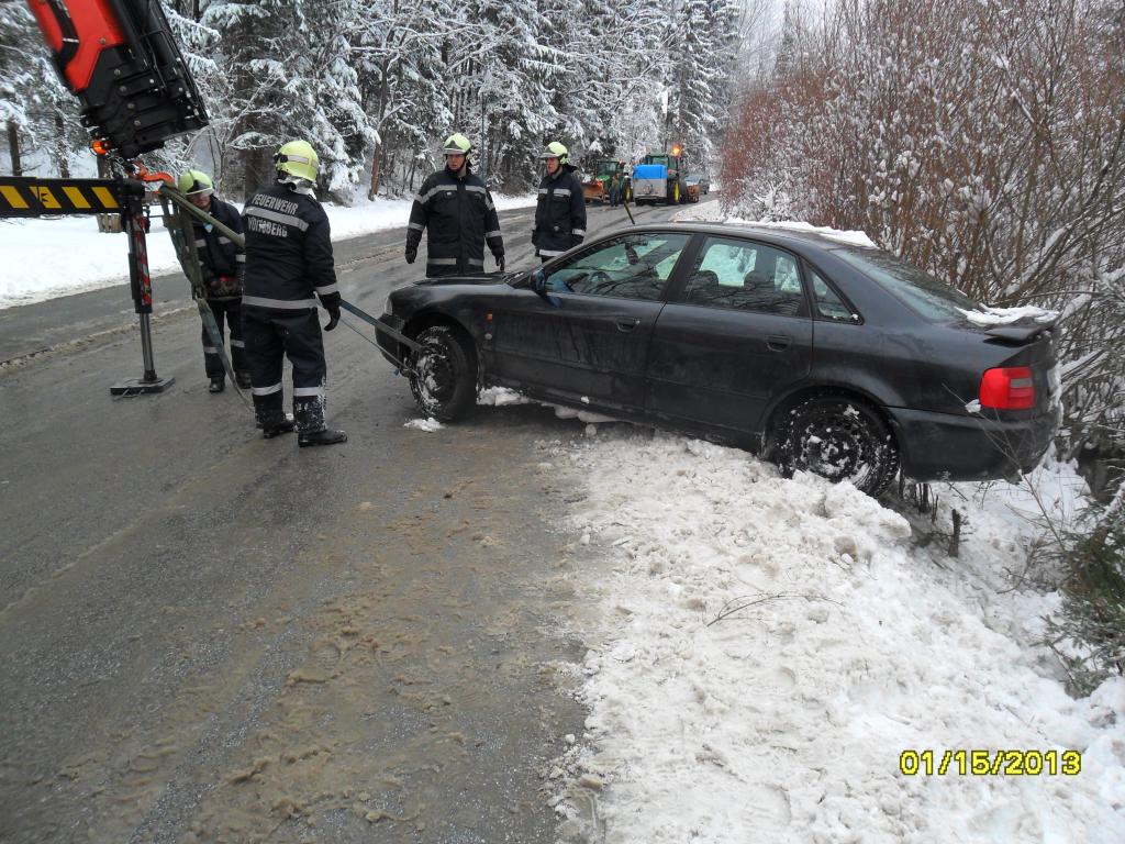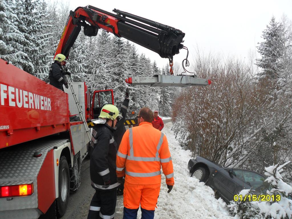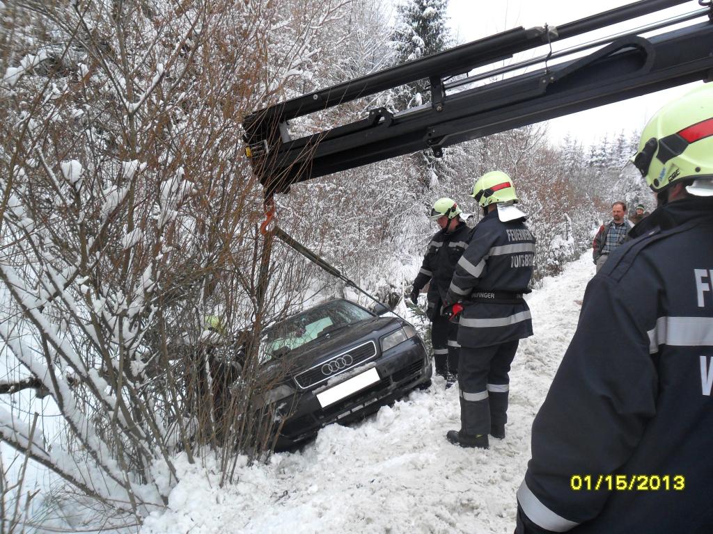 VOITSBERG, am 15.01.2013 Ein PKW geriet von der Straße ab und kam in einem ca. 4 m tiefen Graben zu stehen. Die FF Rosental forderte WLF Voitsberg für die Bergung an. Gemeinsam wurde das Fahrzeug mit dem Kran geborgen und die Lenkerin setzte die Fahrt auf eigener Achse fort.