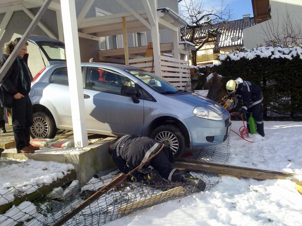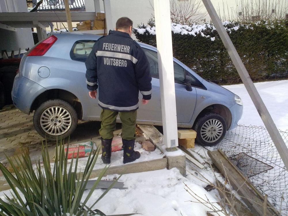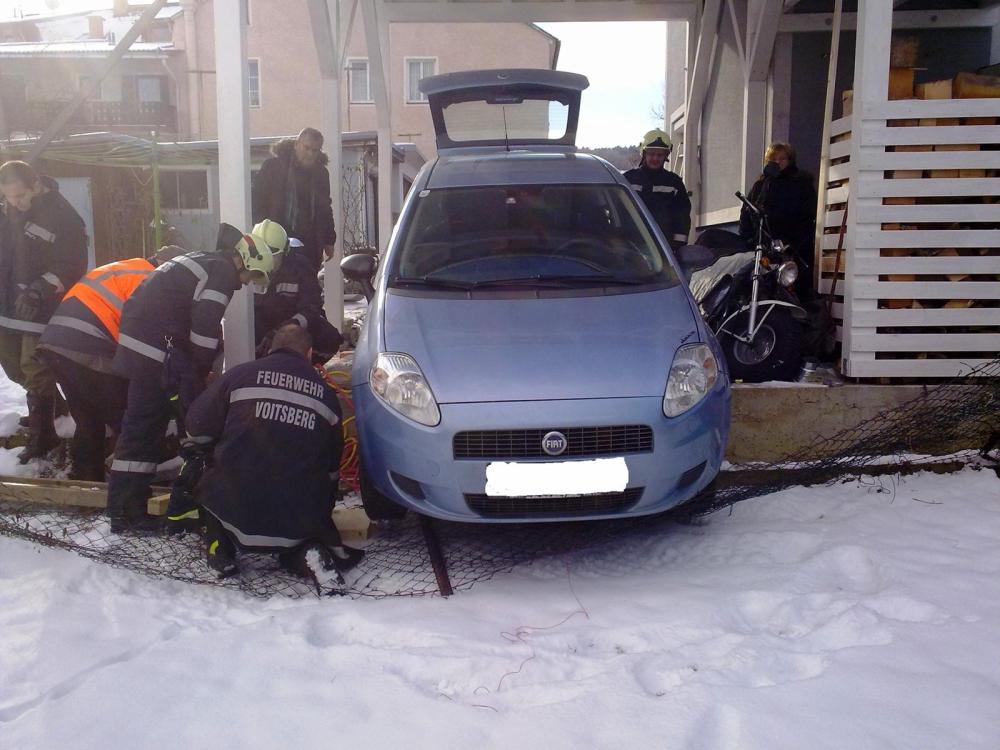 VOITSBERG, am 14.12.2012 Aus ungeklärter Ursache geriet ein PKW auf einem Abstellplatz mit der Vorderachse über einen Absatz. Bergung unter Einsatz des Druckluft-Hebekissens und Pölzmaterial.