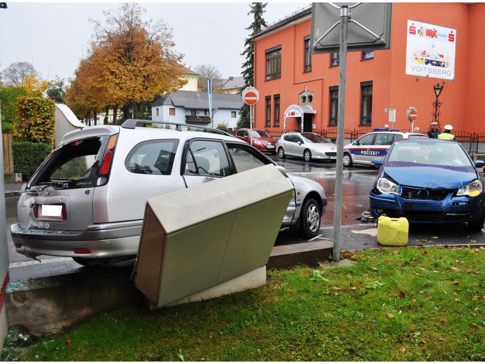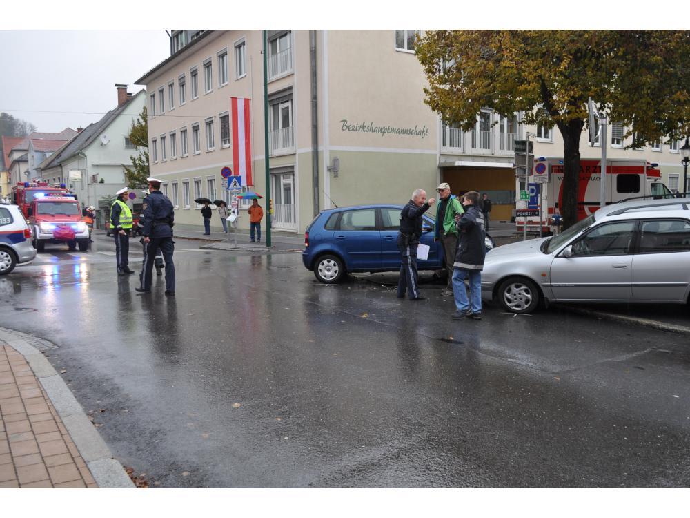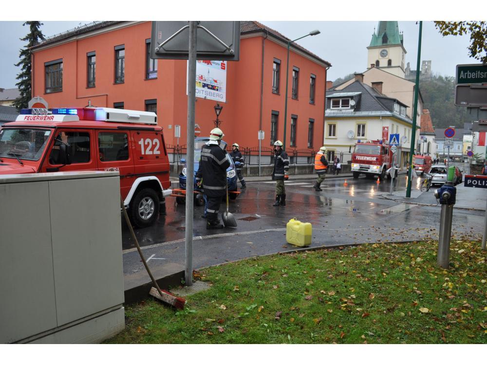VOITSBERG, am 27.10.2012 Nach einem Zusammenstoß zweier PKW im Bereich der BH Voitsberg wurde die FF Voitsberg zur Verkehrshindernisbeseitung und Fahrbahnreinigung durch die LLZ Steiermark alarmiert. Aufgaben waren der Aufbau des Brandschutzes, Unterstützung der Polizei, Aufbringen von Ölbindemittel und Abtransport der Fahrzeuge zum Rüsthaus Voitsberg. Die verletzten Personen wurden vom Roten Kreuz Voitsberg versorgt und ins LKH Voitsberg eingeliefert.