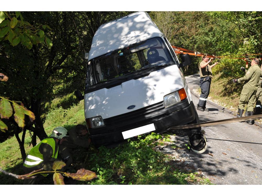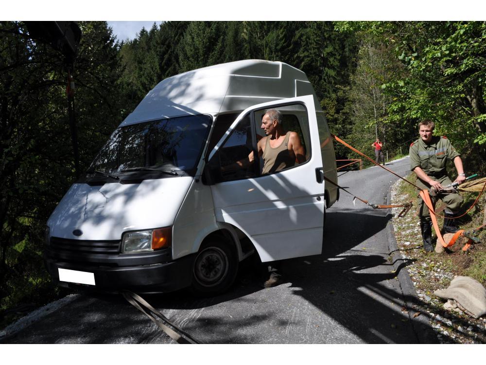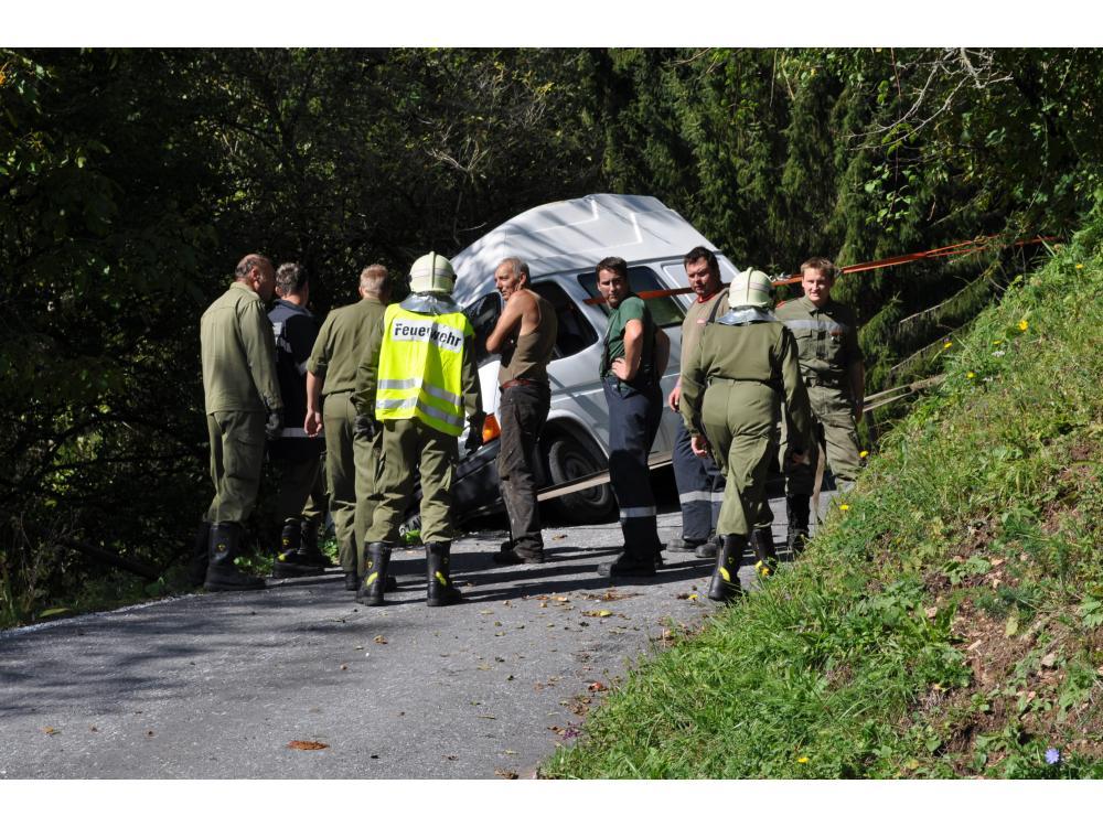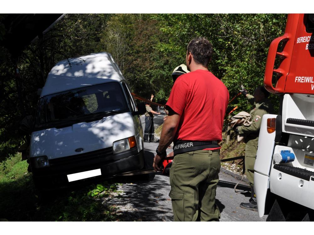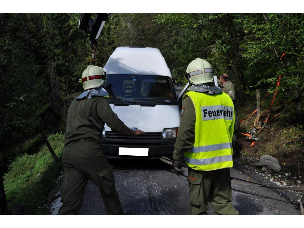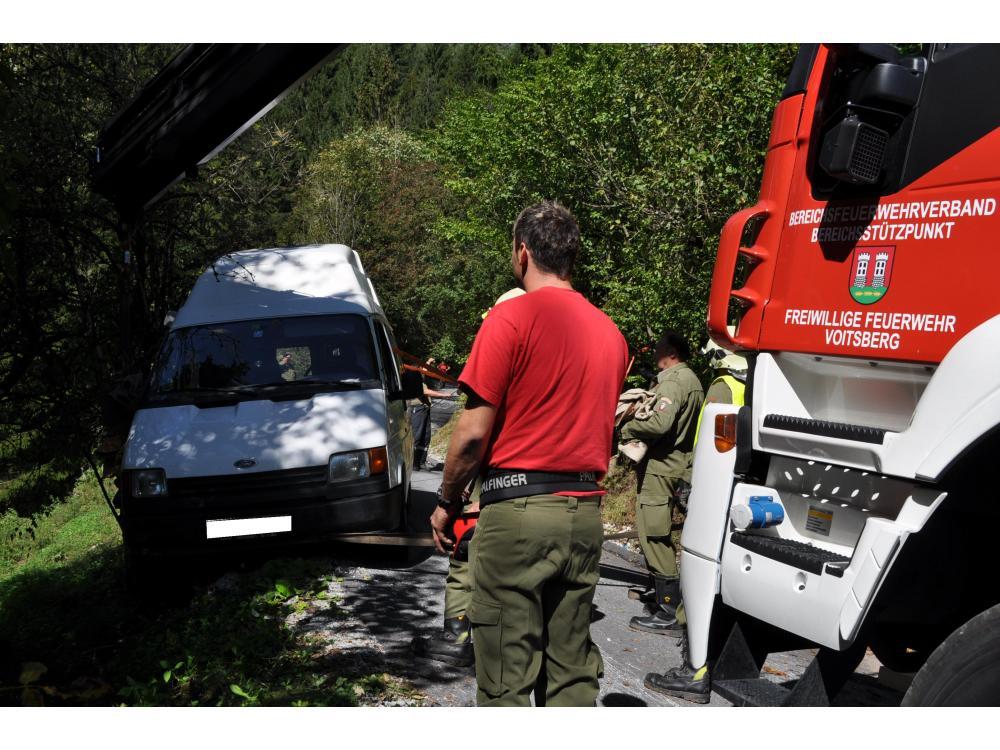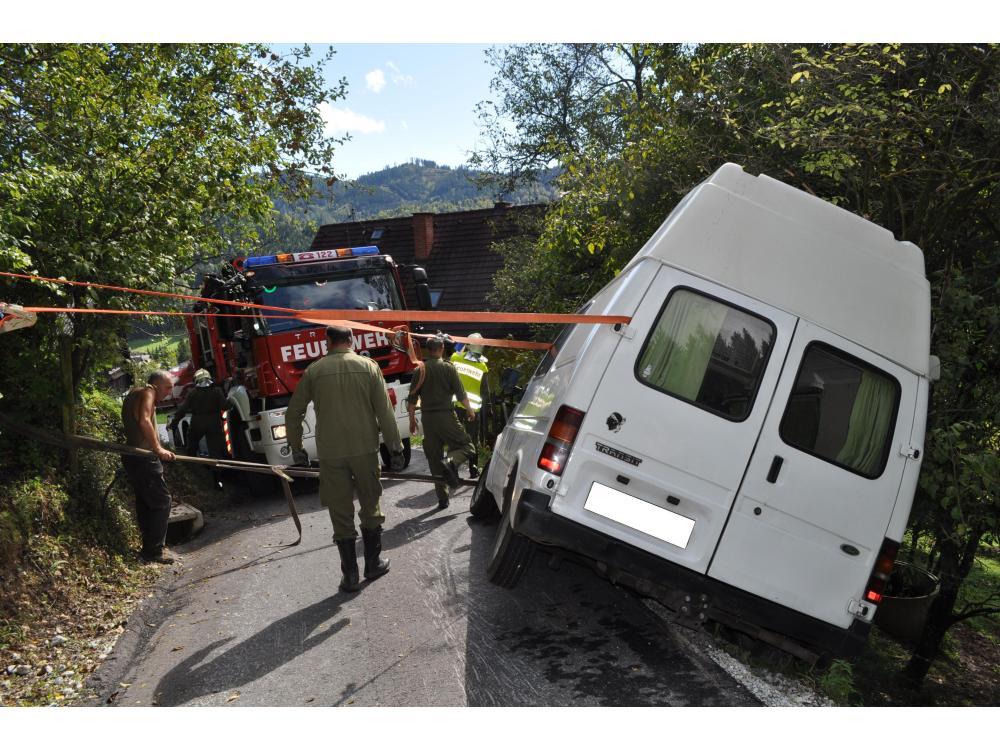 VOITSBERG, am 25.09.2012 Aus ungeklärter Ursache geriet ein Kleinbus auf das Bankett einer Privatstraße und rutschte seitlich gegen einen Strauch, blieb dort hängen und drohte umzustürzen. Die alarmierte FF Kainach sicherte mit dem Fahrzeugbesitzer das Fahrzeug und alarmierte über die LLZ das WLF-Kran der Stadtfeuerwehr Voitsberg. In Zusammenarbeit beider Wehren gelang es mittels Kran und Hubzug, das Fahrzeug unbeschädigt auf die Straße zu stellen.