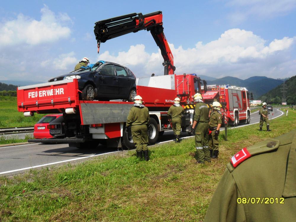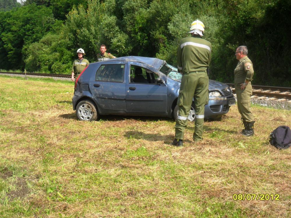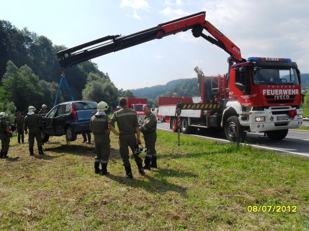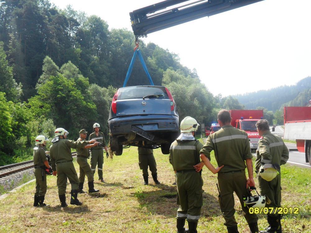 VOITSBERG, am 08.07.2012 Aus ungeklärter Ursache geriet ein PKW auf das Bankett der B 70 und stürzte sich überschlagend Richtung Bahngeleise und kam kurz davor zu stehen. Die Lenkerin konnte sich selbst befreien und wurde mit Verletzungen unbestimmten Grades ins LKH Voitsberg eingeliefert. Die Bergung des verunfallten PKW wurde mit dem WLF-Kran der FF Voitsberg durchgeführt.