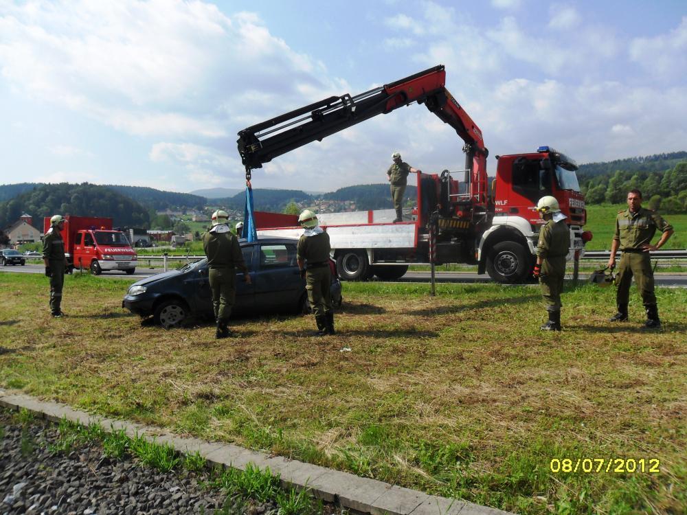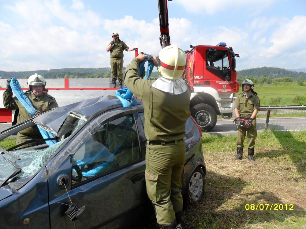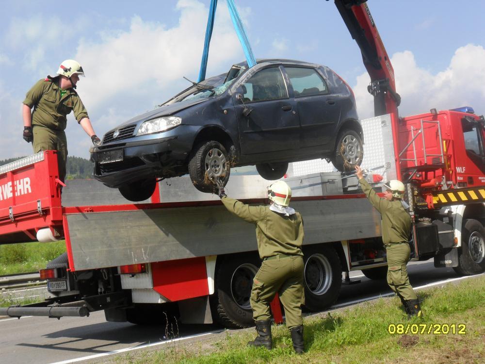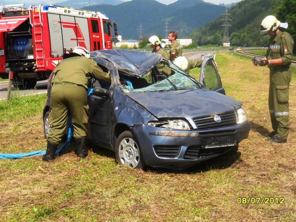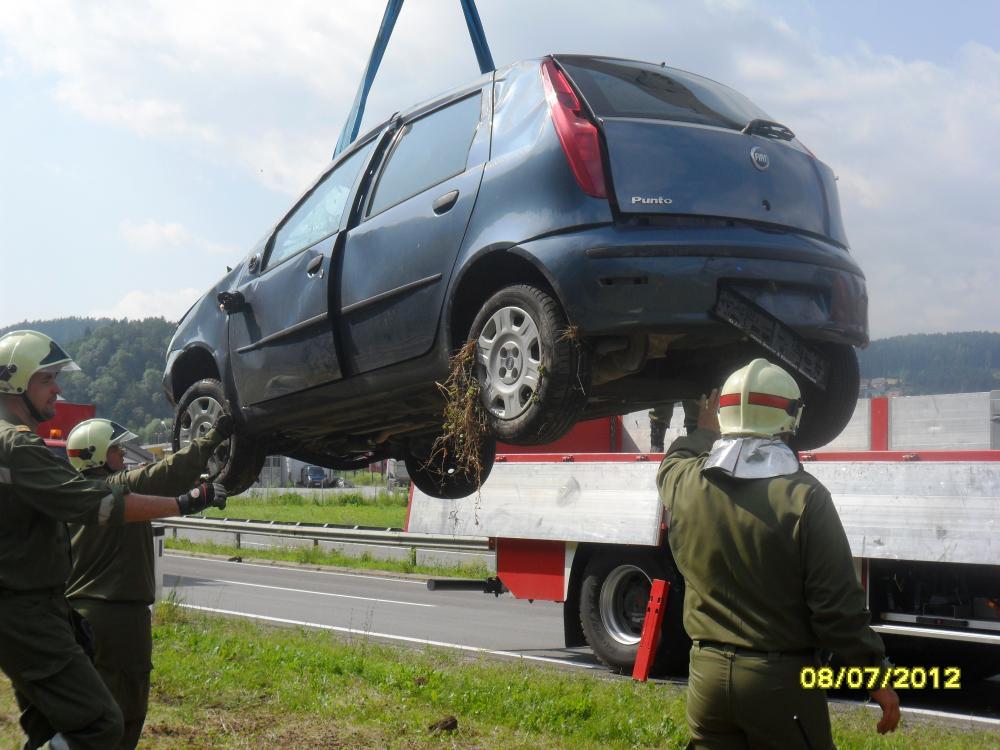 VOITSBERG, am 08.07.2012 Aus ungeklärter Ursache geriet ein PKW auf das Bankett der B 70 und stürzte sich überschlagend Richtung Bahngeleise und kam kurz davor zu stehen. Die Lenkerin konnte sich selbst befreien und wurde mit Verletzungen unbestimmten Grades ins LKH Voitsberg eingeliefert. Die Bergung des verunfallten PKW wurde mit dem WLF-Kran der FF Voitsberg durchgeführt.