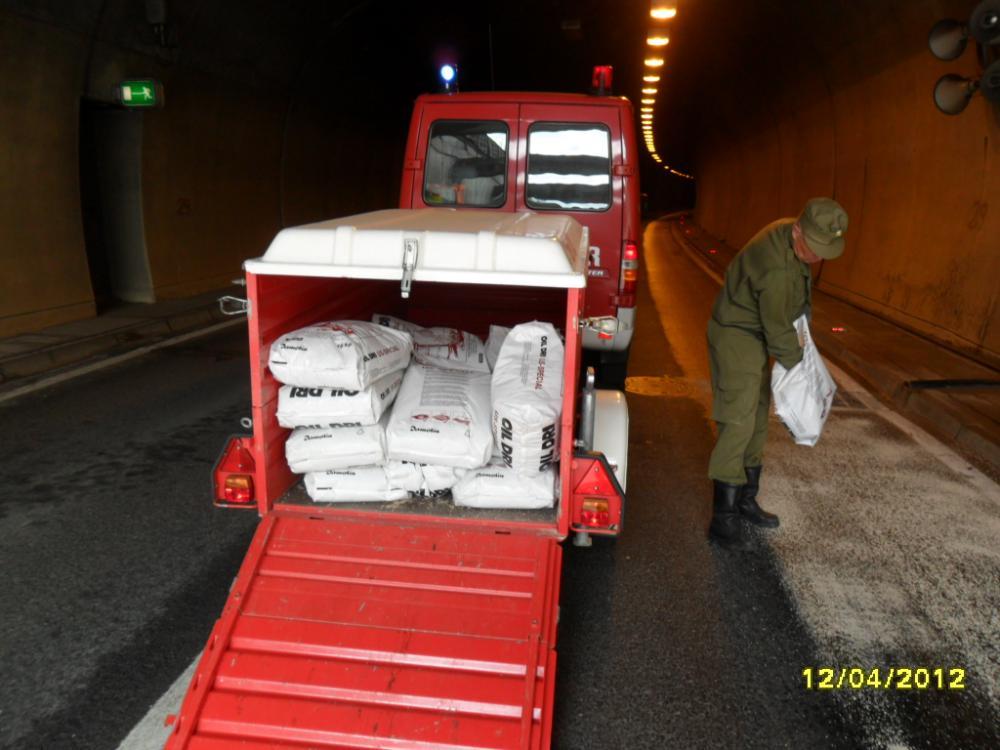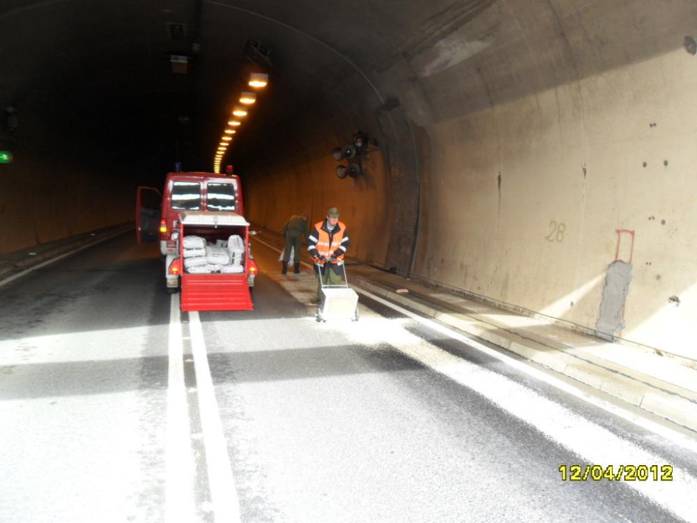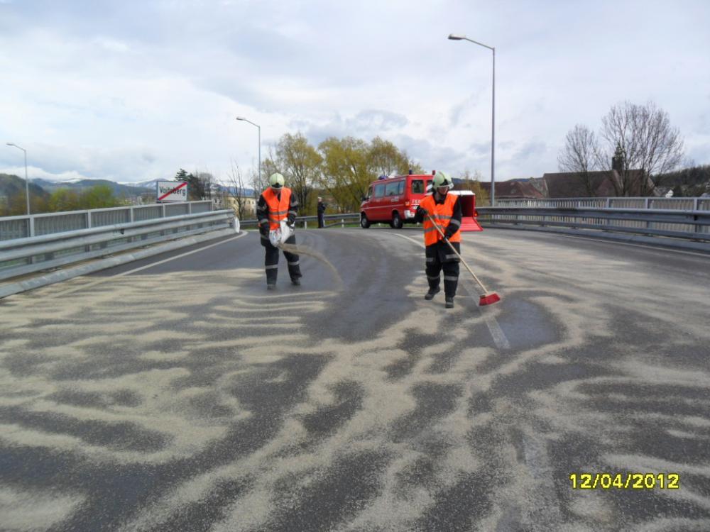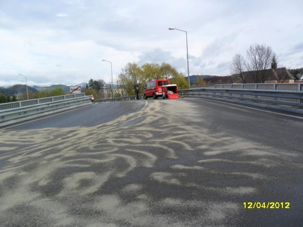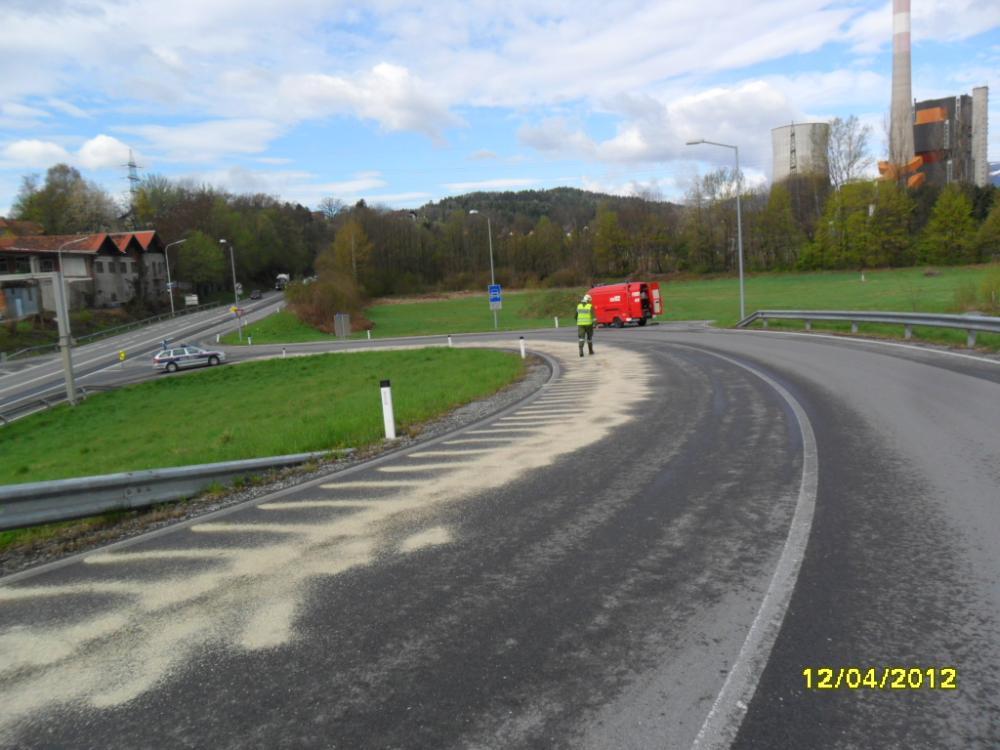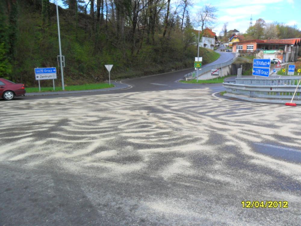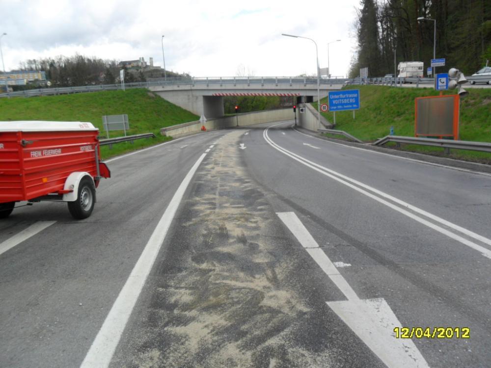 VOITSBERG, am 12.04.2012 Aufgrund eines technischen Gebrechens bei einem LKW gelangte Schmiermittel auf die Fahrbahn der B 70 im Bereich des Umfahrungstunnels, worauf die Umfahrungsstrasse Voitsberg ab der Auffahrt Greißenegg bis Krems für mehrere Stunden für den gesamten Verkehr gesperrt werden musste. Um das ausgelaufene Öl mit Bindemittel zu binden, mussten zur Verstärkung der Feuerwehr Voitsberg die Feuerwehren Krems und Rosental nachalarmiert werden. Auf der Umleitungsstrecke durch das Voitsberger Stadtgebiet kam es zu Verkehrsbehinderungen.